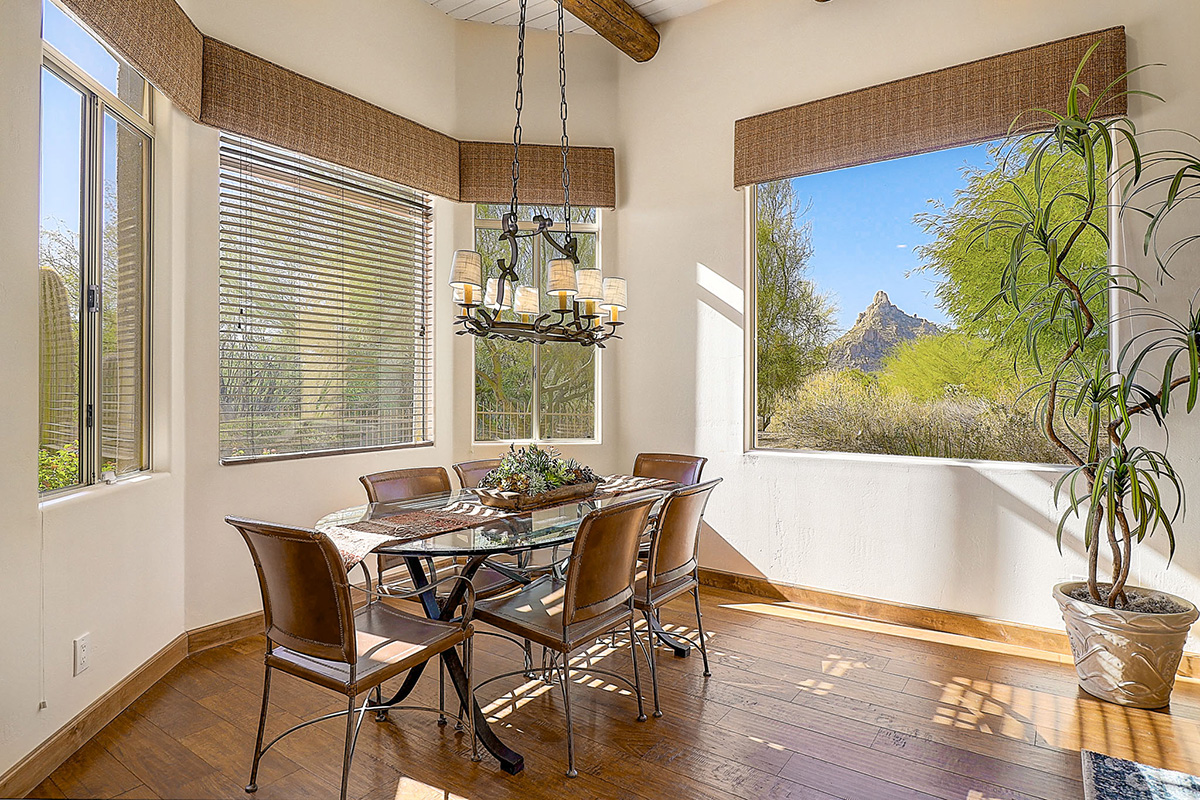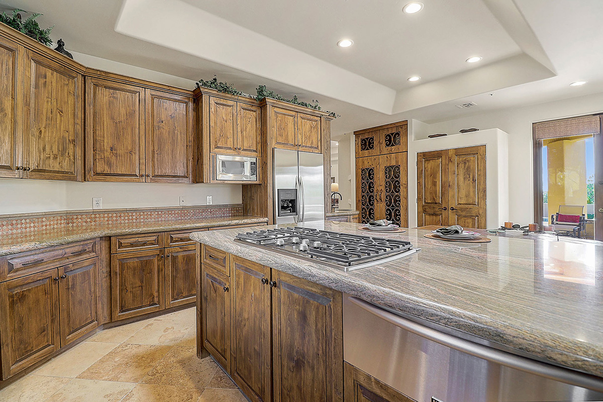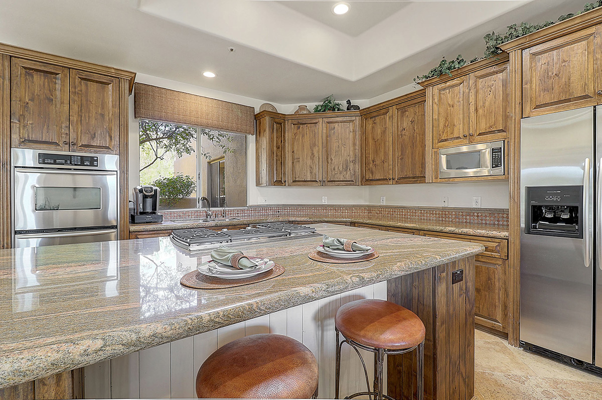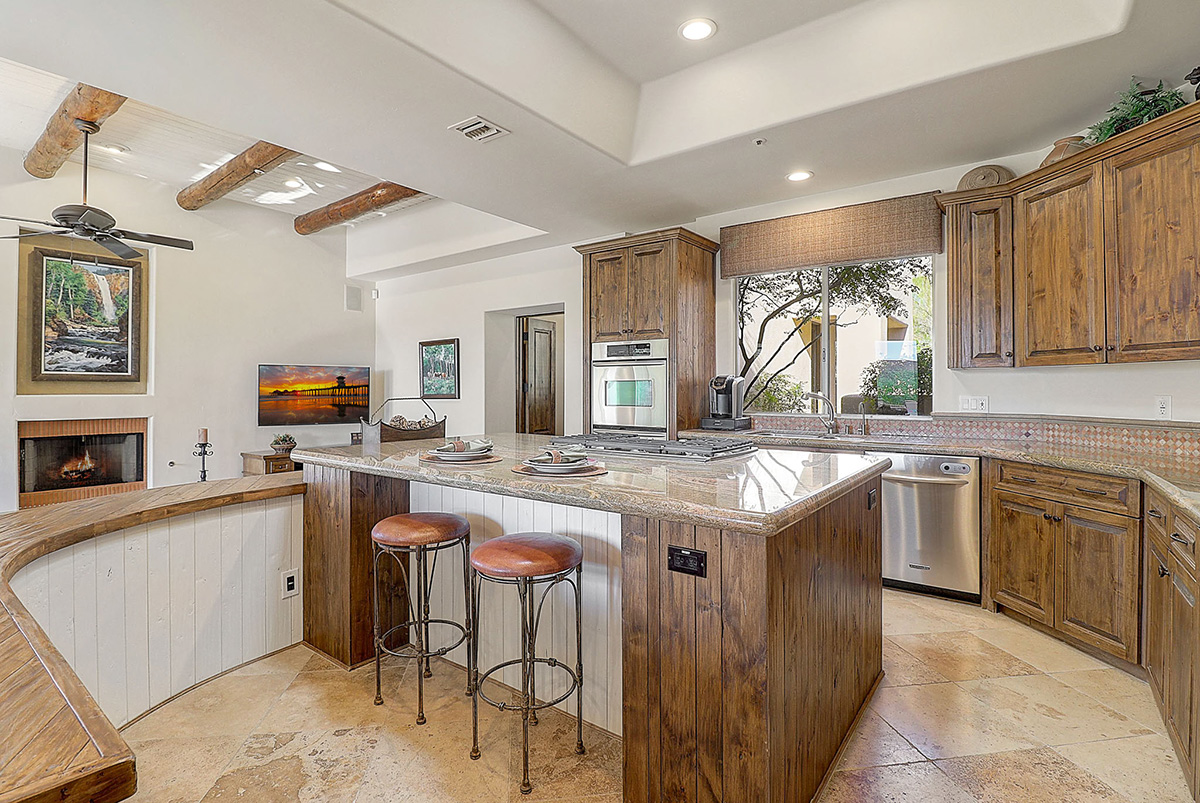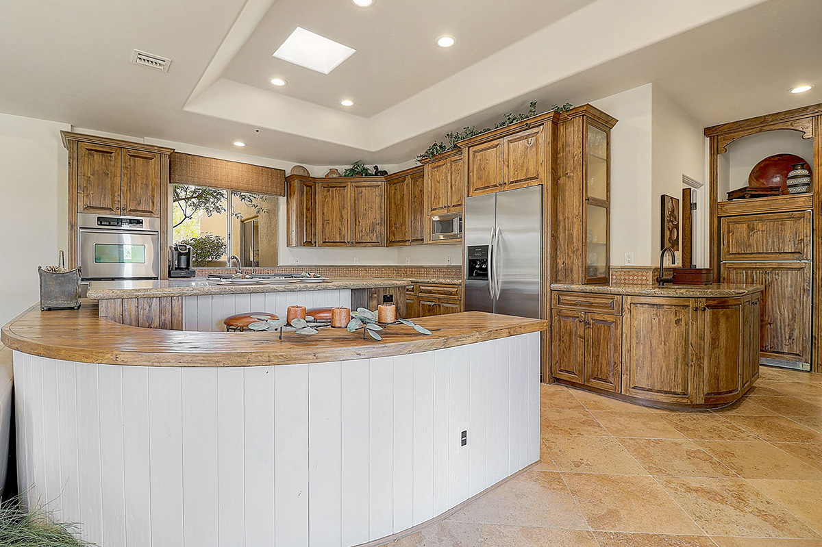 The kitchen features a temperature controlled wine fridge, wet bar, center island with curved peninsula, stainless steel appliances, two refrigerators, counter top seating and overlooks the dining and family rooms with views of Pinnacle Peak and the backyard.