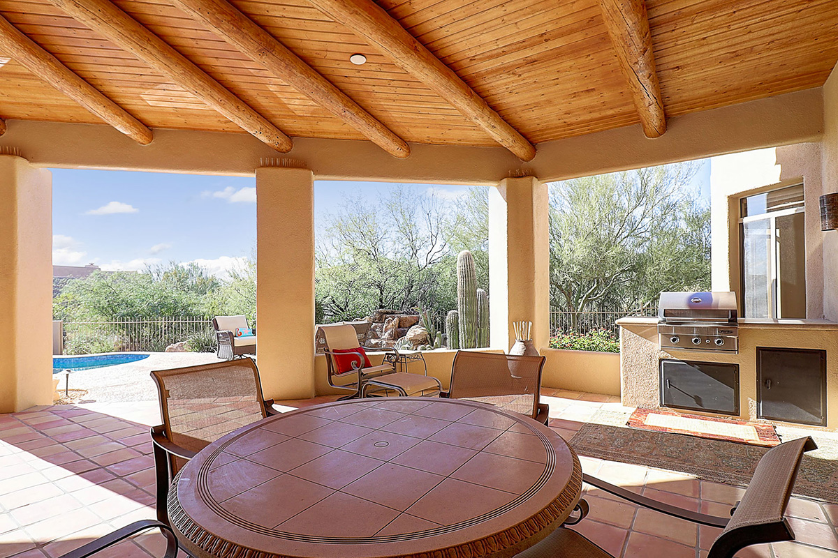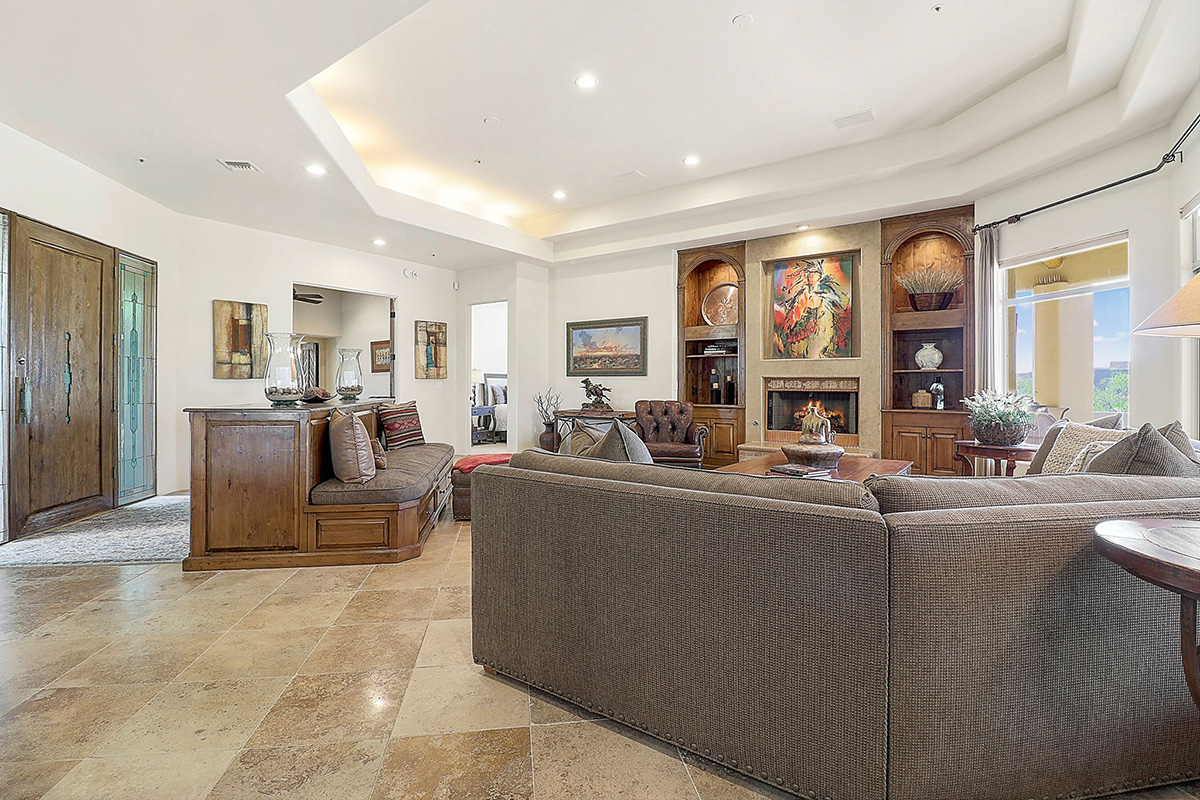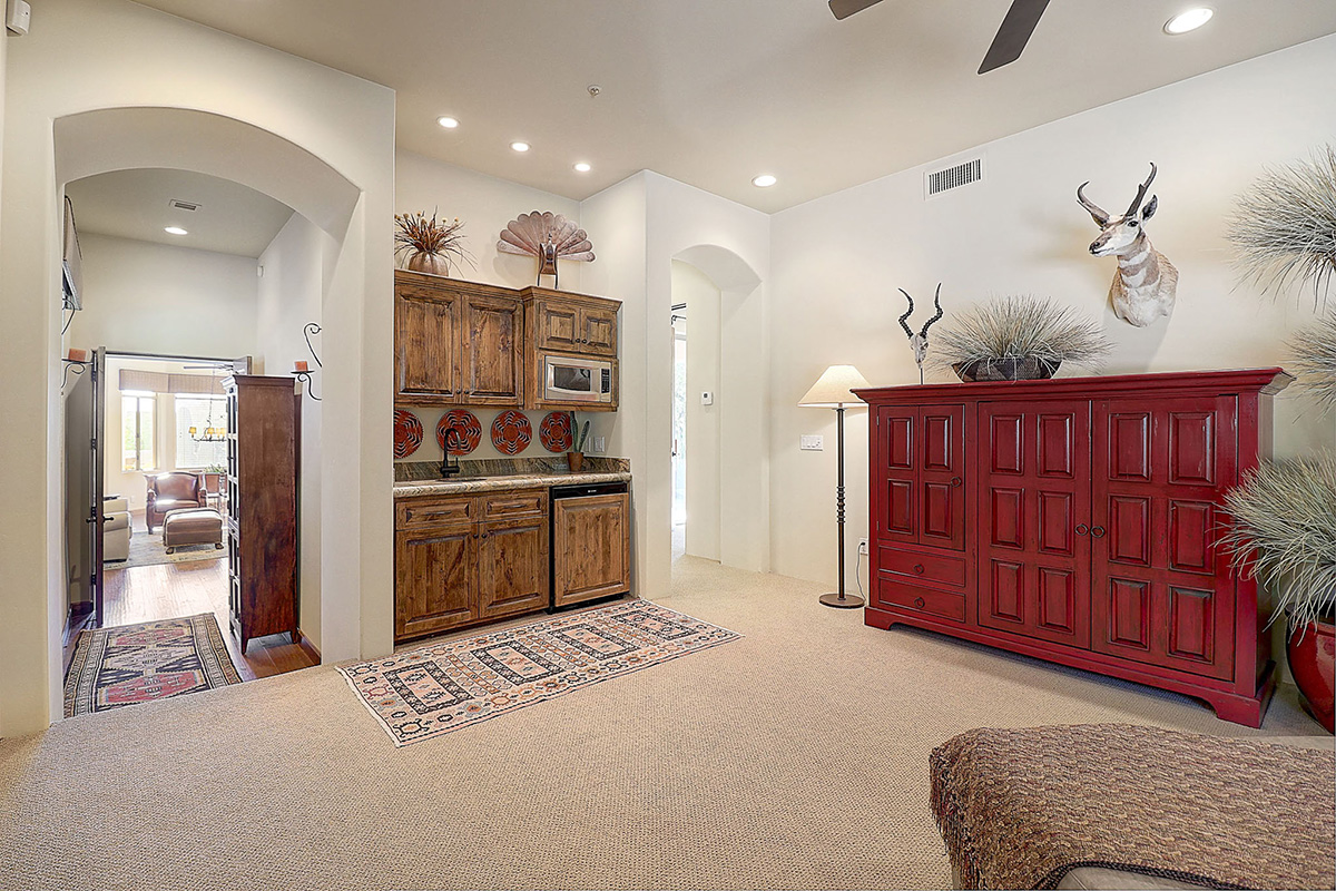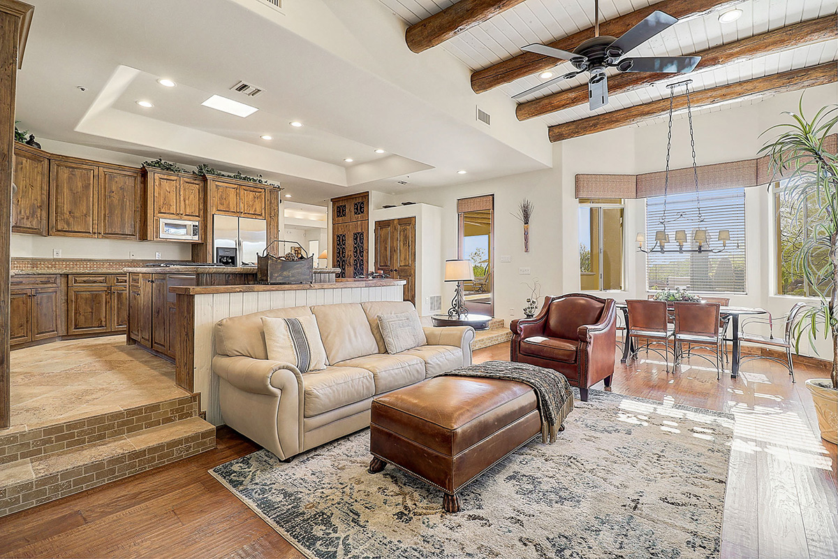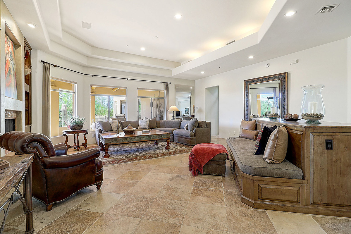 The kitchen features a temperature controlled wine fridge, wet bar, center island with curved peninsula, stainless steel appliances, two refrigerators, counter top seating and overlooks the dining and family rooms with views of Pinnacle Peak and the backyard.