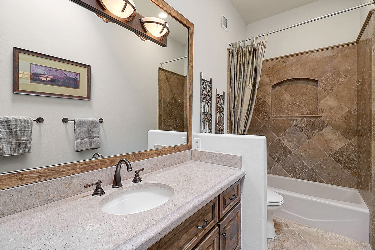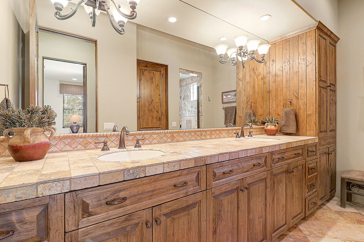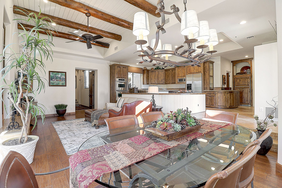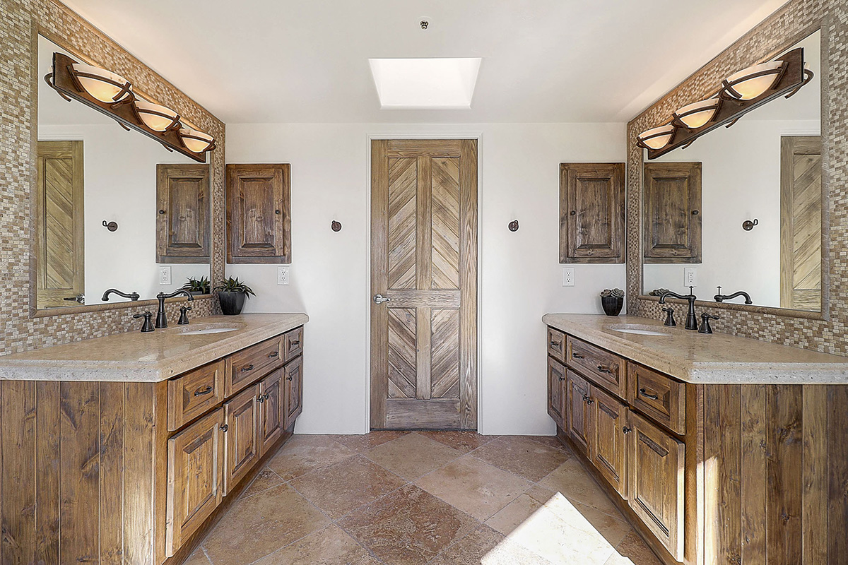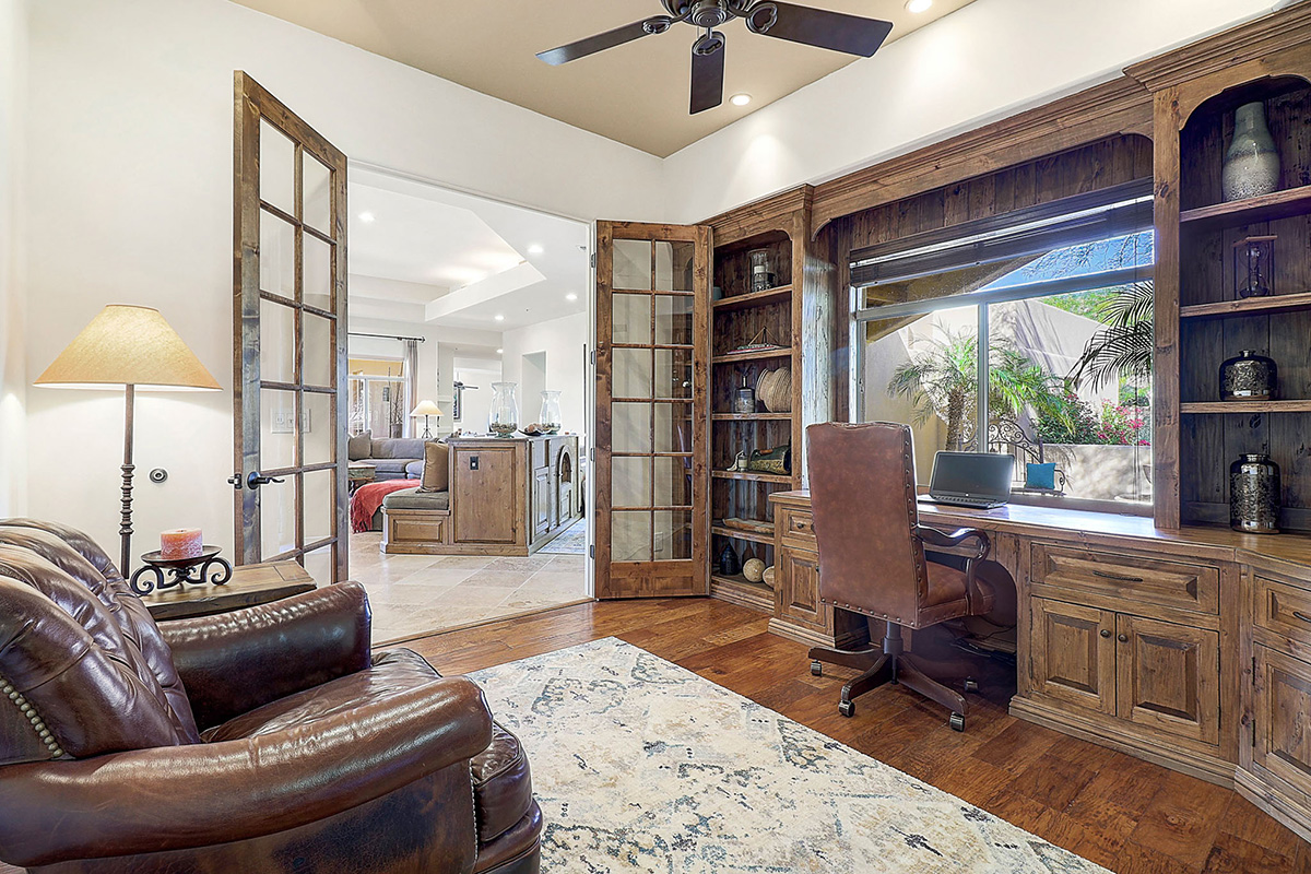 Privately tucked away on a cul-de-sac lot, the front courtyard ushers you into the spacious living room that has built in art niches, a cozy fireplace and picture windows capturing views of the serene backyard. Throughout the home you will find beautiful custom upgrades like travertine and wood floors, distressed knotty alder cabinetry, beamed ceilings, neutral paint, chevron patterned interior doors, and granite surfaces.