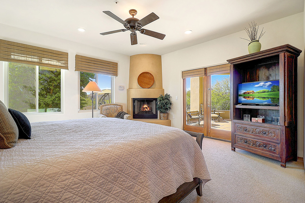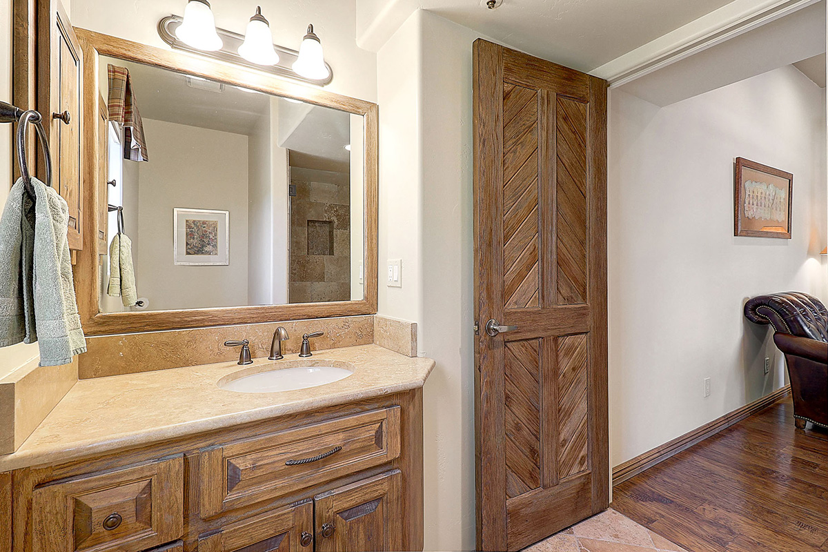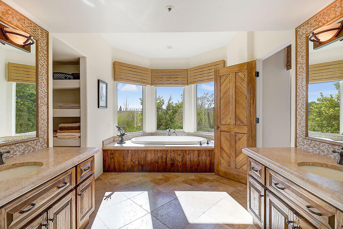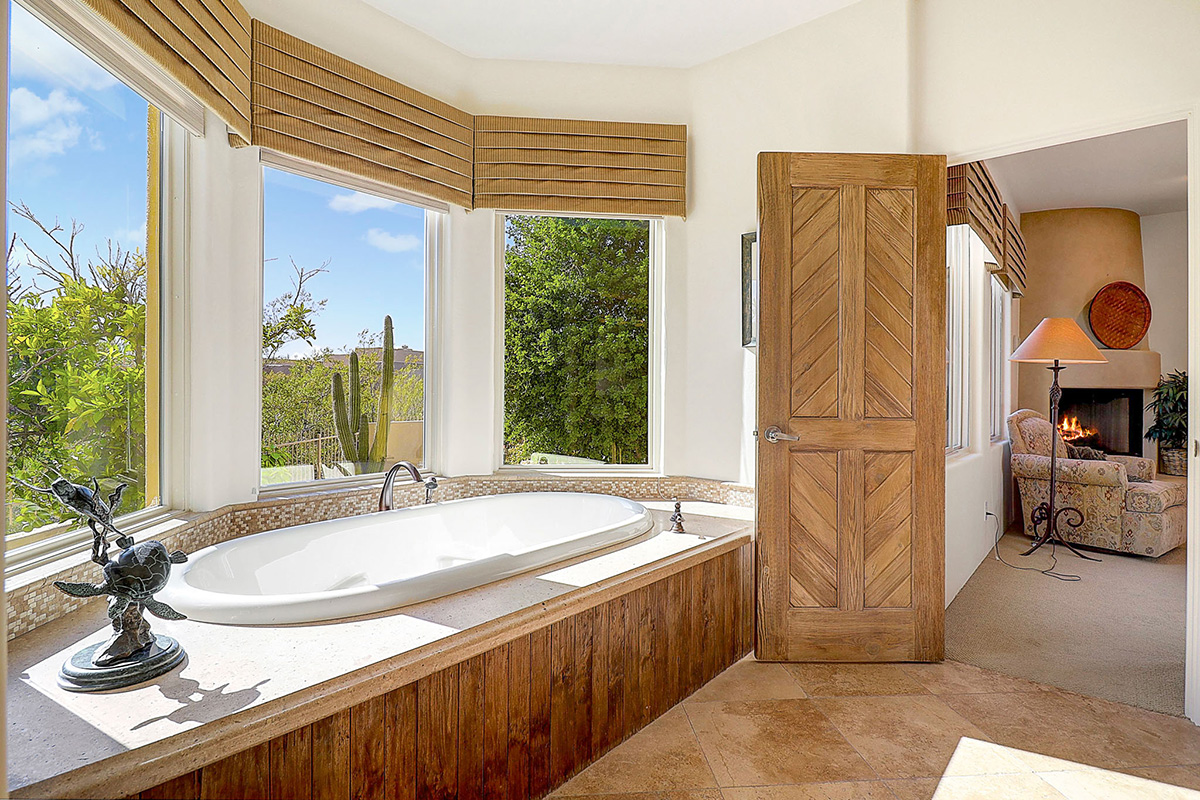 The main master bedroom has a separate entrance into the sitting room with kitchenette, ensuite bath with dual sinks and walk in shower and could easily be used as separate guest quarters. The junior master suite is split and has access to the rear patio, separate vanities, large soaking tub and walk-in closet. The office is located off the entry and has charming wood floors, views to the courtyard, built-in desk and library shelving and an ensuite bath.