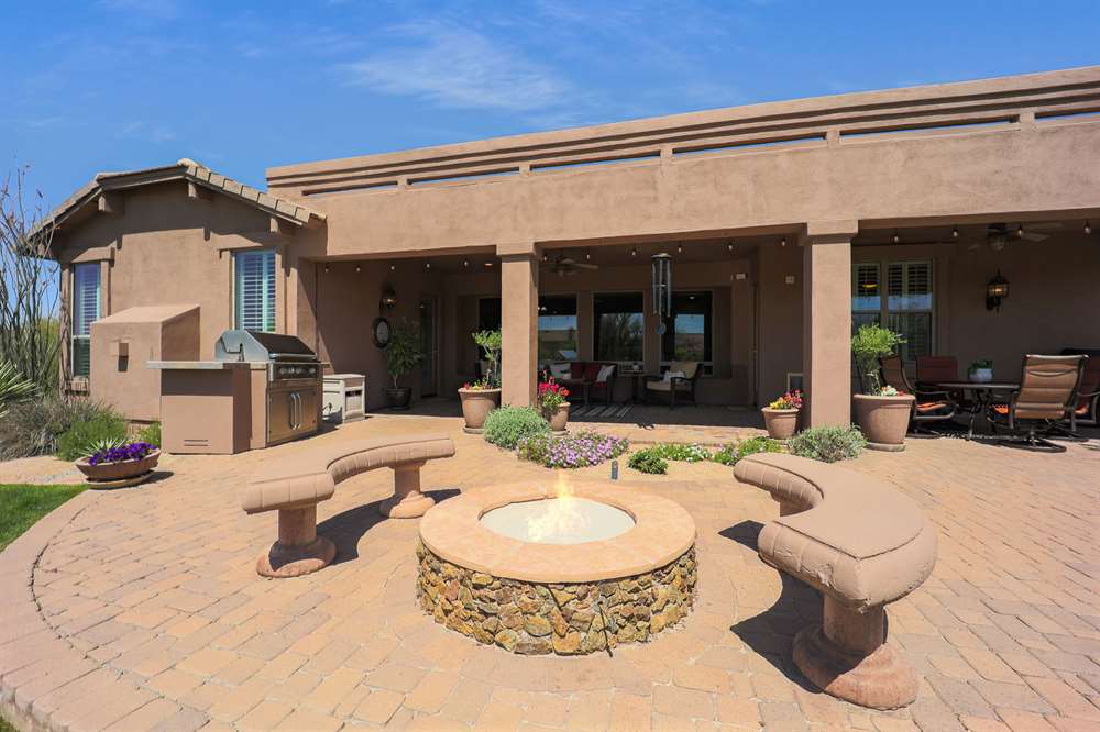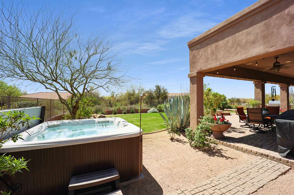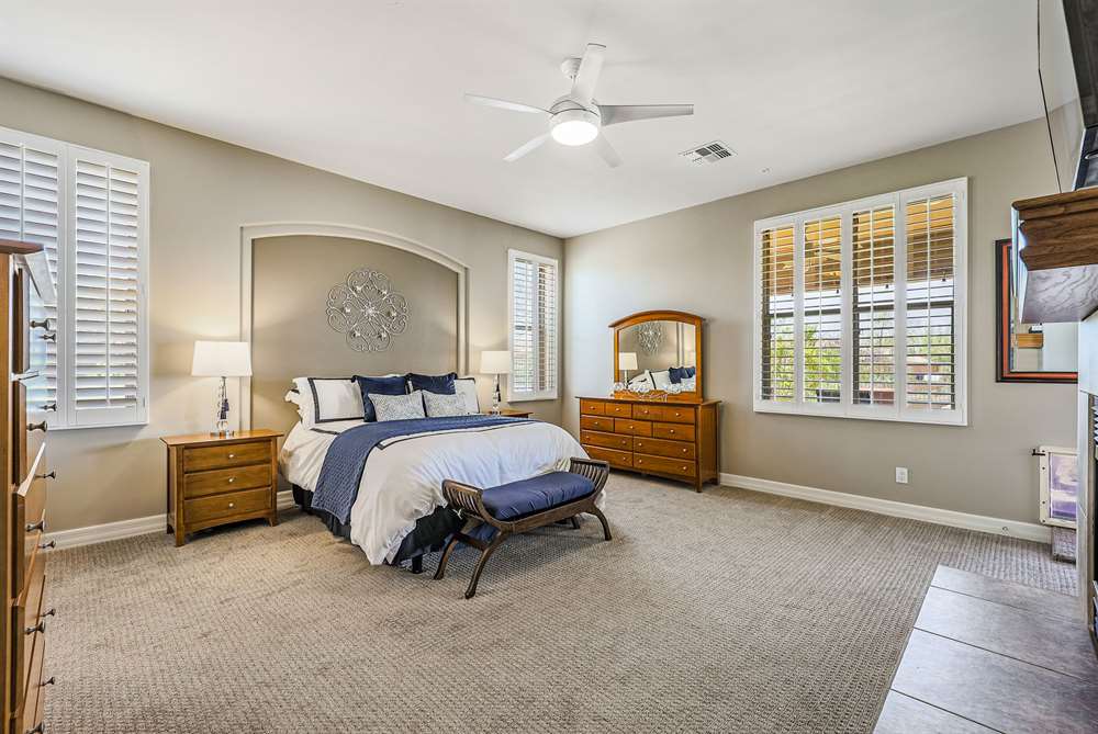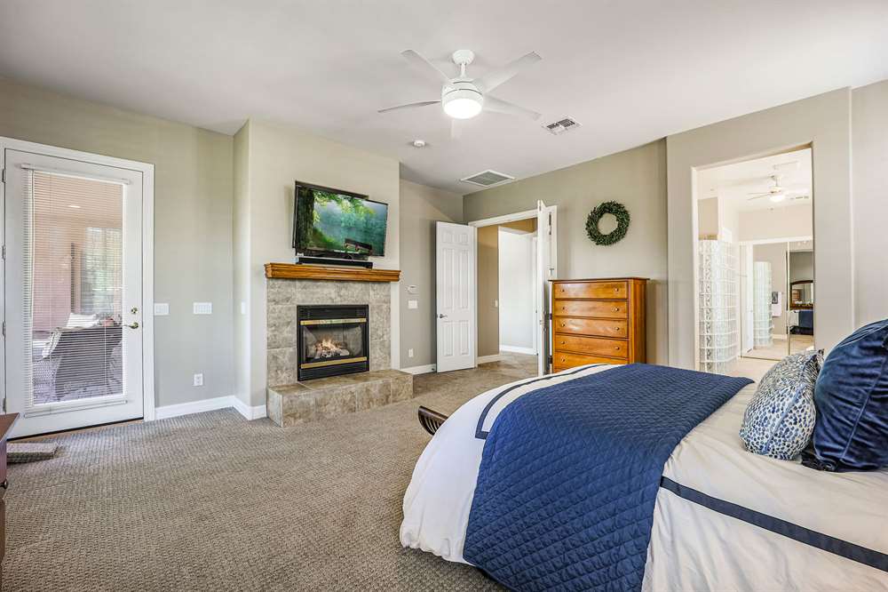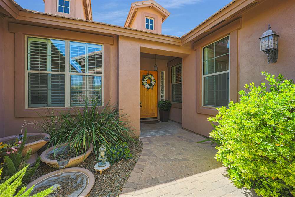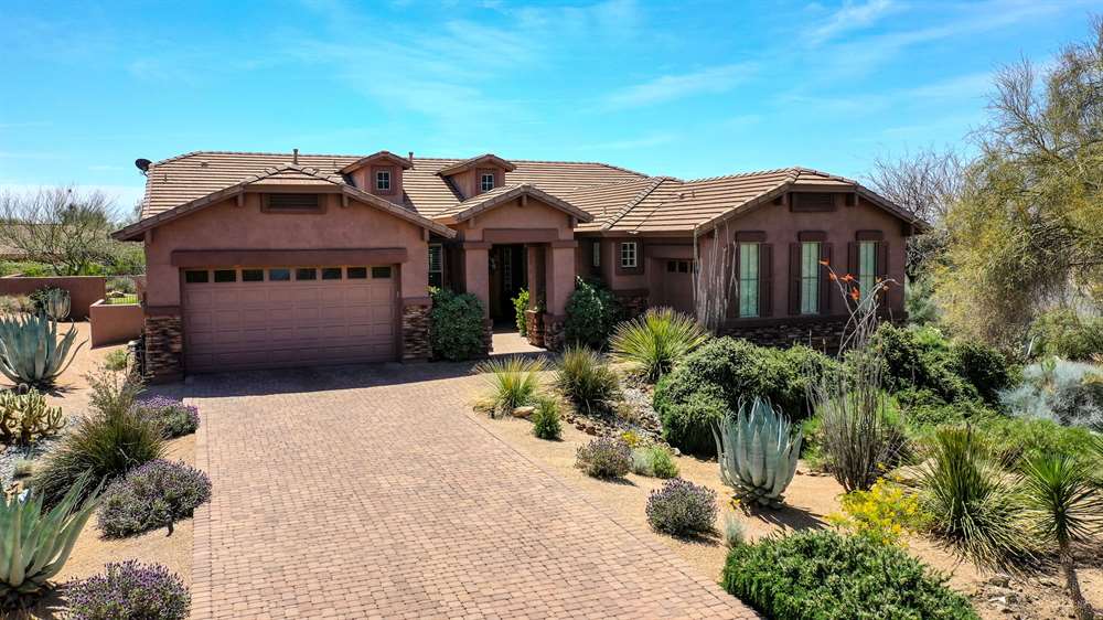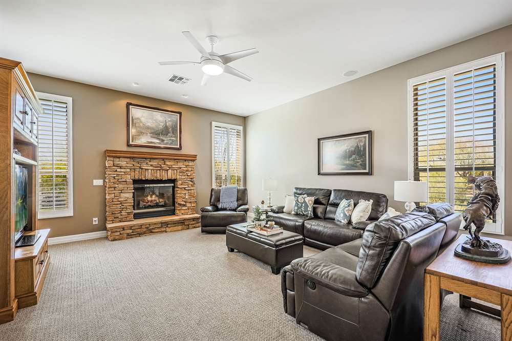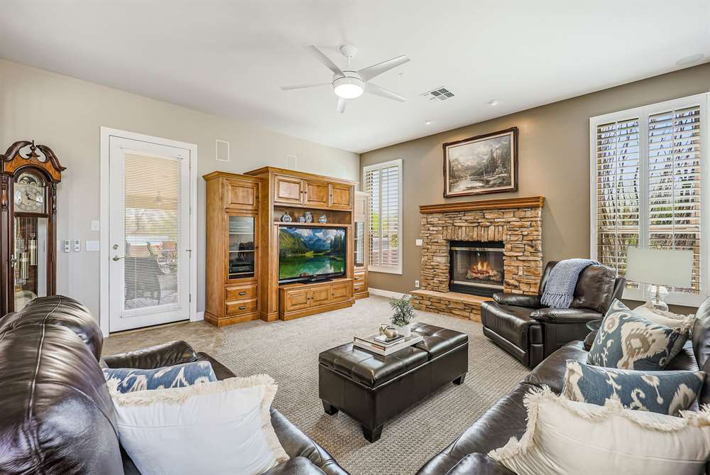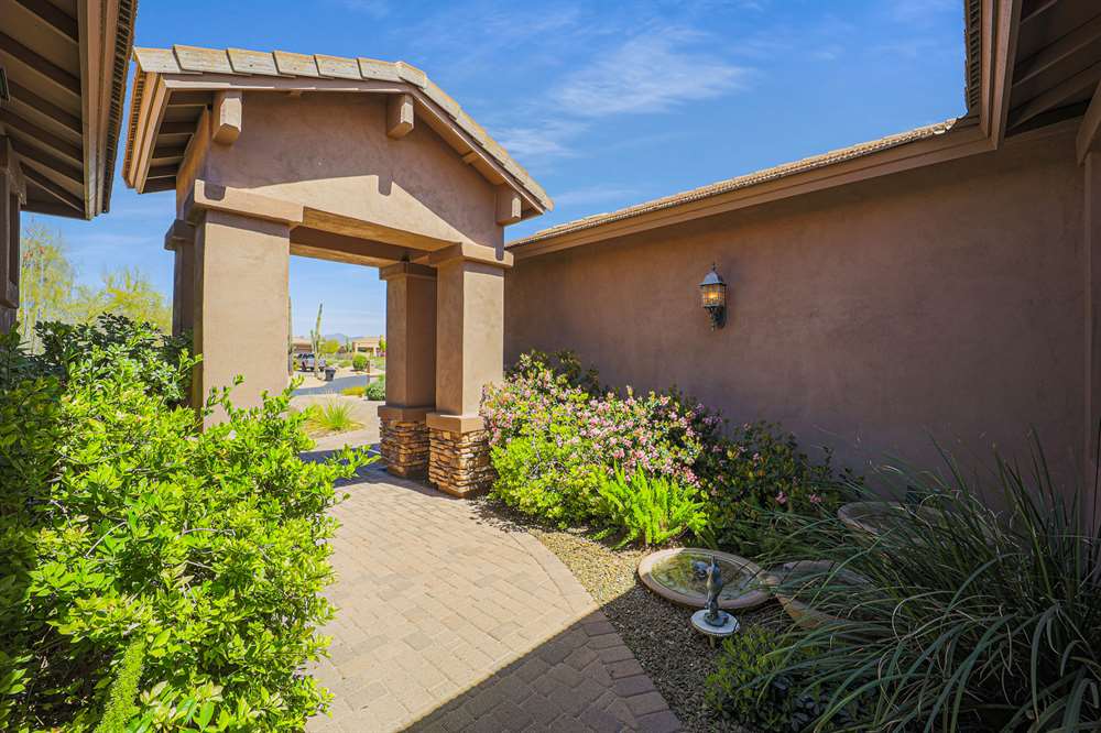 Beautifully maintained, this wonderful 3,157 square foot home features four bedrooms, four bathrooms, and an office that could be used as a fifth bedroom. Located on a corner cul-de-sac lot inside the gated community of Boulder Ridge, enjoy plenty of privacy on the three quarter acre lot. The extended paver drive leads to a two-car main garage with a split one-bay garage for a total of three-car storage. The private entry courtyard with relaxing water feature, ushers you inside to high ceilings, plantation shutters, neutral paint and flooring, formal living and dining spaces, and an open concept family room/kitchen area. The kitchen has a stainless steel appliance package, gas cooktop, center island with prep sink, counter seating, a walk-in pantry, and a breakfast seating area all open to the family room with a stacked stone centerpiece fireplace. The backyard has southern exposure, a large paver covered patio, grassy play area, built-in barbecue, fire pit, above ground spa, and beautiful landscaped grounds in both the rear and front. The master bedroom also has a fireplace along with exterior access, large en-suite bathroom with walk-in closet and large soaking tub. The HVAC was replaced in 2020, new interior paint in 2018, and new carpet in 2018.