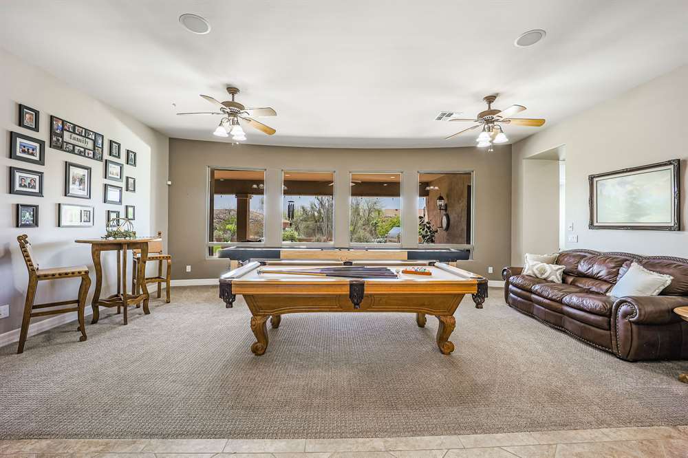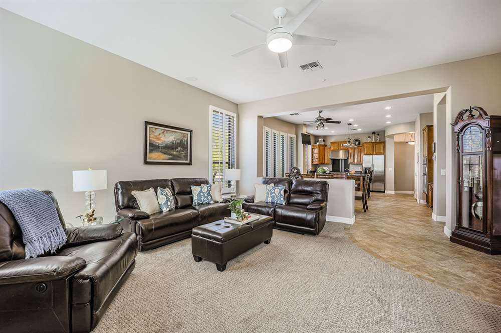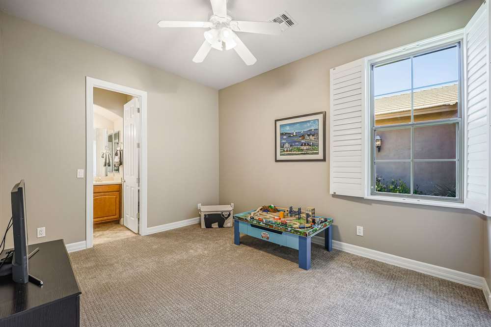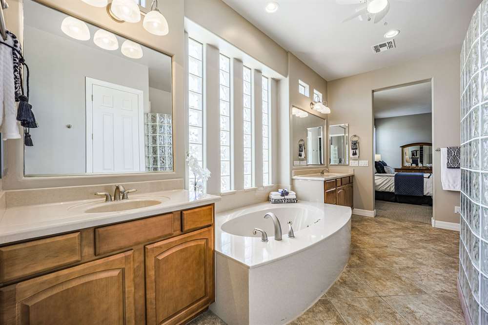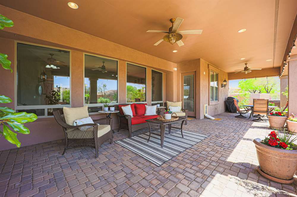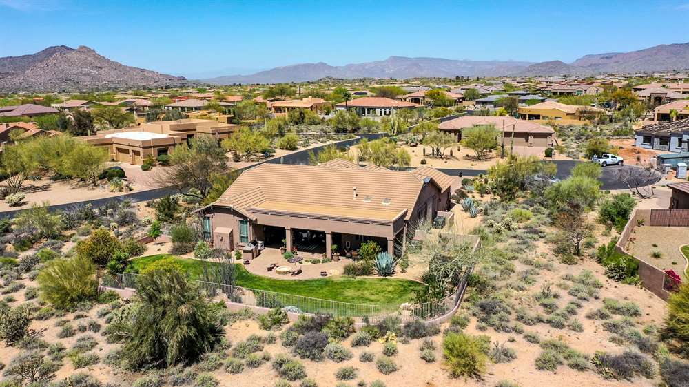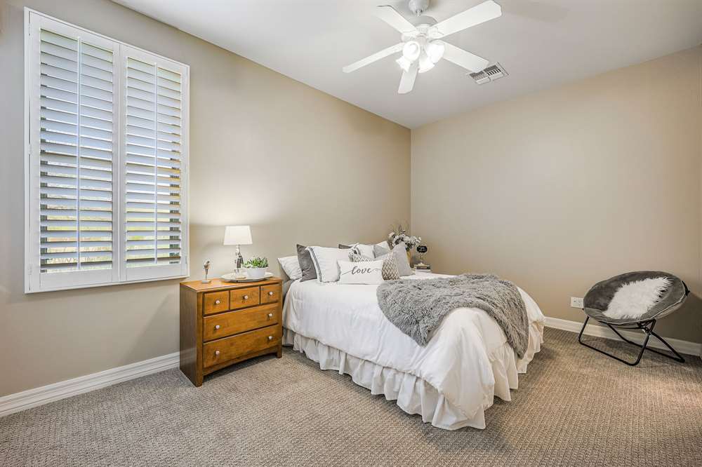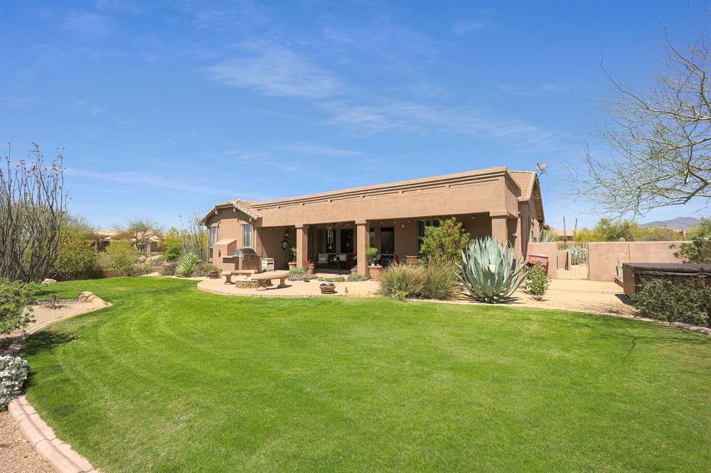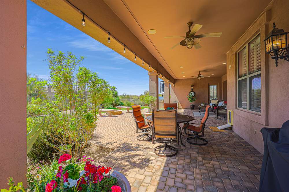 Beautifully maintained, this wonderful 3,157 square foot home features four bedrooms, four bathrooms, and an office that could be used as a fifth bedroom. Located on a corner cul-de-sac lot inside the gated community of Boulder Ridge, enjoy plenty of privacy on the three quarter acre lot. The extended paver drive leads to a two-car main garage with a split one-bay garage for a total of three-car storage. The private entry courtyard with relaxing water feature, ushers you inside to high ceilings, plantation shutters, neutral paint and flooring, formal living and dining spaces, and an open concept family room/kitchen area. The kitchen has a stainless steel appliance package, gas cooktop, center island with prep sink, counter seating, a walk-in pantry, and a breakfast seating area all open to the family room with a stacked stone centerpiece fireplace. The backyard has southern exposure, a large paver covered patio, grassy play area, built-in barbecue, fire pit, above ground spa, and beautiful landscaped grounds in both the rear and front. The master bedroom also has a fireplace along with exterior access, large en-suite bathroom with walk-in closet and large soaking tub. The HVAC was replaced in 2020, new interior paint in 2018, and new carpet in 2018.