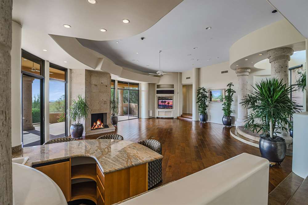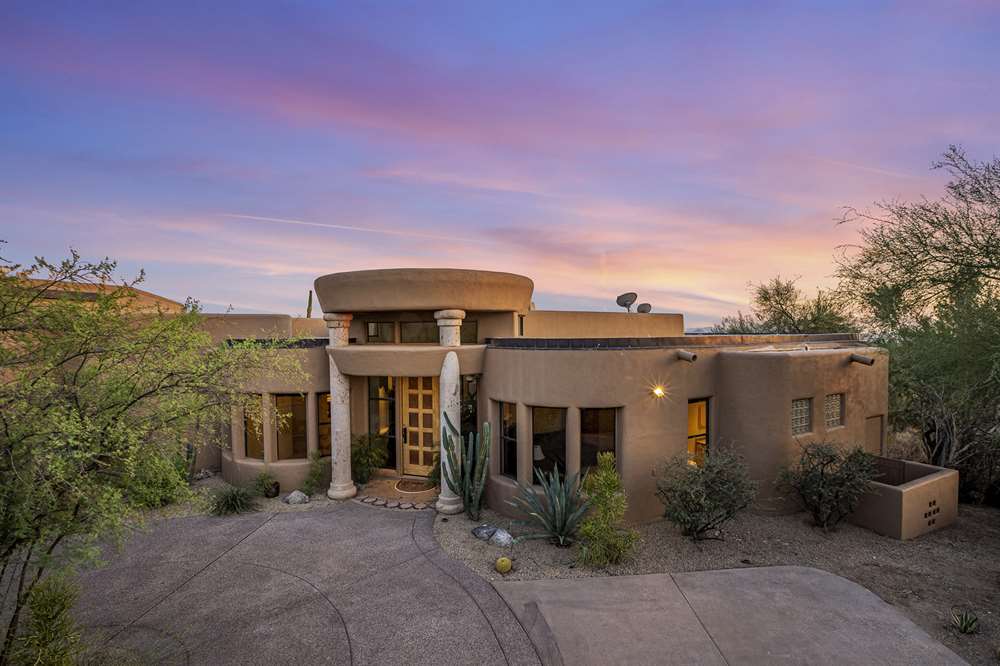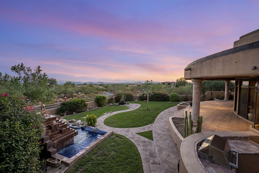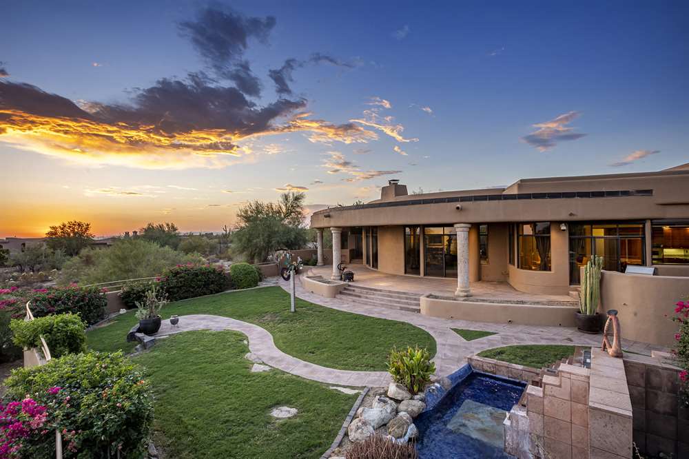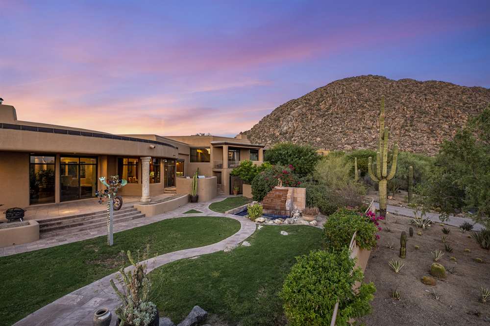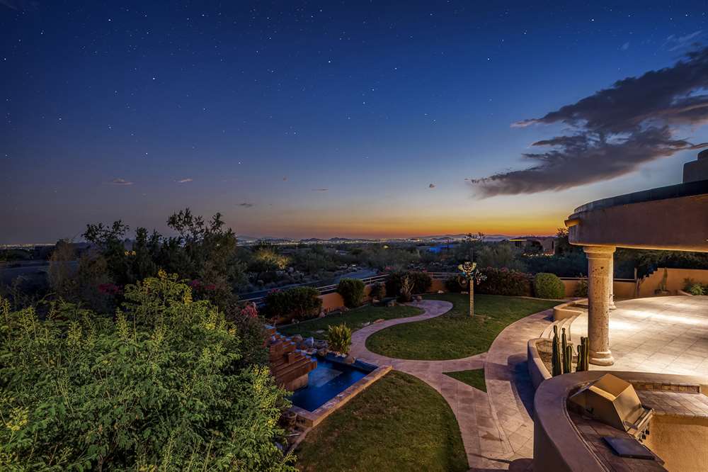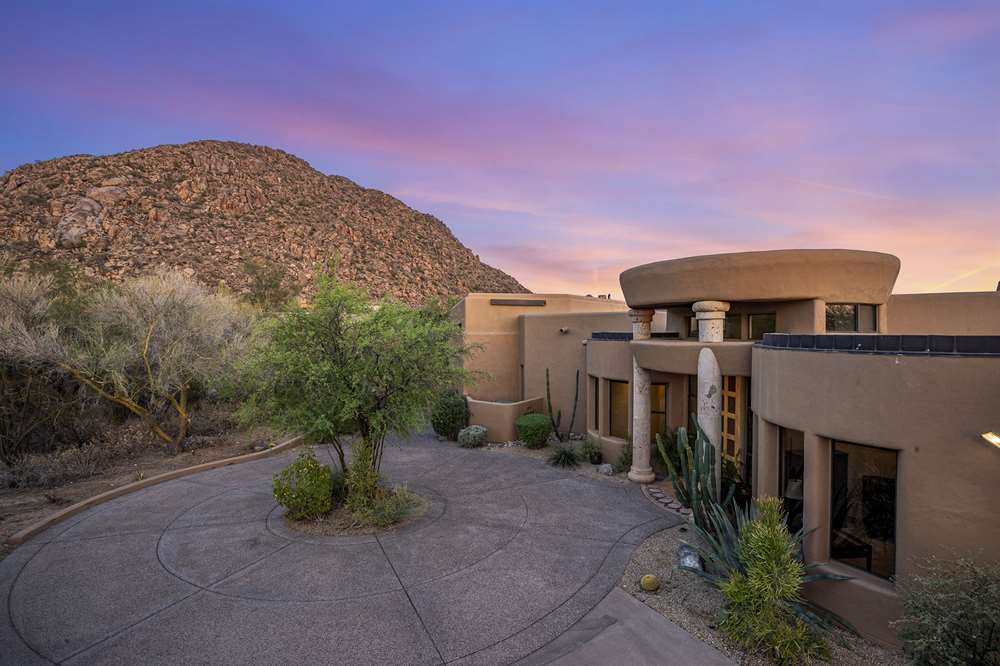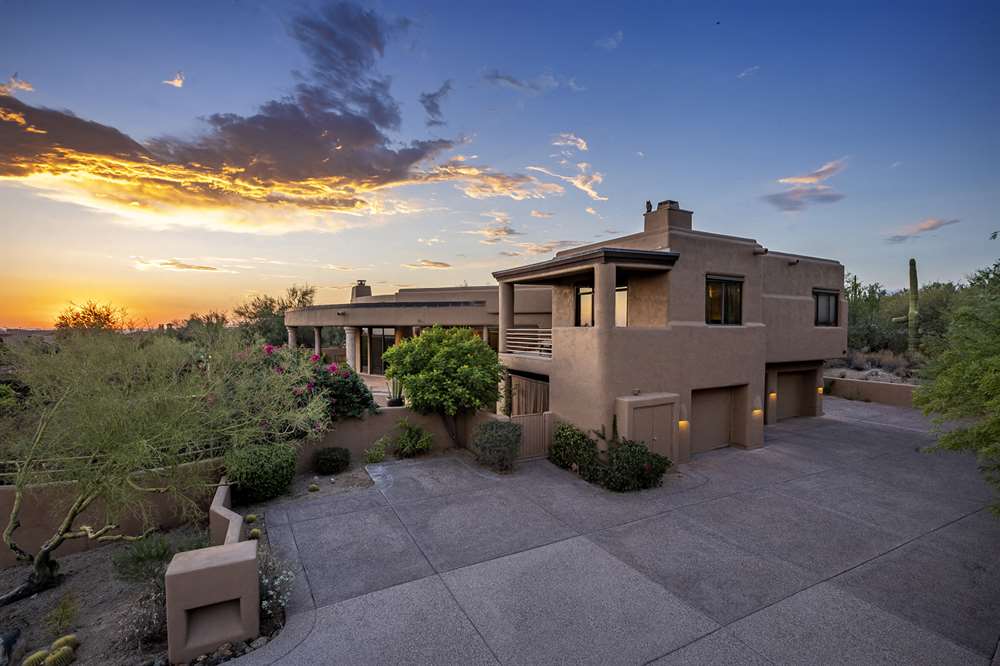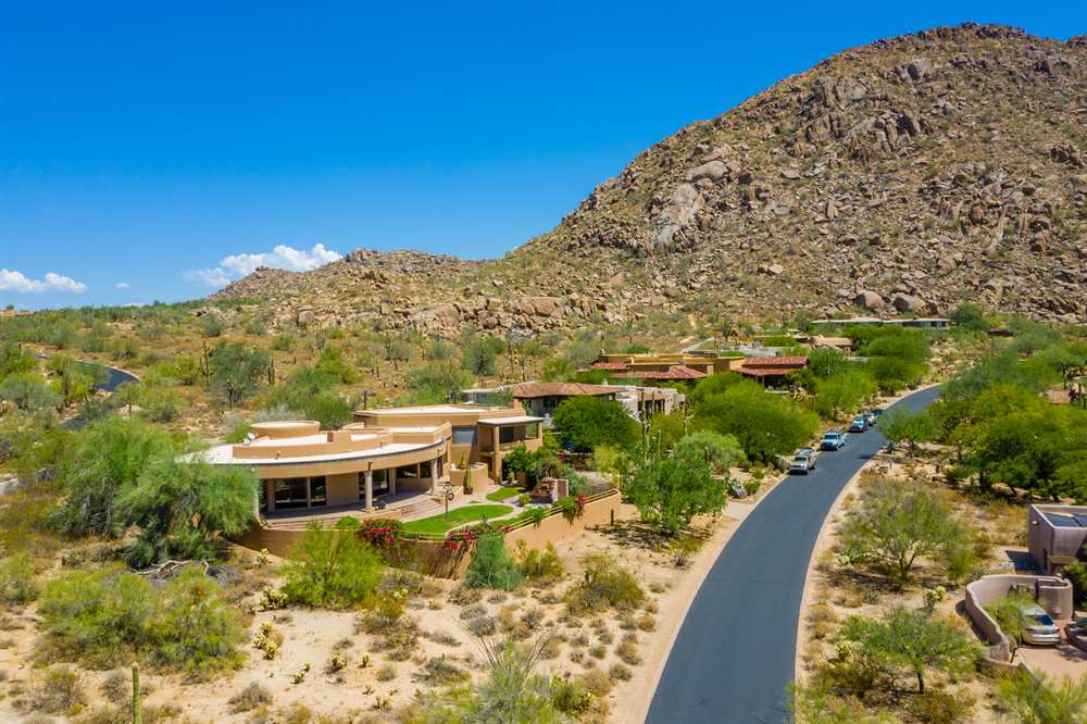 An exceptional view lot sets the backdrop for this soft contemporary desert dwelling located in the guard-gated community of Desert Highlands. Sitting high in elevation within the community, enjoy spectacular views of sparkling city lights and panoramic mountain views.