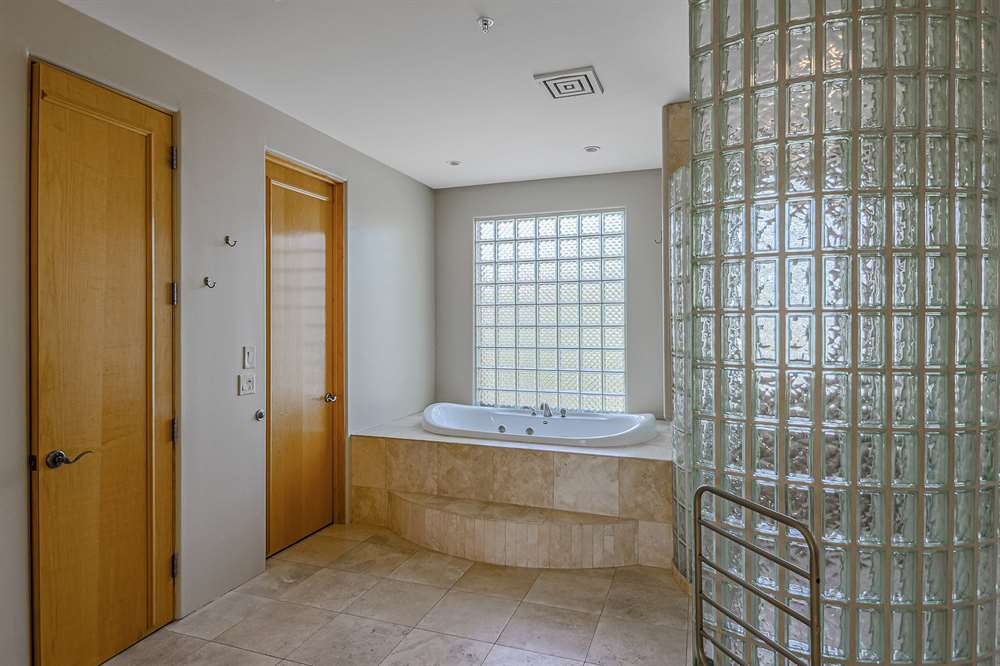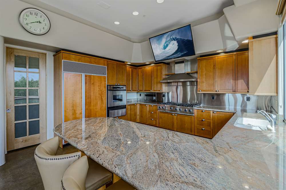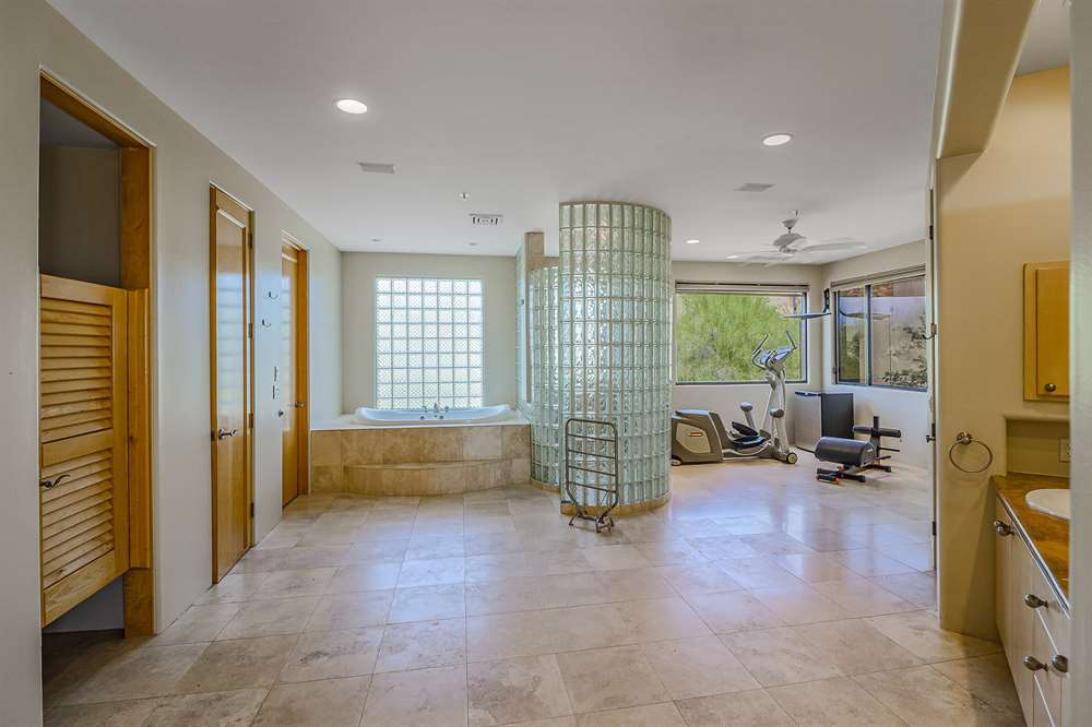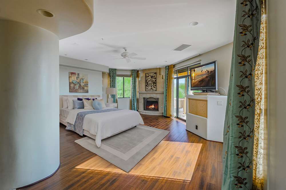 The master retreat has a stone gas fireplace, and a private balcony with an attached spa-like bath featuring two walk-in closets, separate shower and jetted tub, built-in vanity, travertine flooring, and a bonus exercise/flex room.