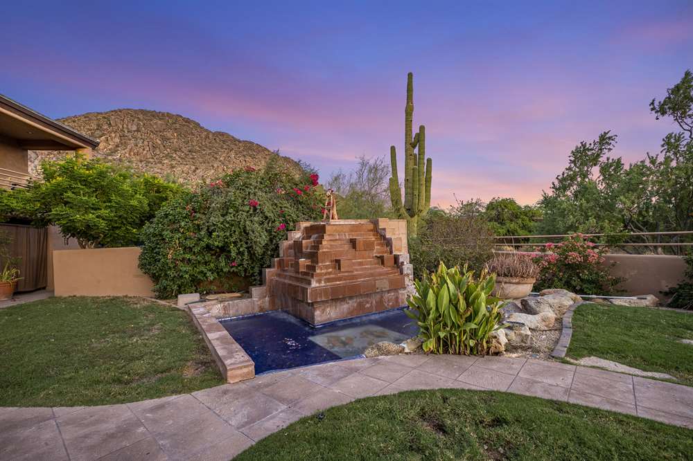 The rear yard has lush green grass, oversized covered patio with Canterra column accents, and a Taliesin inspired centerpiece water feature.