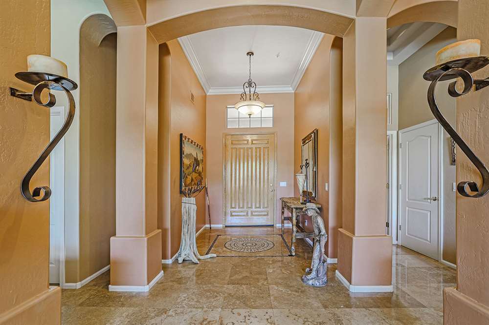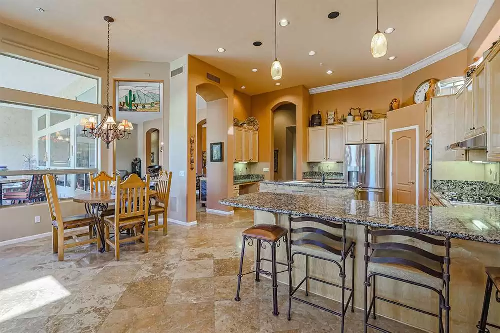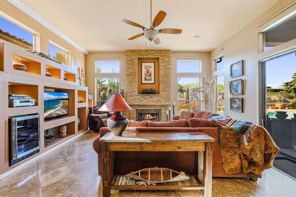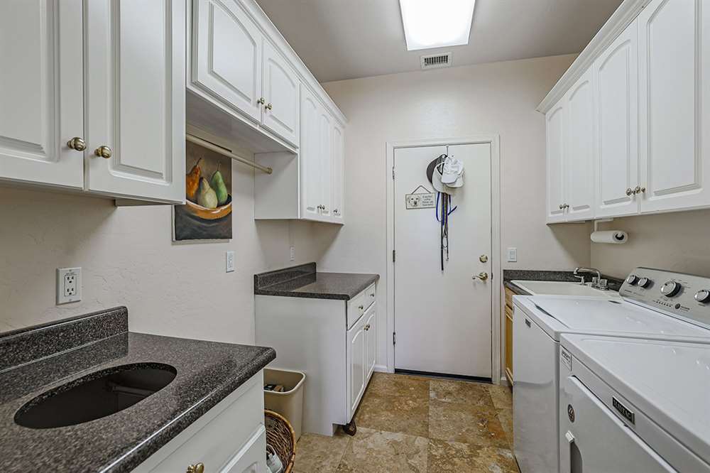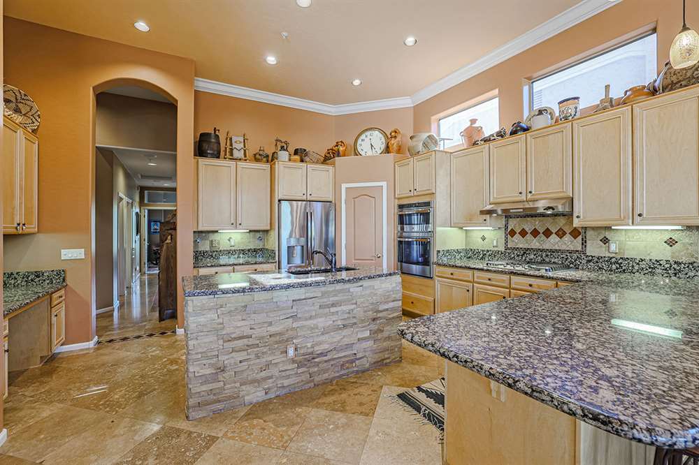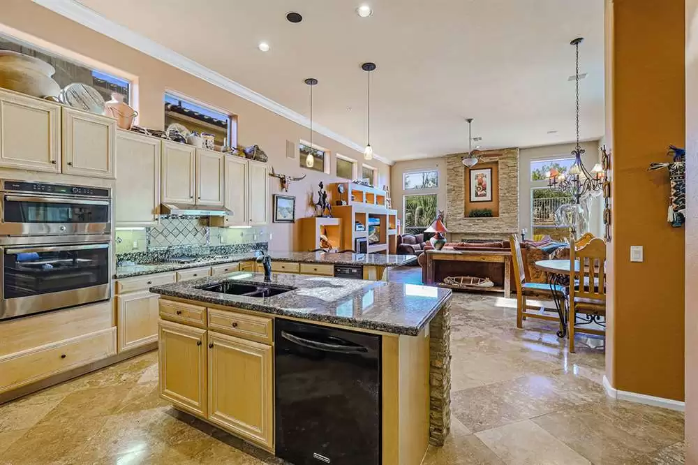 The three-car garage has epoxy floors and direct access into the home through the laundry room. Other features include: 2017 stainless steel appliances including fridge, cooktop, built-in oven, and microwave; one 2021 new HVAC unit; gas fireplace with stacked stone surround; travertine flooring; so much more!