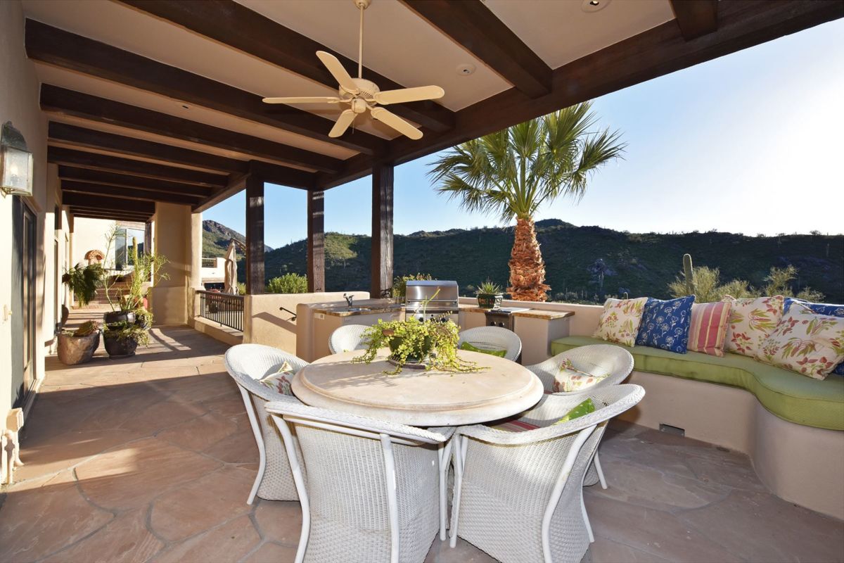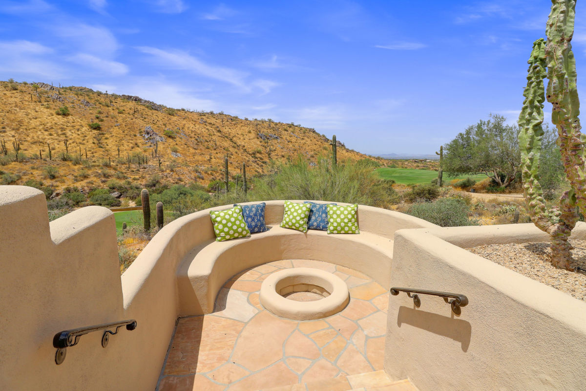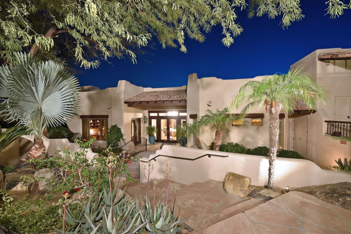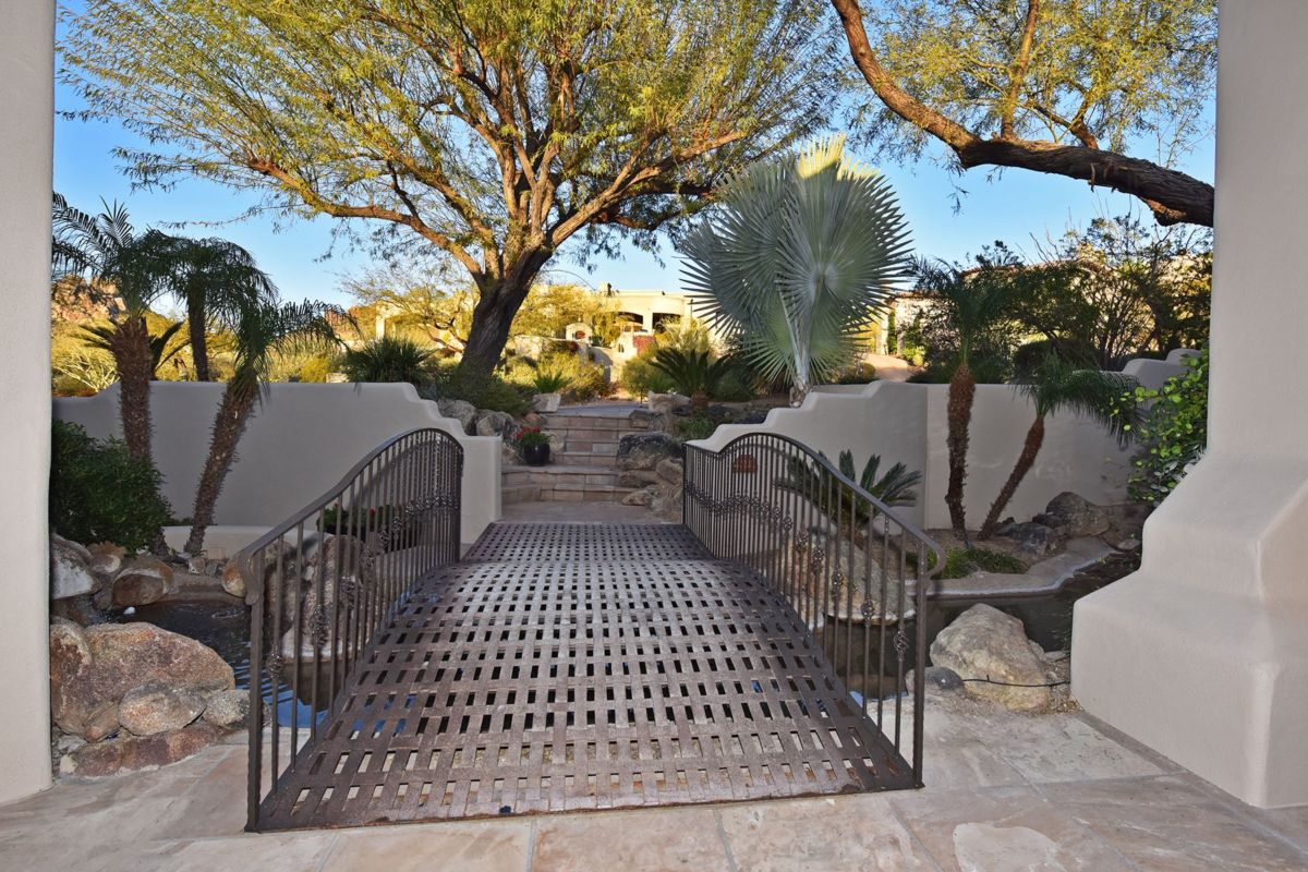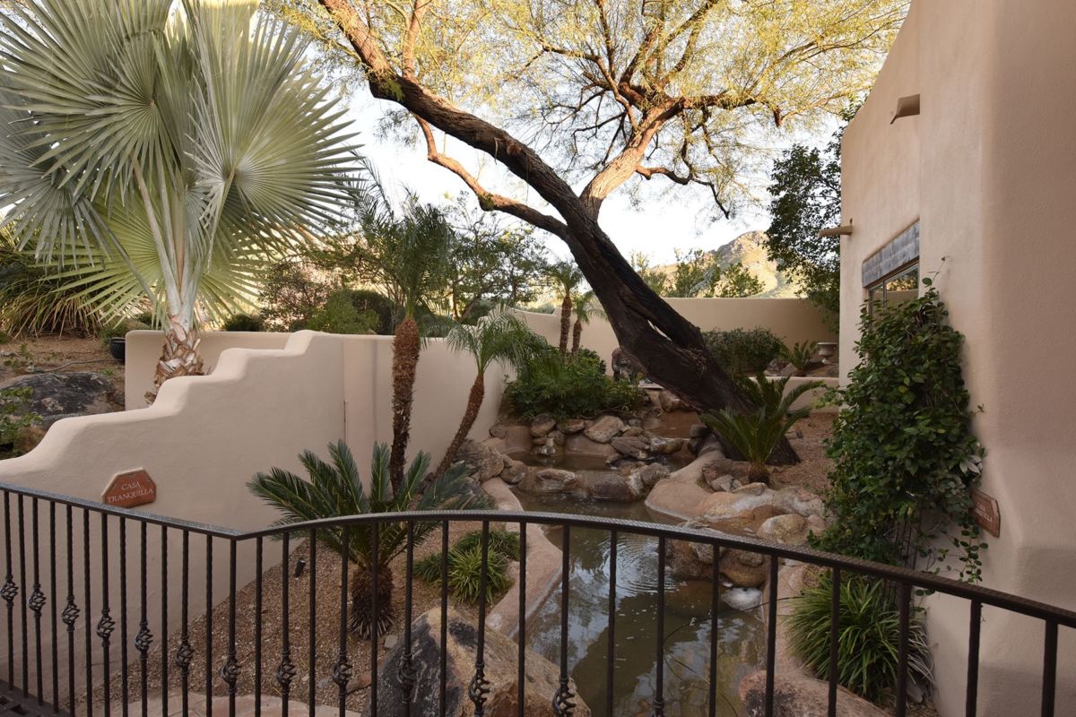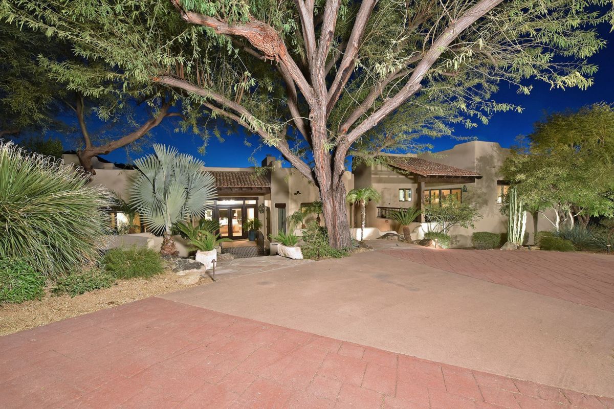 Privately tucked away in guard-gated Glenn Moor at Troon Village, this magnificent Southwest territorial style home has the feel of a desert oasis. Overlooking the 14th fairway nicknamed “The Cliff” of Troon Country Club’s world famous course, with the McDowell Mountains as a backdrop, enjoy the canyon, mountain, golf, and city light views from the numerous patios, courtyards and the large resort style pool with lounge deck and water feature.