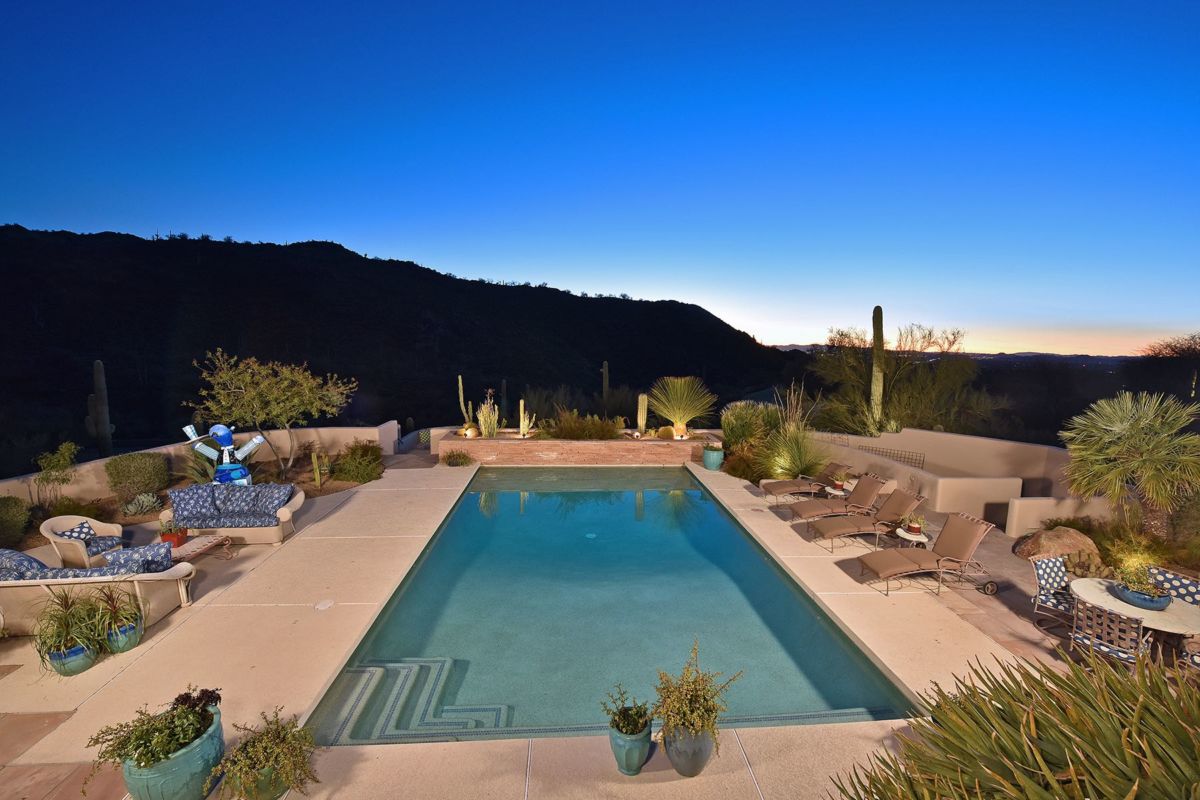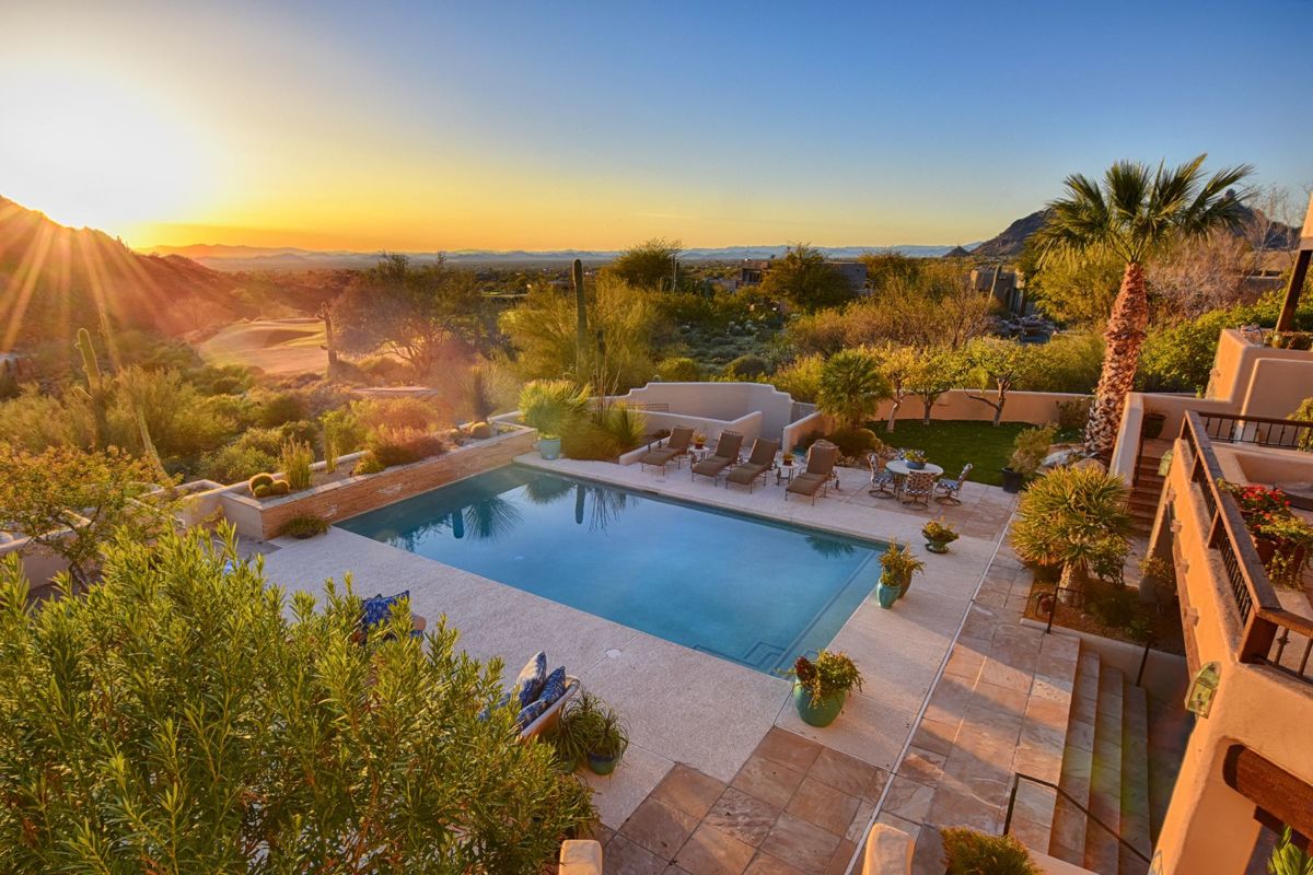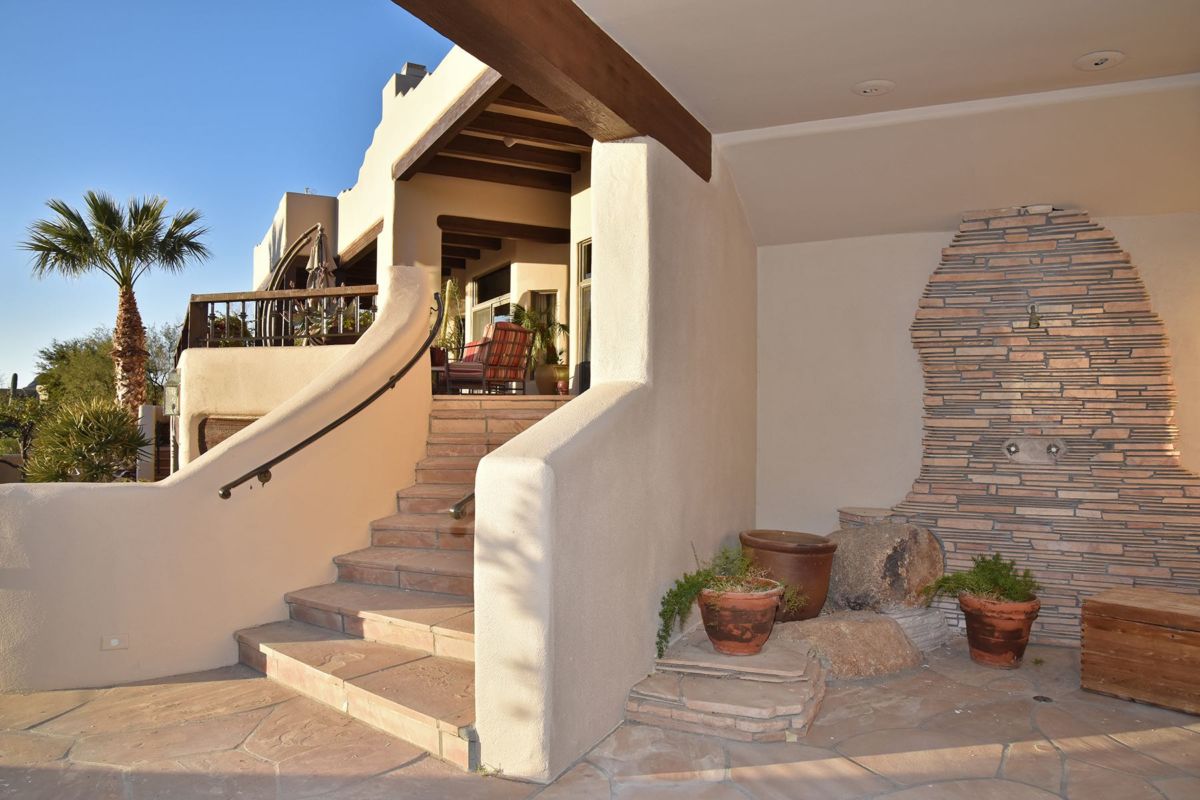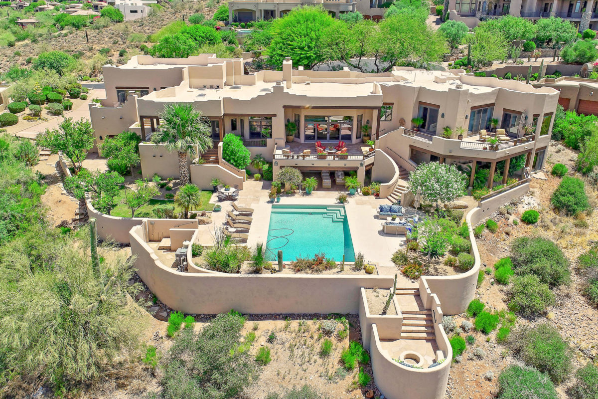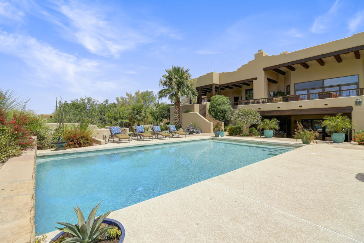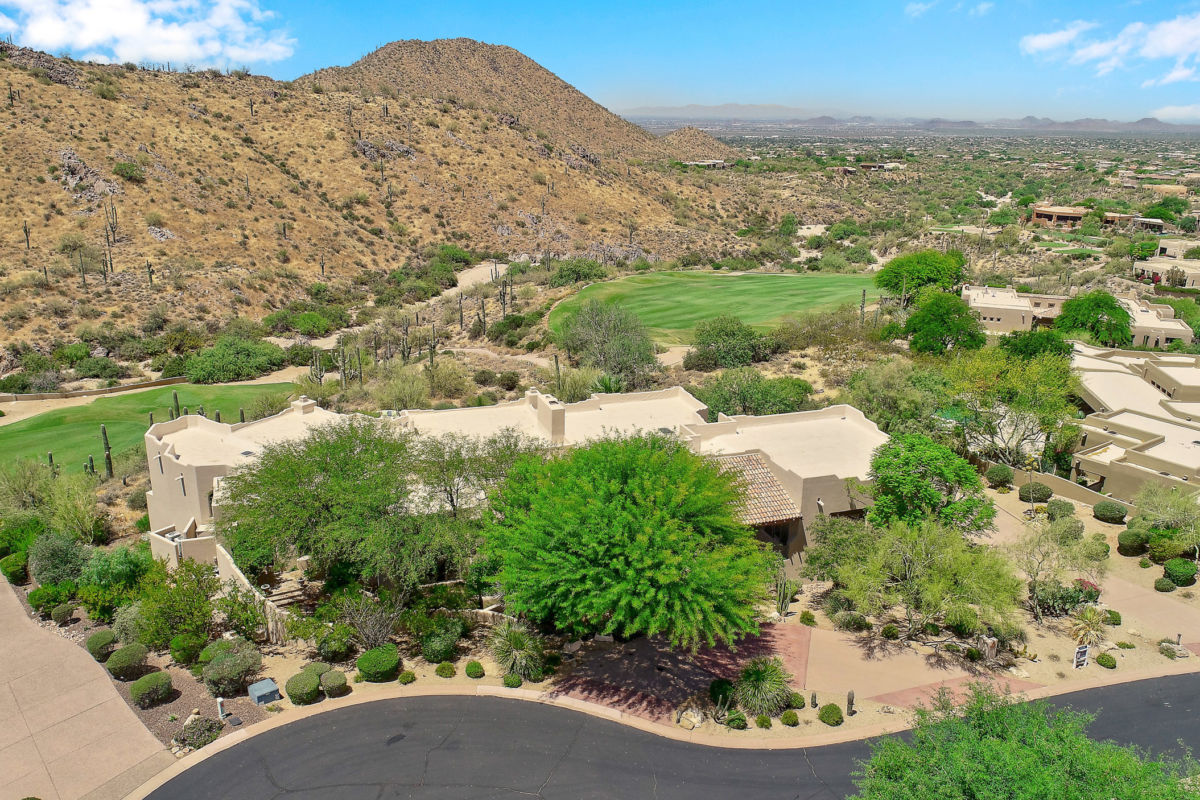 Privately tucked away in guard-gated Glenn Moor at Troon Village, this magnificent Southwest territorial style home has the feel of a desert oasis. Overlooking the 14th fairway nicknamed “The Cliff” of Troon Country Club’s world famous course, with the McDowell Mountains as a backdrop, enjoy the canyon, mountain, golf, and city light views from the numerous patios, courtyards and the large resort style pool with lounge deck and water feature.
