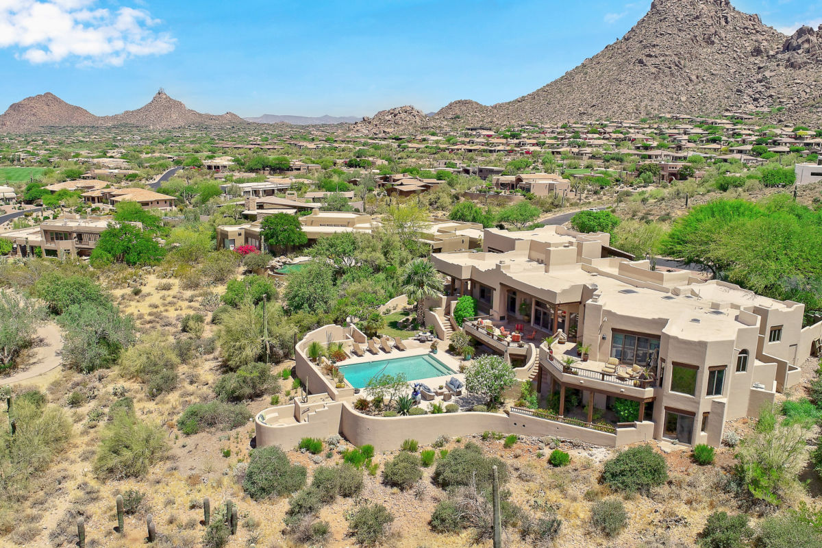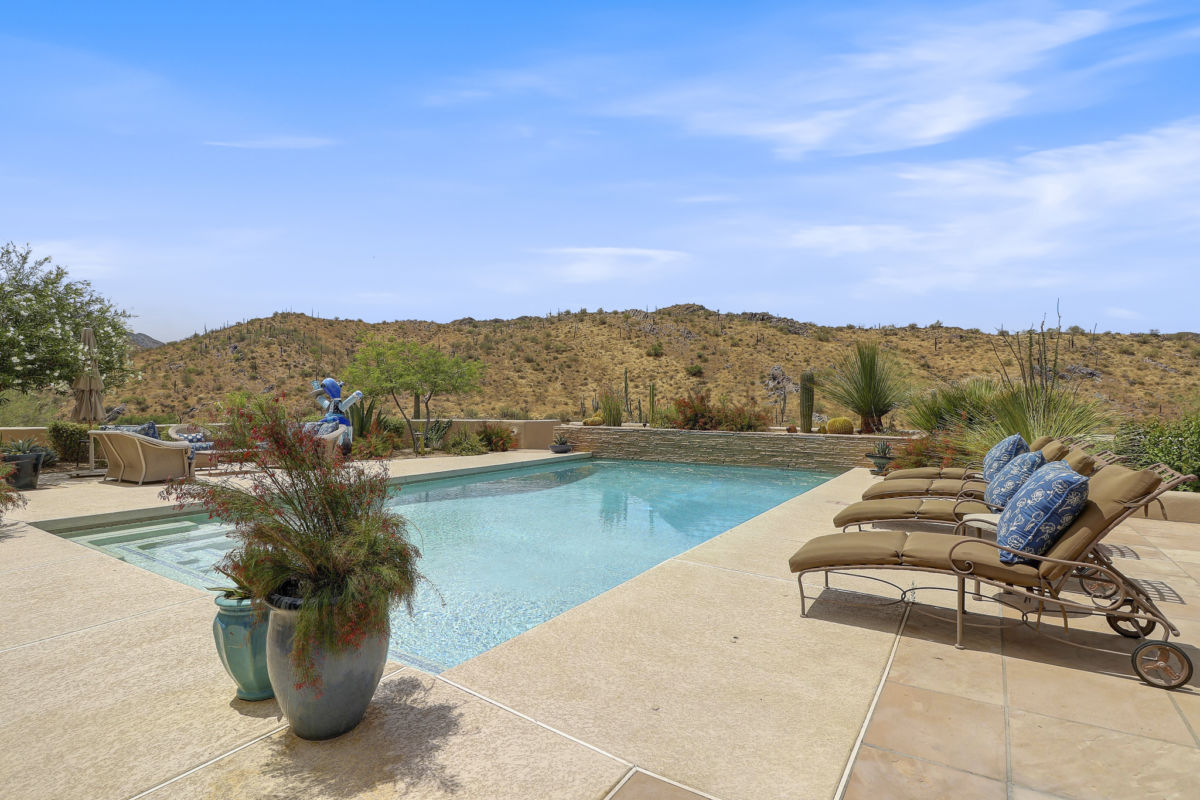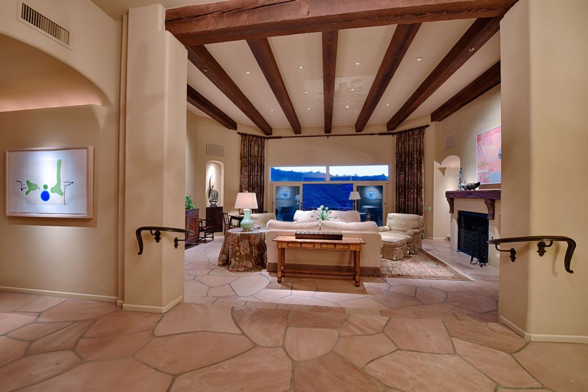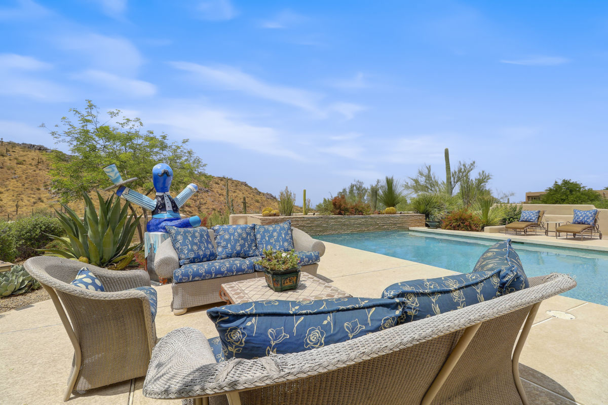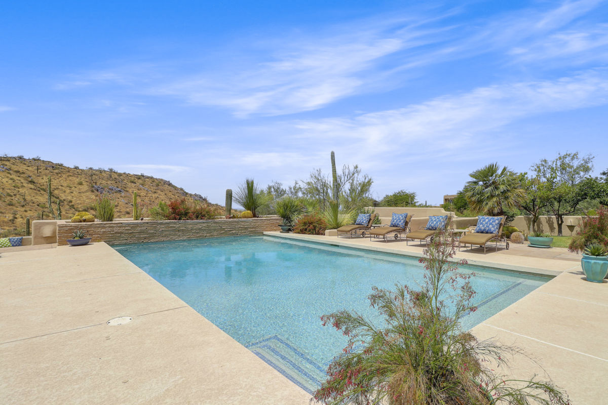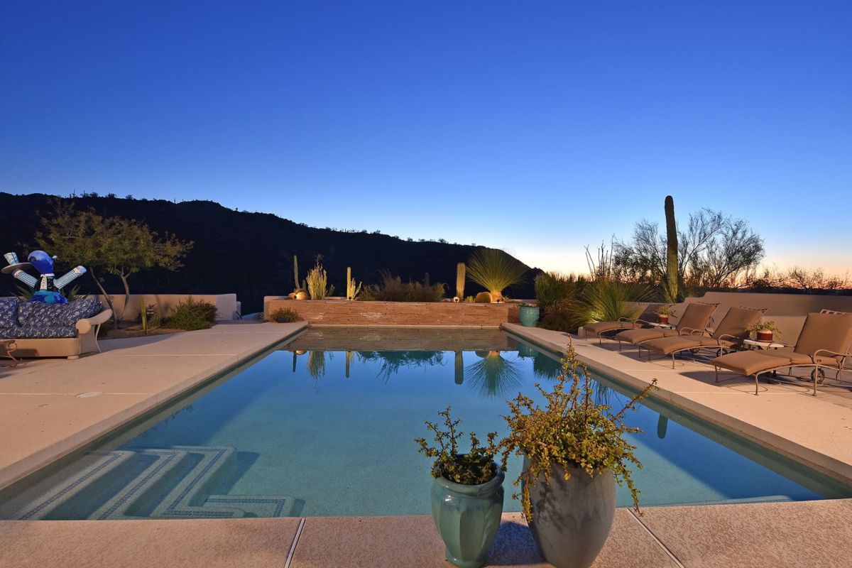 Privately tucked away in guard-gated Glenn Moor at Troon Village, this magnificent Southwest territorial style home has the feel of a desert oasis. Overlooking the 14th fairway nicknamed “The Cliff” of Troon Country Club’s world famous course, with the McDowell Mountains as a backdrop, enjoy the canyon, mountain, golf, and city light views from the numerous patios, courtyards and the large resort style pool with lounge deck and water feature.