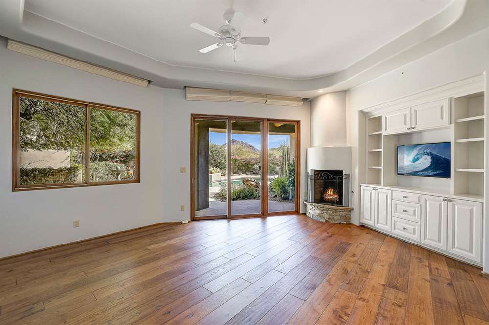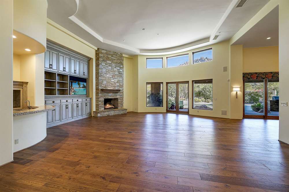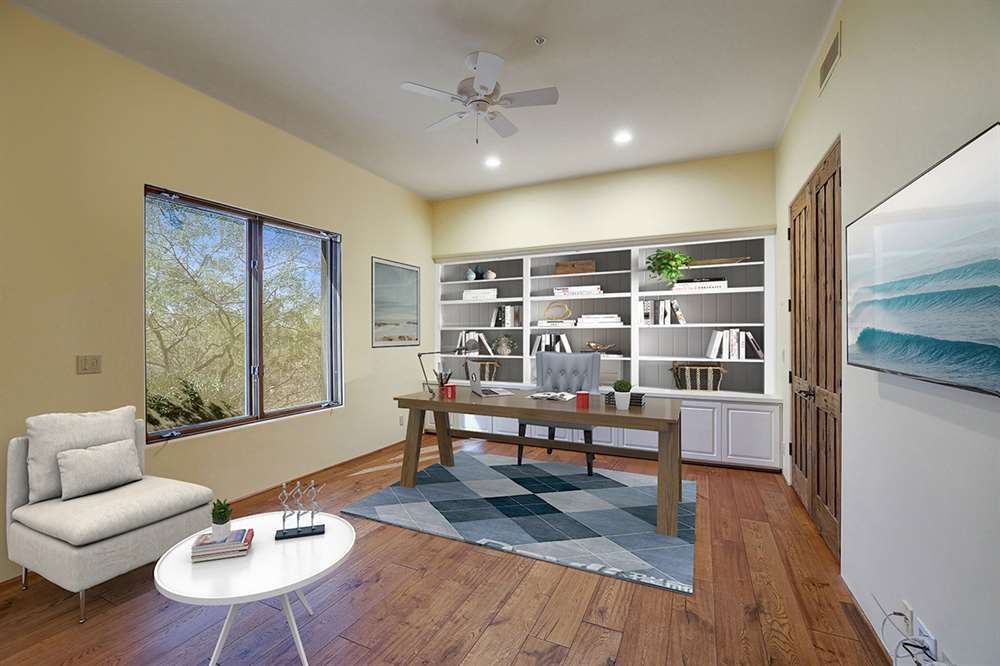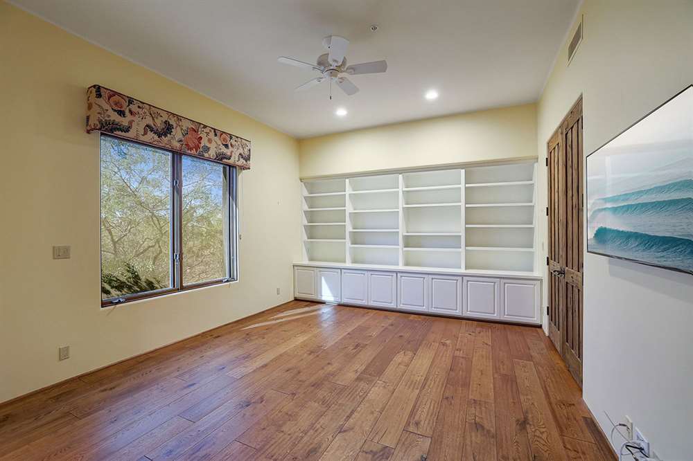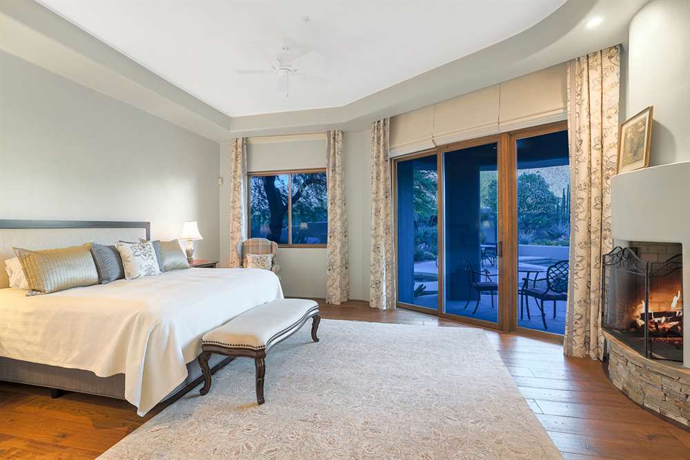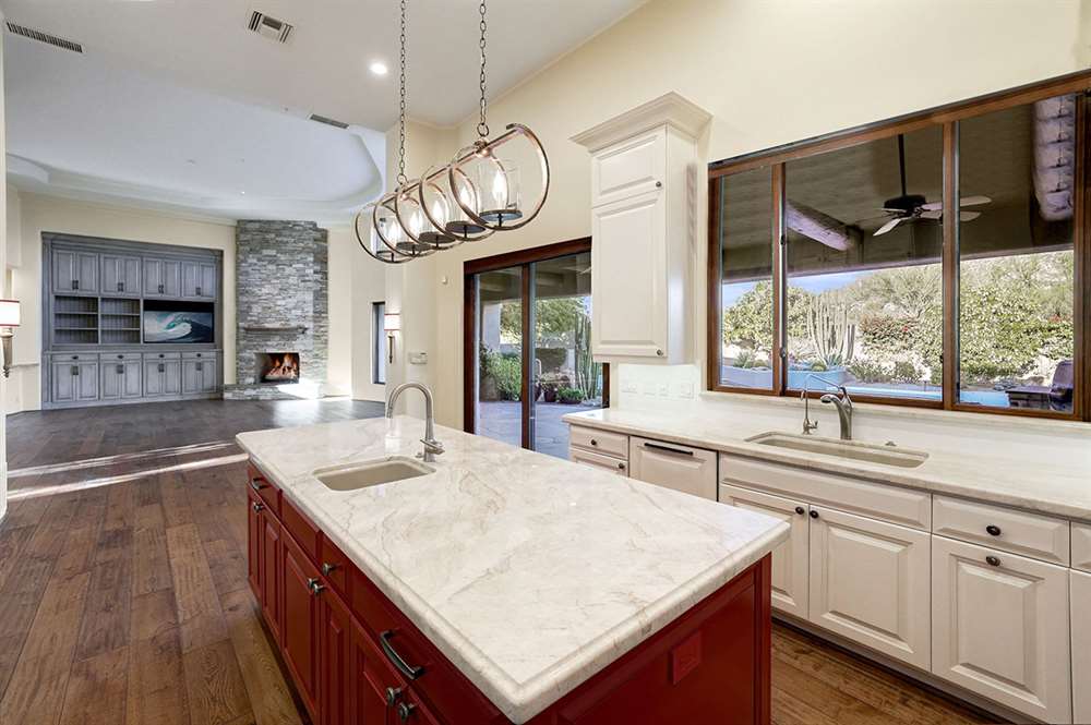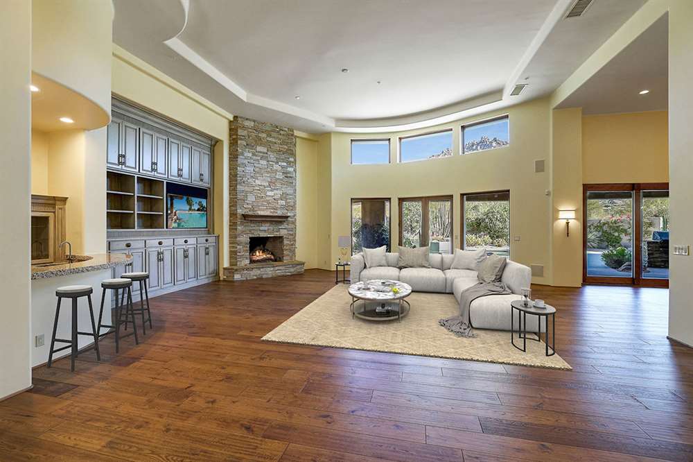 Featuring no interior steps, a large master suite, two guest rooms (one ensuite) and a separate entry attached casita for a total of four bedrooms and four baths. The kitchen has light and bright custom cabinetry, center piece accent island, stainless steel high end appliances, accent tile backsplash and overlooks the backyard and the great room with wet bar, stacked stone fireplace, and gorgeous built-ins.