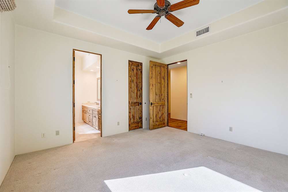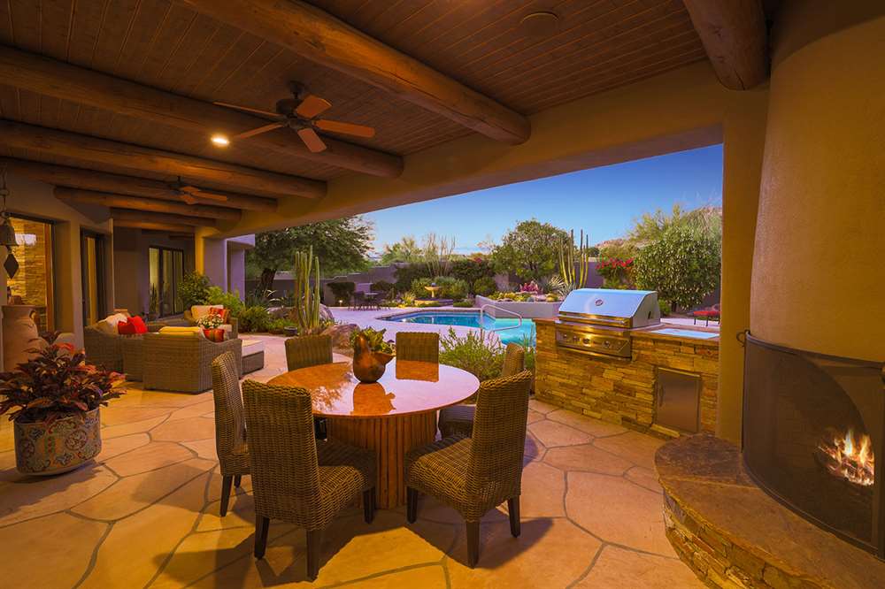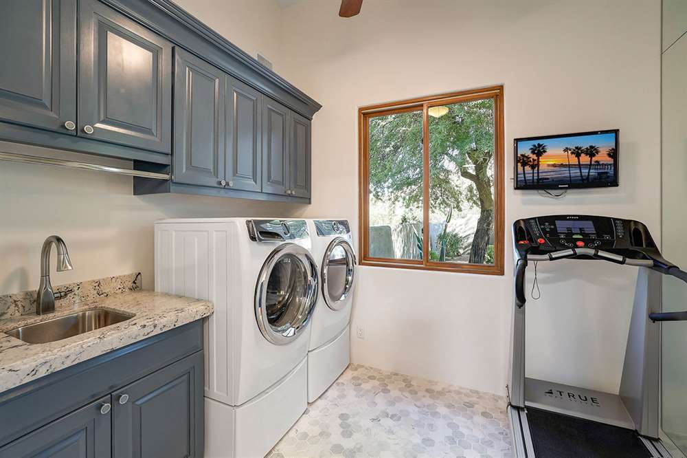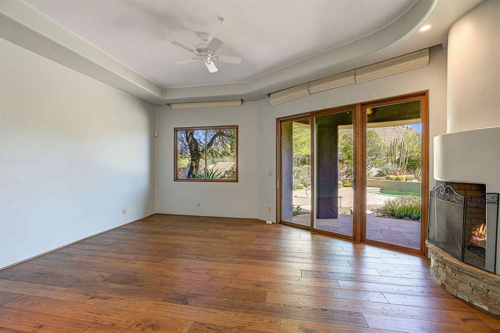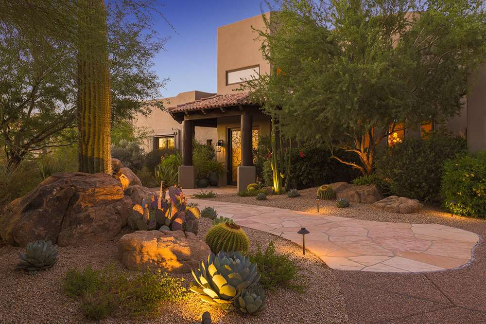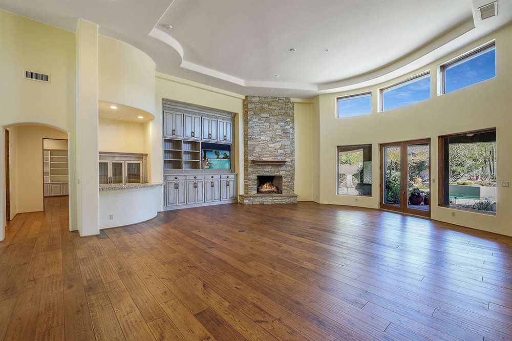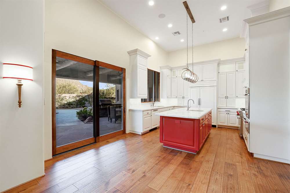 Featuring no interior steps, a large master suite, two guest rooms (one ensuite) and a separate entry attached casita for a total of four bedrooms and four baths. The kitchen has light and bright custom cabinetry, center piece accent island, stainless steel high end appliances, accent tile backsplash and overlooks the backyard and the great room with wet bar, stacked stone fireplace, and gorgeous built-ins.