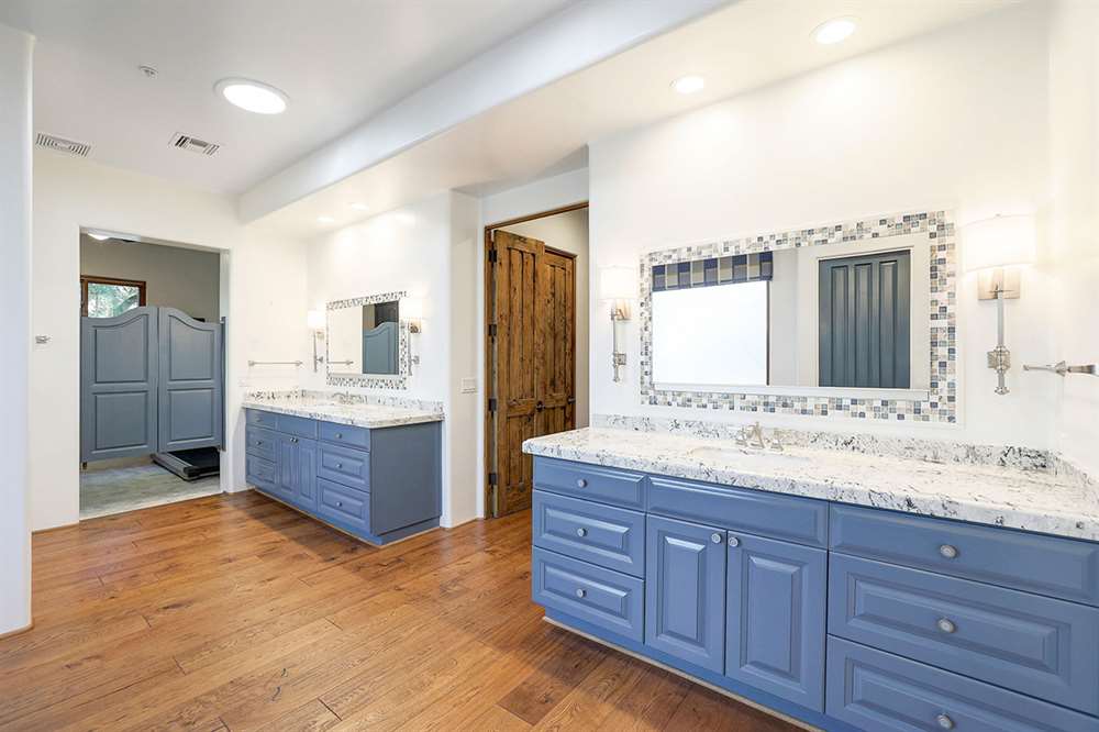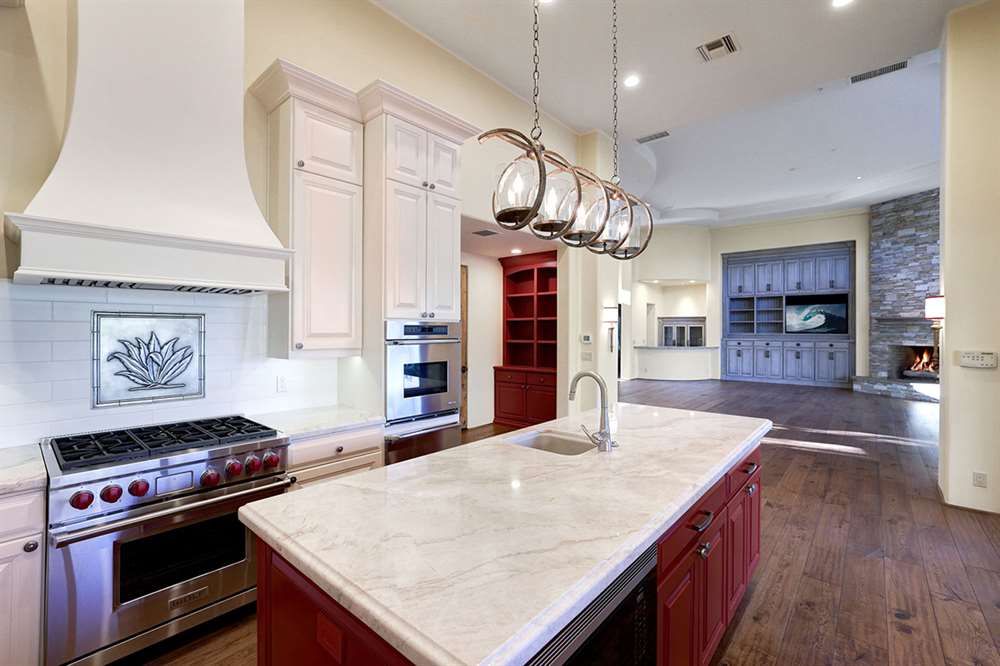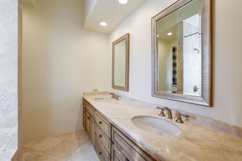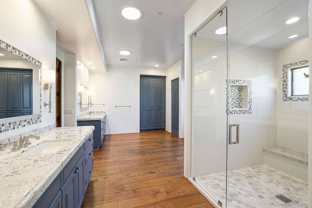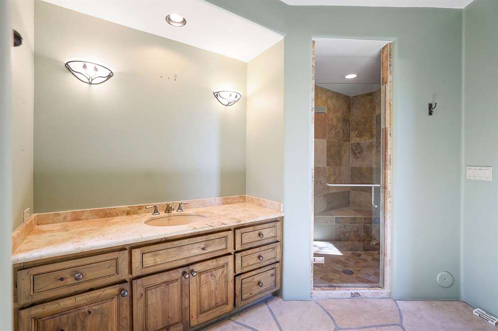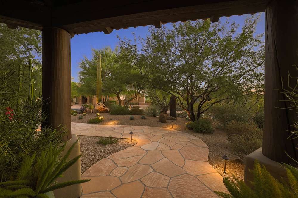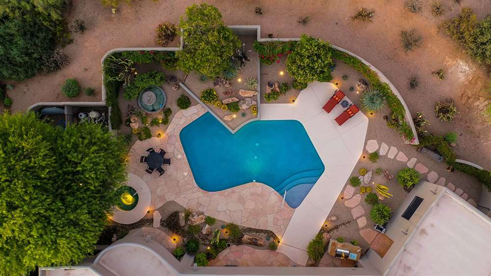 Featuring no interior steps, a large master suite, two guest rooms (one ensuite) and a separate entry attached casita for a total of four bedrooms and four baths. The kitchen has light and bright custom cabinetry, center piece accent island, stainless steel high end appliances, accent tile backsplash and overlooks the backyard and the great room with wet bar, stacked stone fireplace, and gorgeous built-ins.