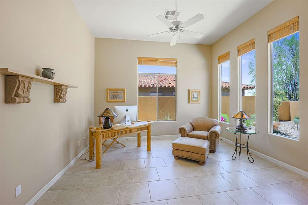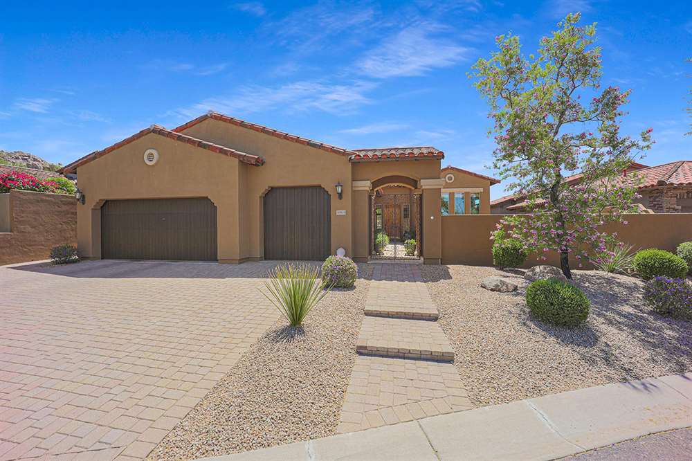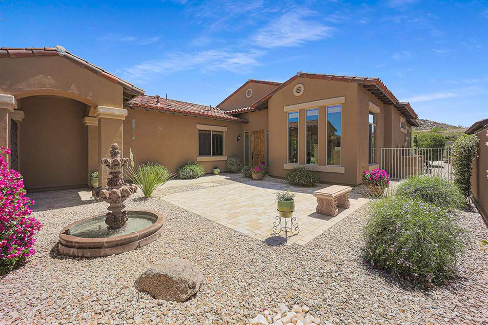 Welcome to this spacious home on an elevated lot in the gated community of Las Piedras at Sevano Village. From the moment you walk up the paver drive and walkway and enter the front courtyard with a custom wrought iron entry gate and the peaceful fountain, you will be delighted with this 3,265 square foot home. Featuring 3 en suite bedrooms plus a den and 3.5 baths all on one level. Upon entering take note of the high ceilings, travertine floors and a multitude of windows and glass doors to capture natural light throughout.