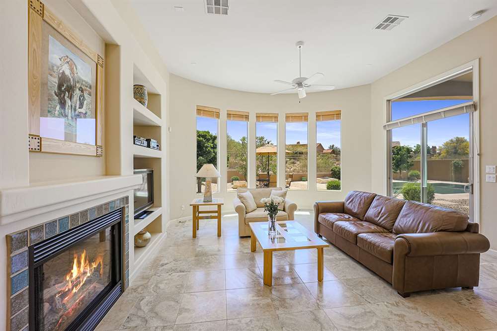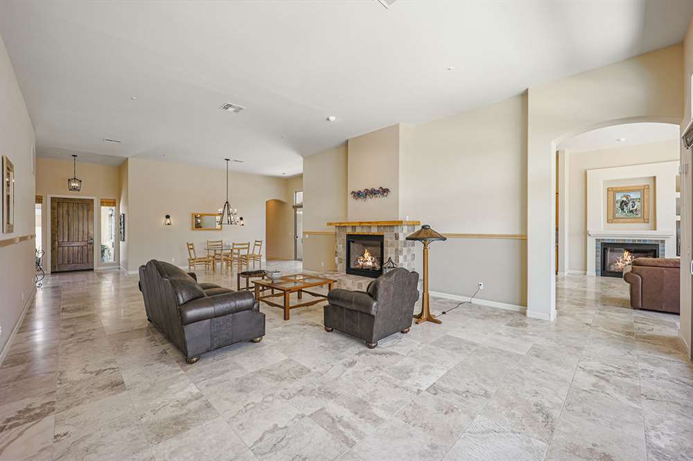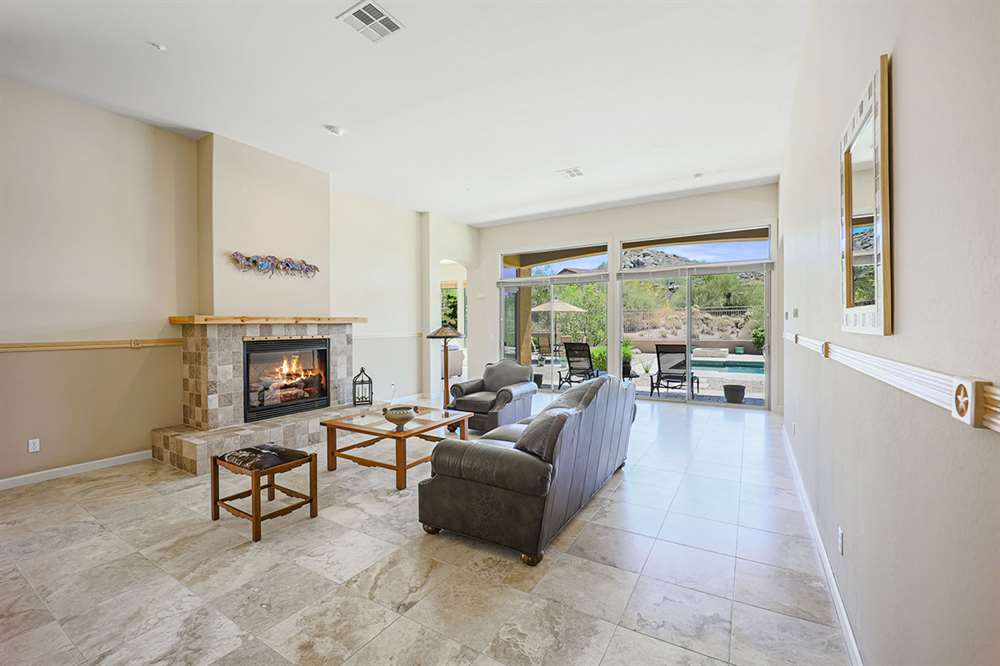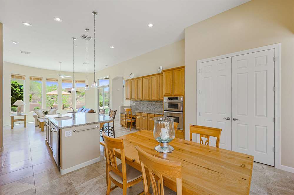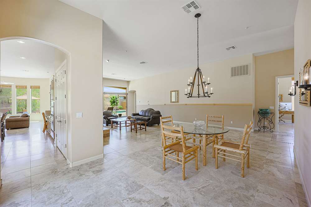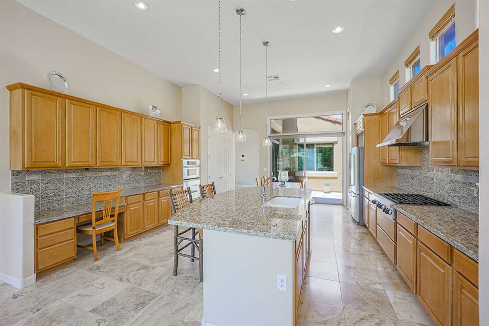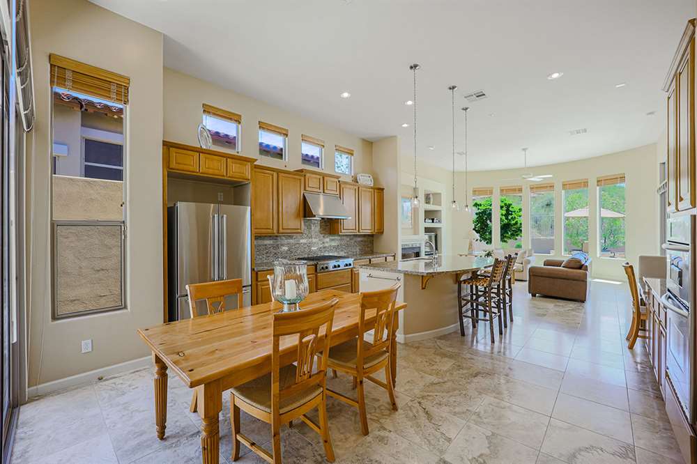The kitchen opens to the family room, with granite counters and backsplash, stainless steel appliance package, center island with sink and bar seating, built in desk, gas range, and access to a dining/breakfast courtyard to enjoy coffee in the morning or al fresco meals in the evening. The master suite has a relaxing sitting area, exterior access, centerpiece soaking tub, dual vanities, dual walk-in closets and a separate shower. Formal dining and living spaces, a three-car garage and all patios are chiseled travertine pavers. The community center rounds out this meticulous home with a pool, meeting room, fireplace, and barbecue.