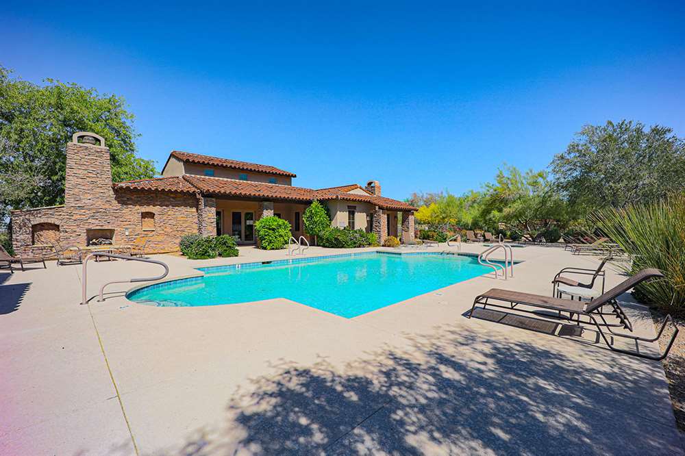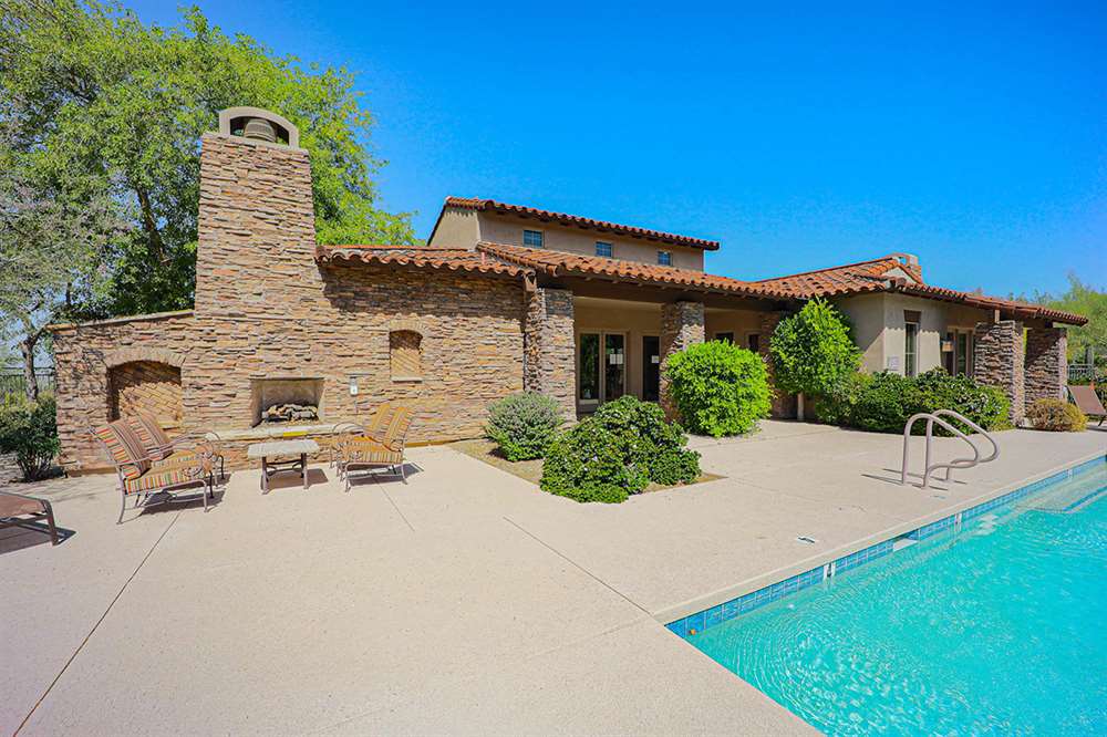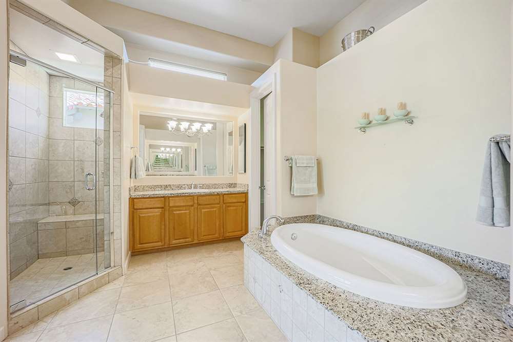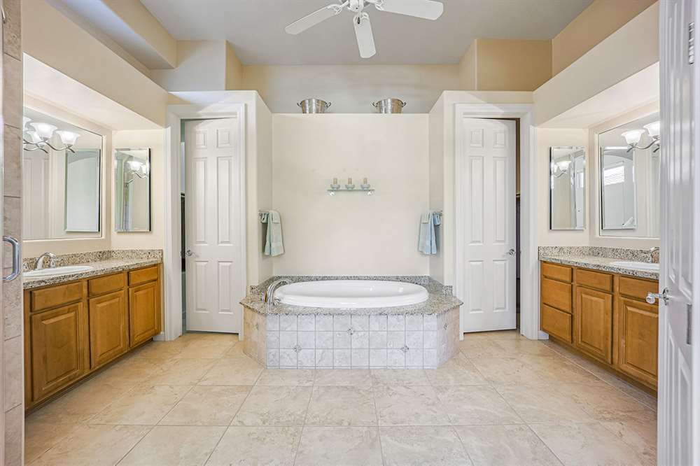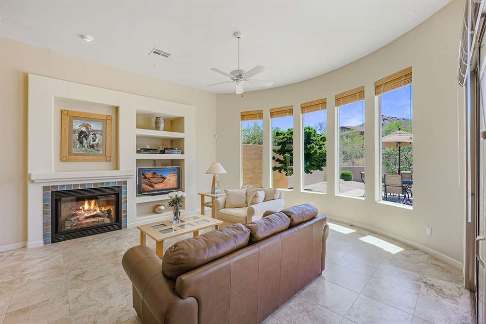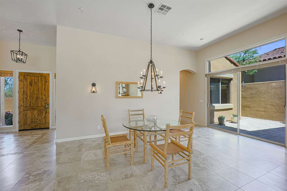 The kitchen opens to the family room, with granite counters and backsplash, stainless steel appliance package, center island with sink and bar seating, built in desk, gas range, and access to a dining/breakfast courtyard to enjoy coffee in the morning or al fresco meals in the evening. The master suite has a relaxing sitting area, exterior access, centerpiece soaking tub, dual vanities, dual walk-in closets and a separate shower. Formal dining and living spaces, a three-car garage and all patios are chiseled travertine pavers. The community center rounds out this meticulous home with a pool, meeting room, fireplace, and barbecue.