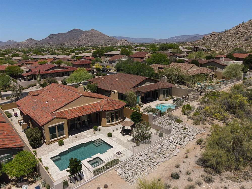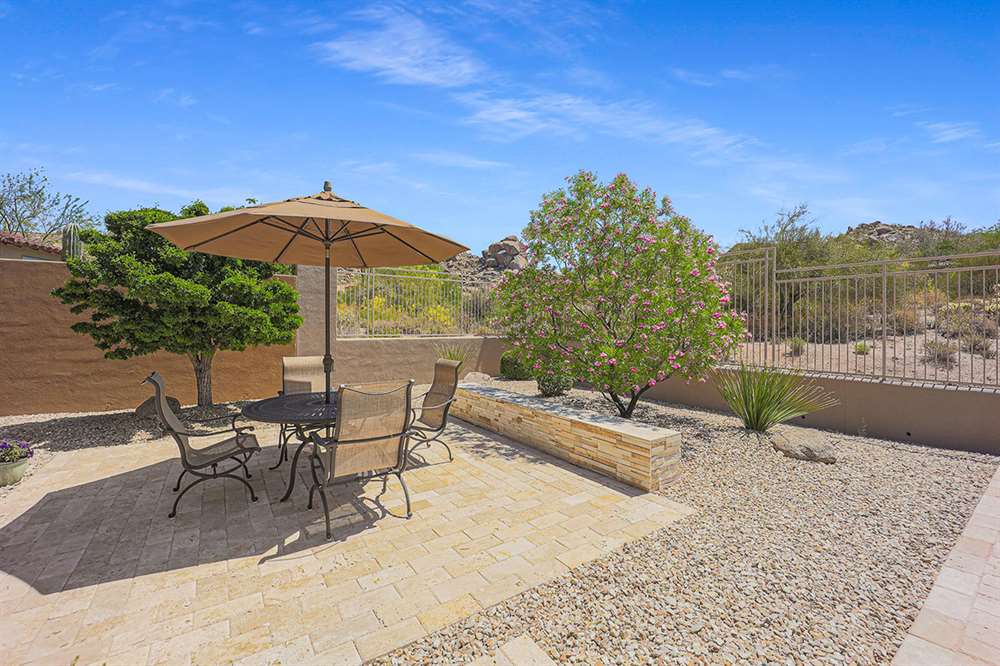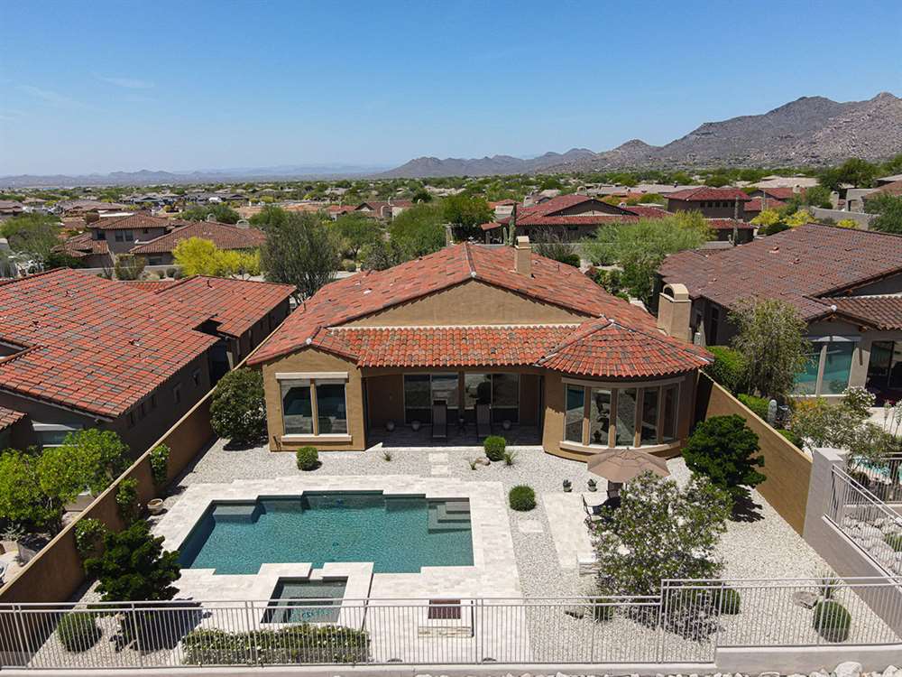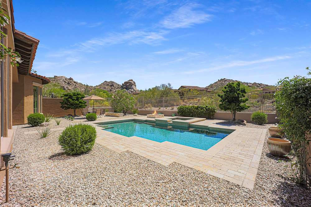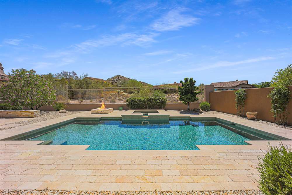 The backyard is beautifully landscaped and backs to Natural Area Open Space (NAOS) for privacy. Featuring a custom designed pool with travertine coping and travertine deck surround, elevated heated spa, fire pit, covered patio, and separate lounge/dining area.