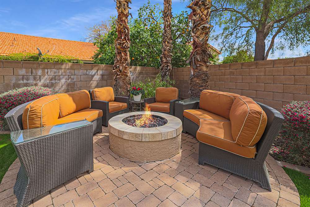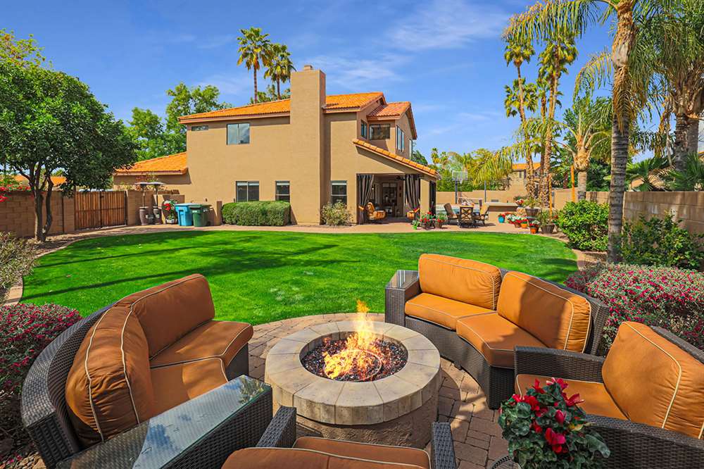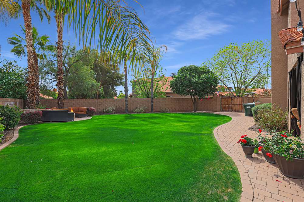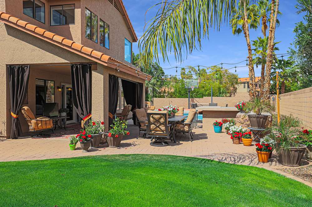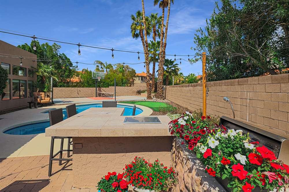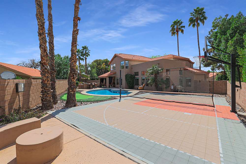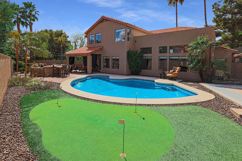 The entertainer’s dream backyard features a large grassy play area, a sparkling pool, fire pit, sport court with multi-function basketball half-court and pickleball court, large paver covered patio, three-hole artificial turf putting green, and built-in high top seating area with built-in barbecue.