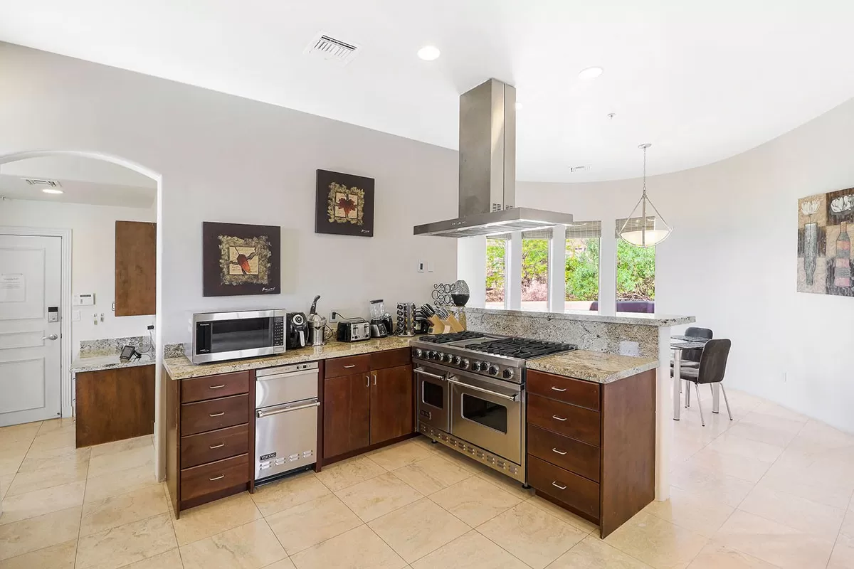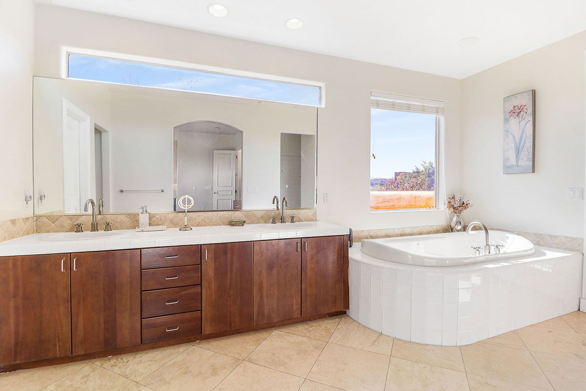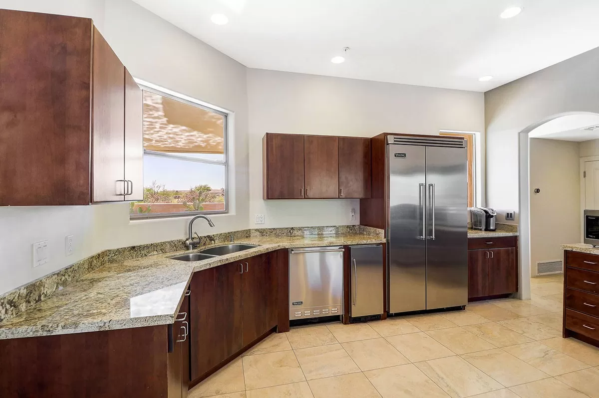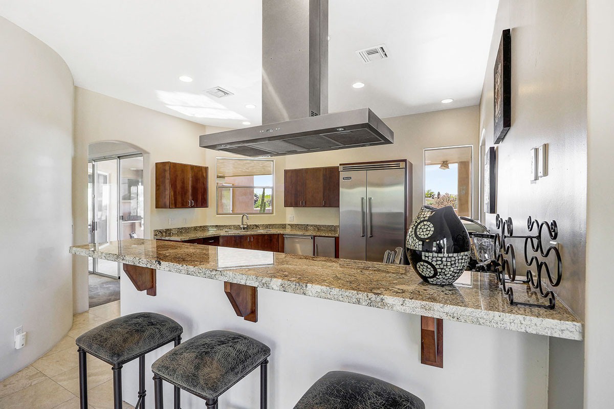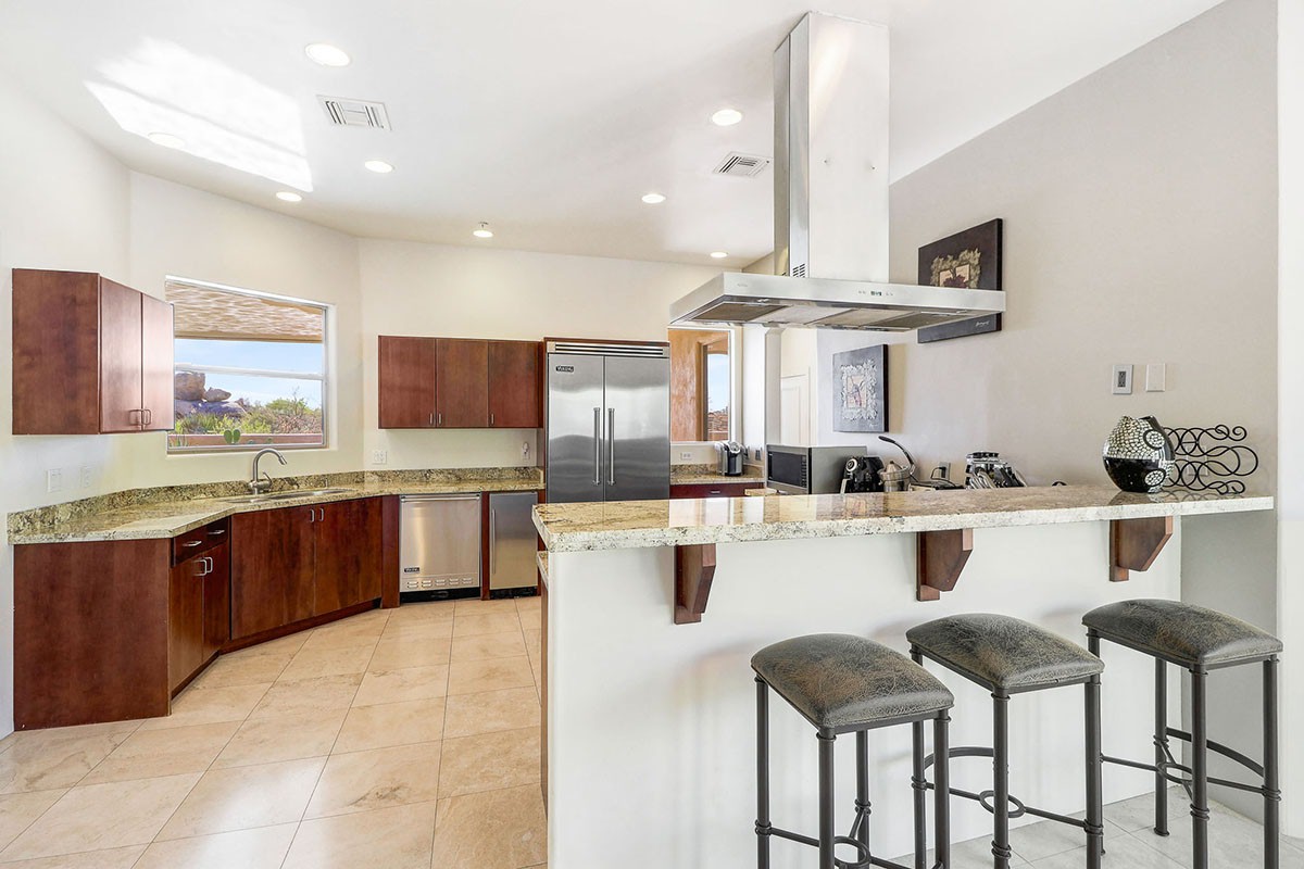 The backyard has a kiva fireplace perfect for evenings outside, built-in barbecue and mountain views. The kitchen has cherry wood cabinetry, granite counters and stainless steel appliances.