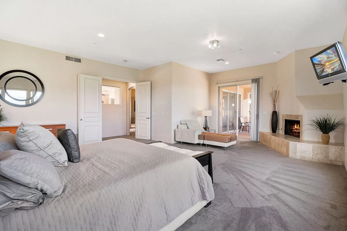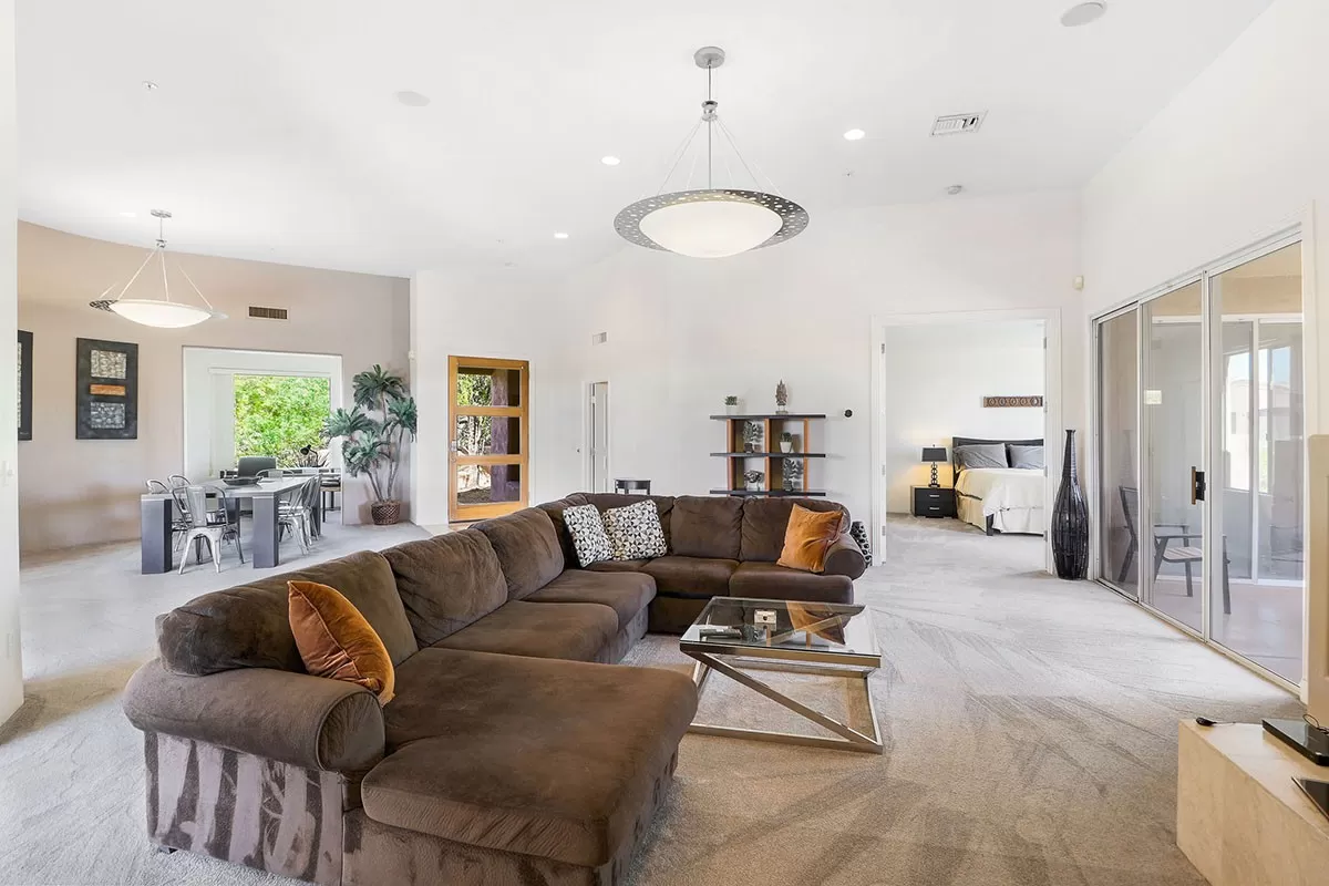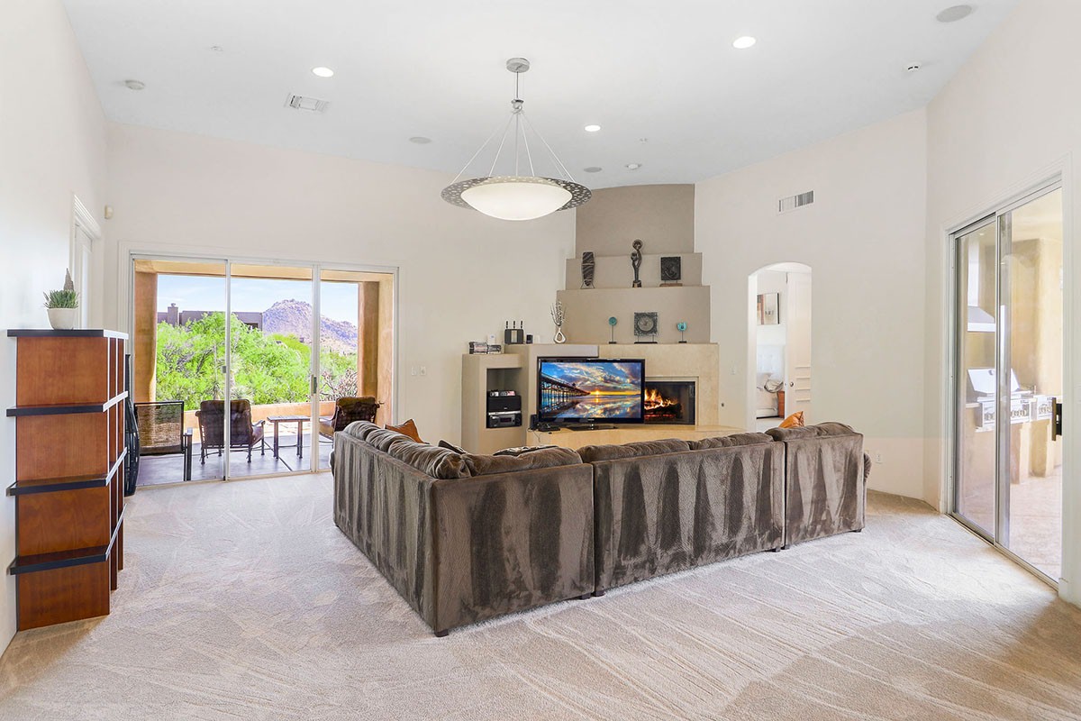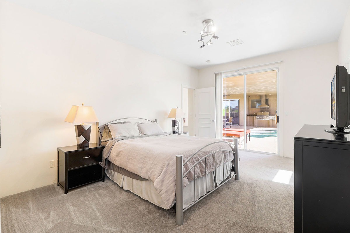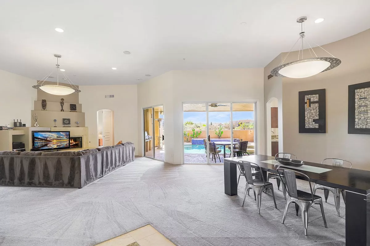 Travertine and plush carpet flooring throughout and a neutral paint palette allow for seamless decorating. The great room has a fireplace, soaring ceilings, and views of the large covered patio which overlap the pool and for a private oasis feel.