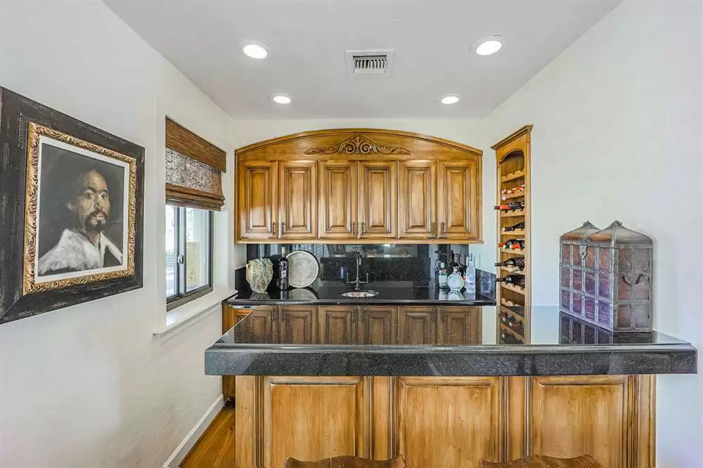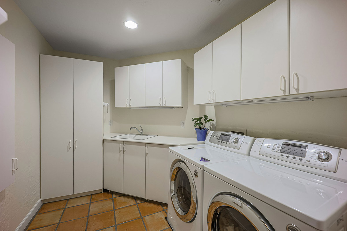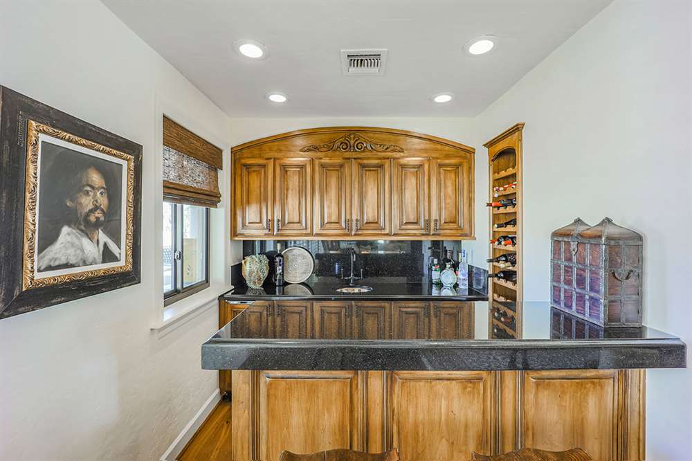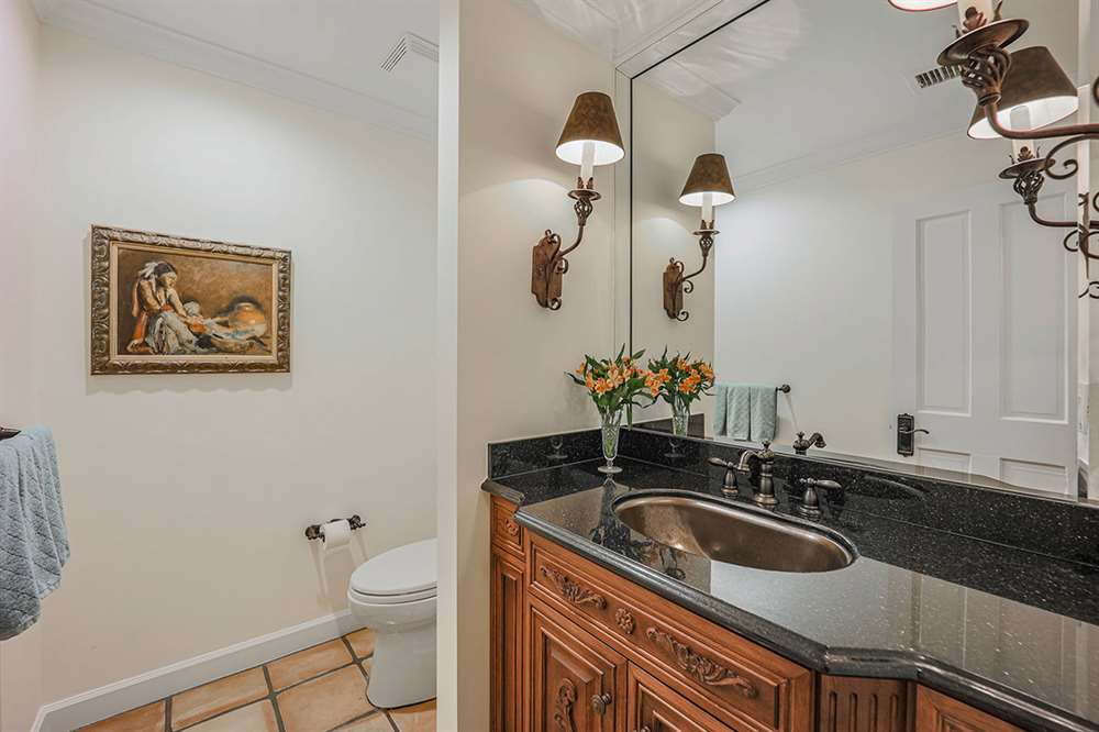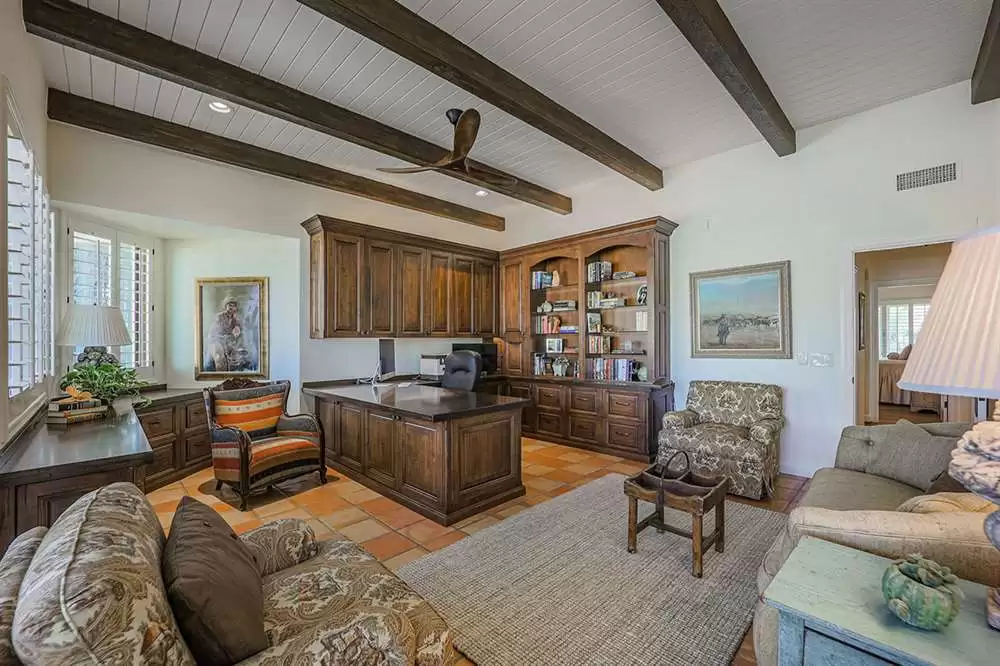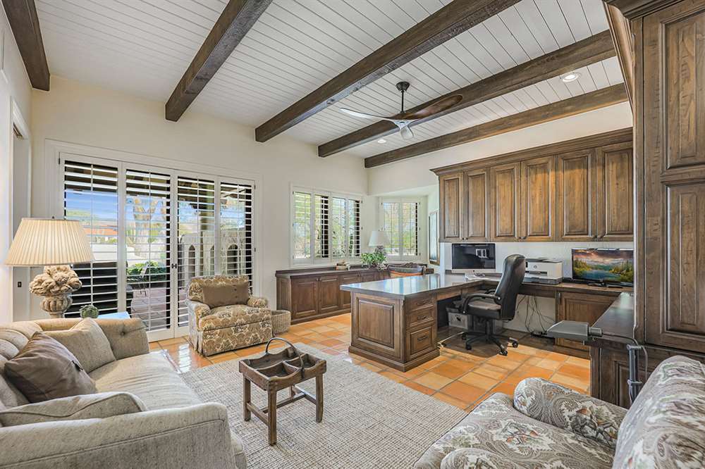 Additional living spaces include the connected family room with kiva fireplace and executive office with built-ins and pristine Saltillo floor tiles. All bedrooms are ensuite with updated remodeled baths and walk-in closets. A large laundry with sink and cabinetry is centered to be easily accessible to all bedrooms. The master suite features marble bathroom counters, two walk-in closets and private access to the back patio.