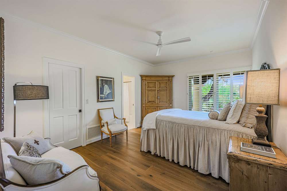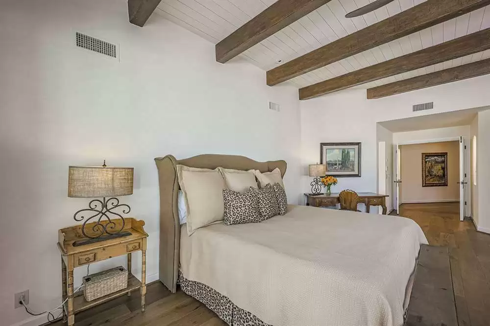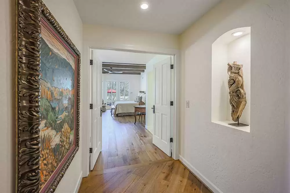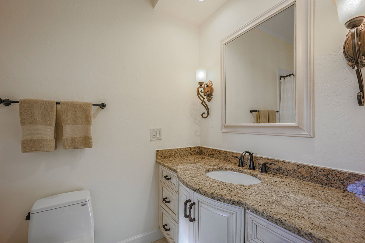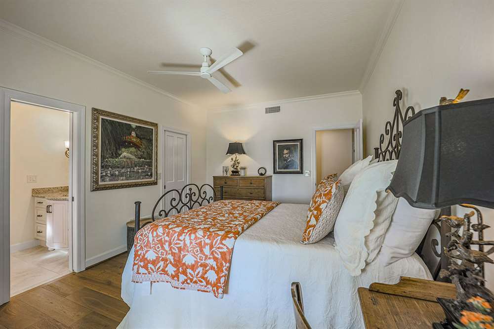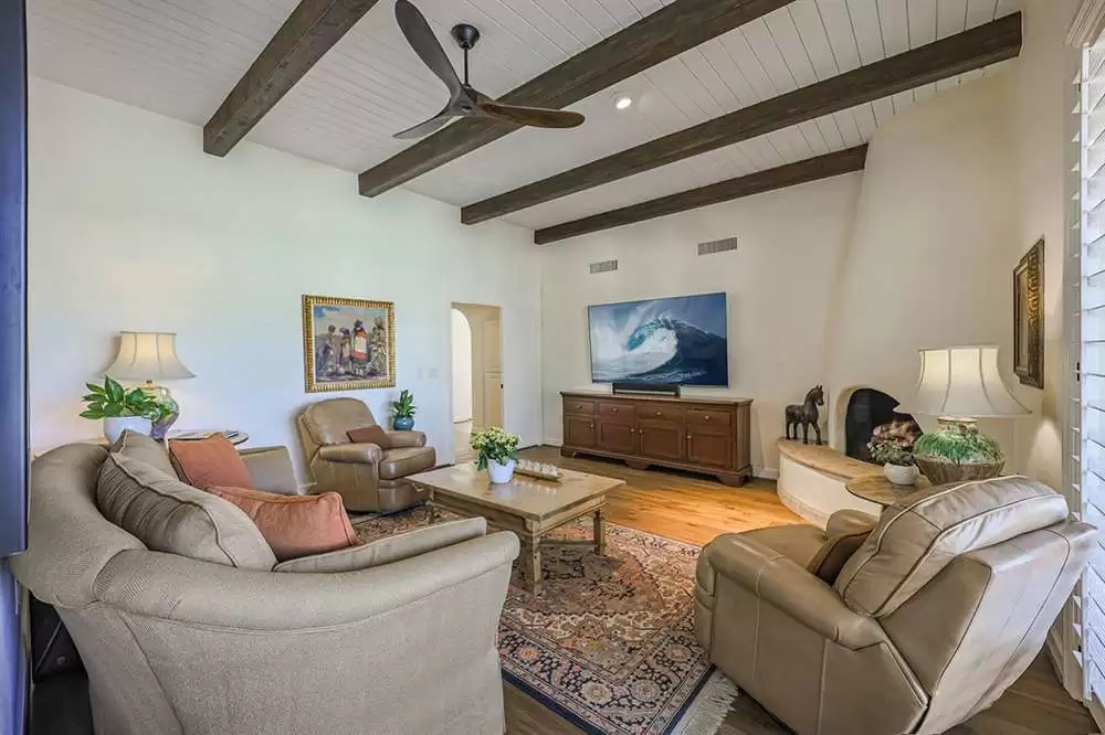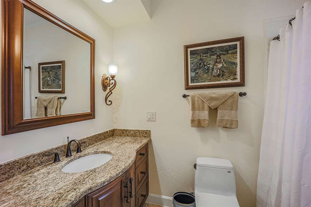 Additional living spaces include the connected family room with kiva fireplace and executive office with built-ins and pristine Saltillo floor tiles. All bedrooms are ensuite with updated remodeled baths and walk-in closets. A large laundry with sink and cabinetry is centered to be easily accessible to all bedrooms. The master suite features marble bathroom counters, two walk-in closets and private access to the back patio.