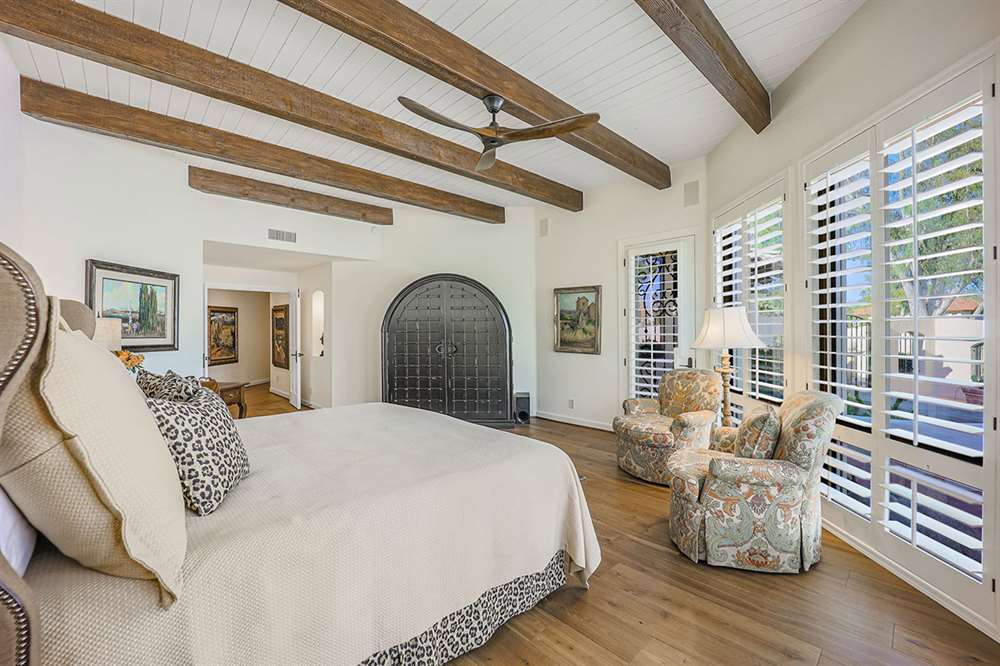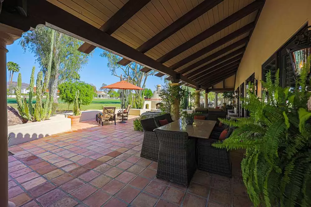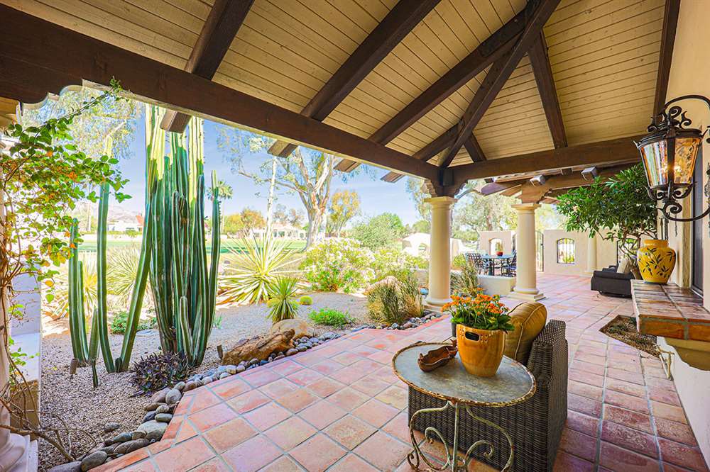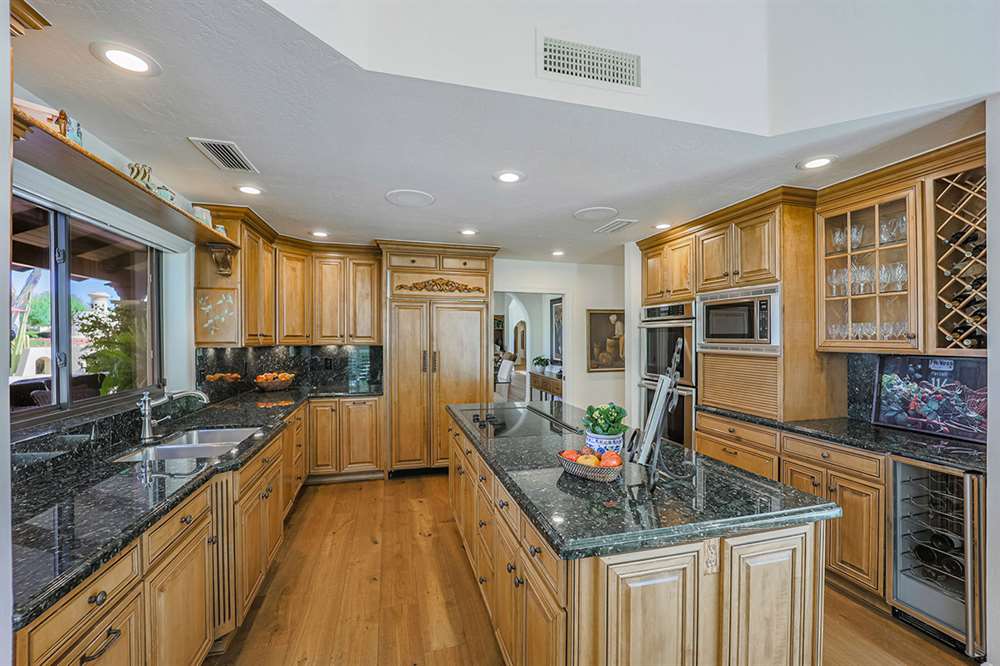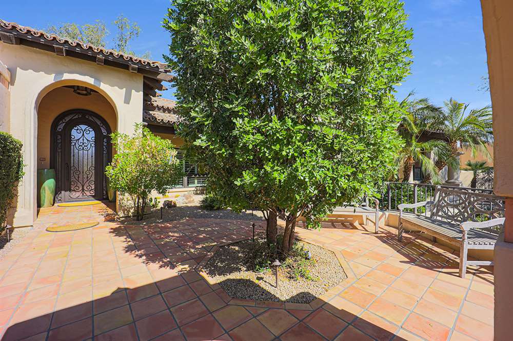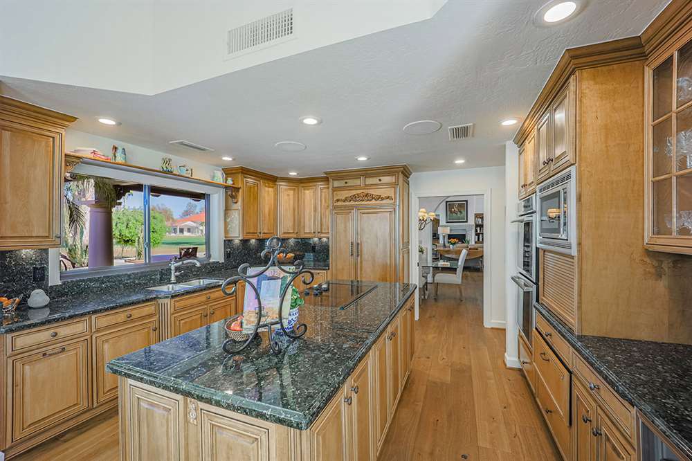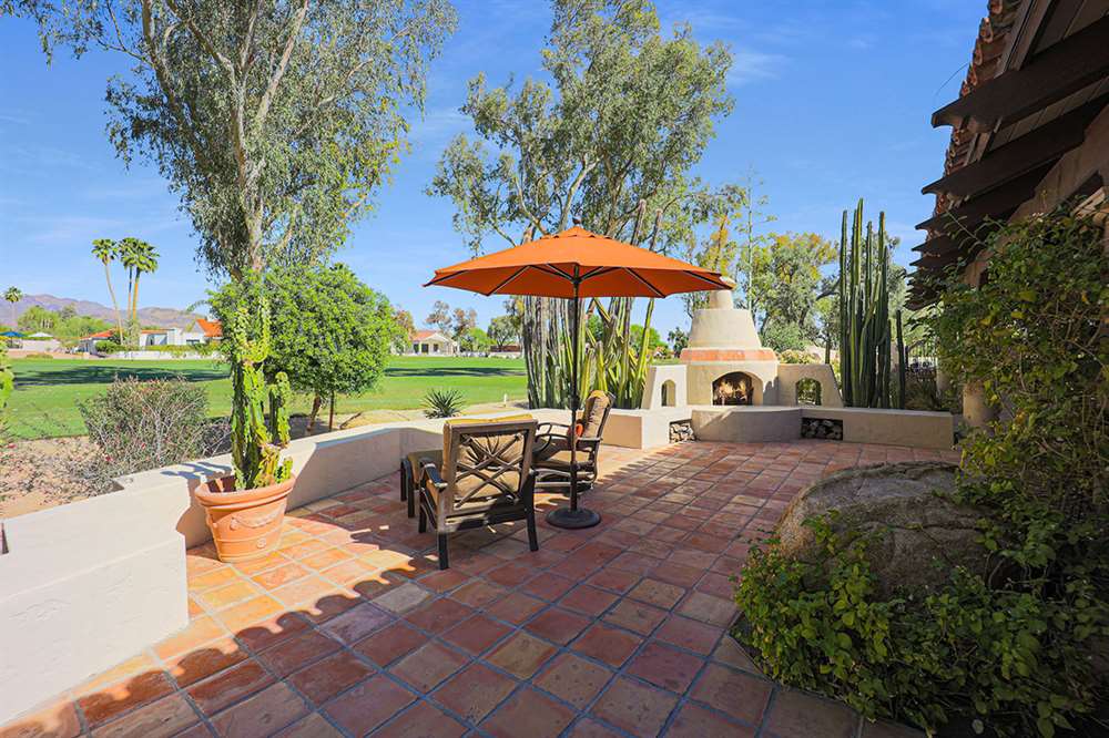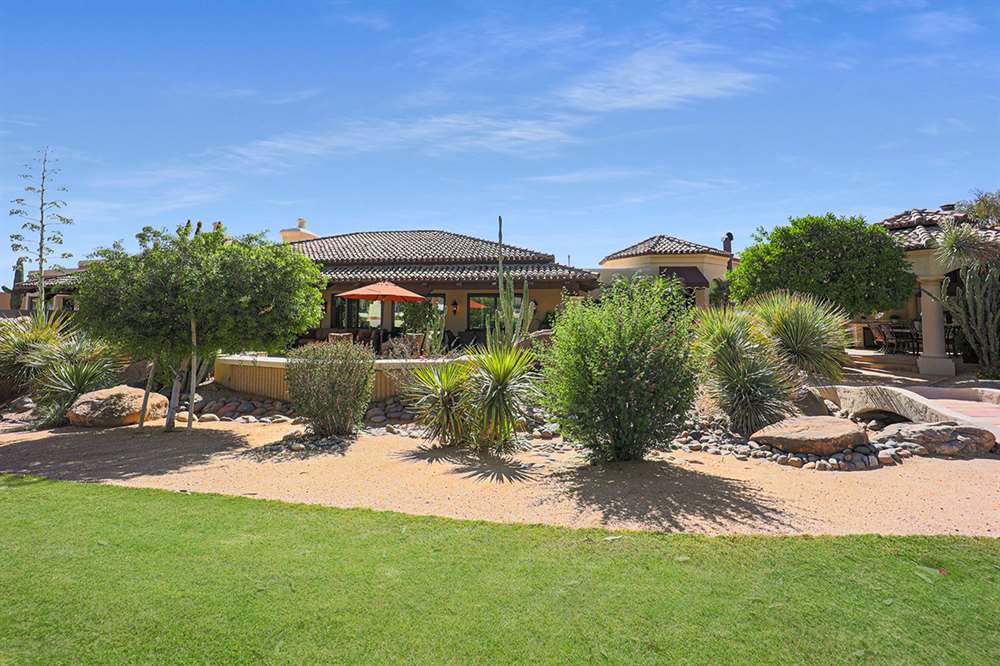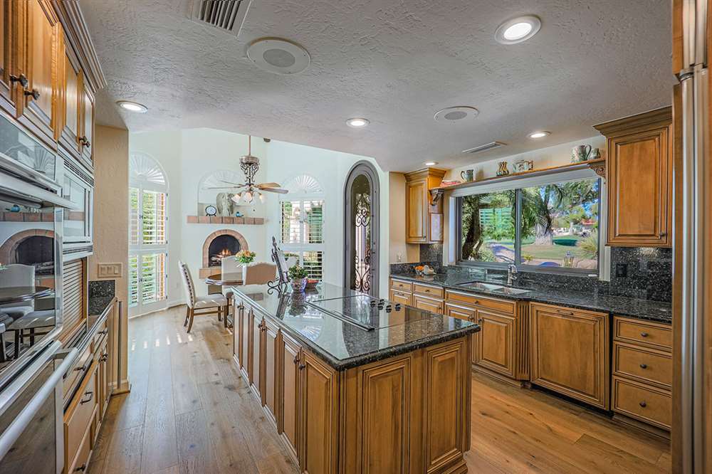 The backyard is a true outdoor living space with an extended covered patio for both seating and dining, a sun deck surrounding the spool, an exterior wood burning fireplace, and a ramada-styled outdoor kitchen with dual built-in grilles, sink, refrigerator, prep space, and dining area. The interior cul-de-sac location provides one of the rare premium extended lots with golf views that maintain privacy from the course. Other features include: plantation shutters throughout; two-car garage; room sized work spaces/storage areas off the garage entry; walking bridge to the golf-course; two custom ironworks doors with glass venting; private entry courtyard; powder bath; and so much more!