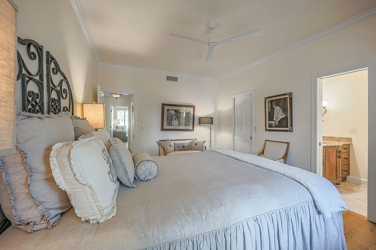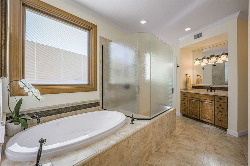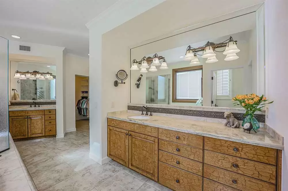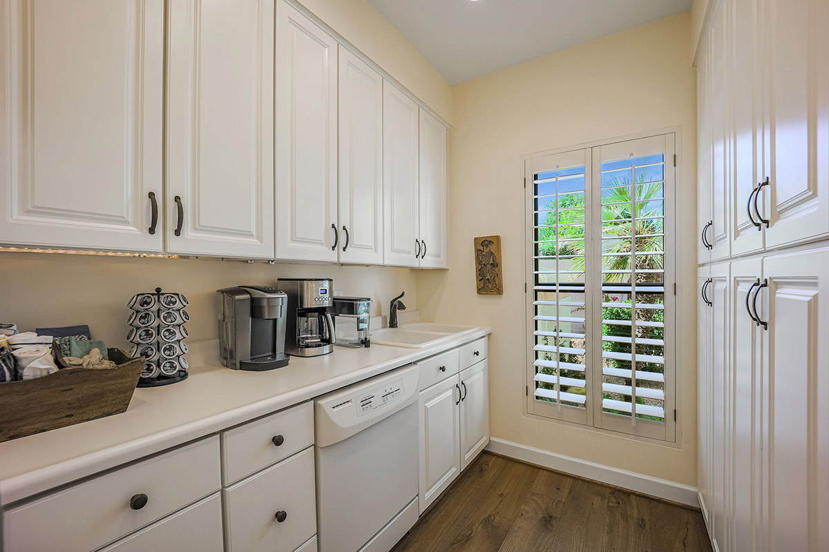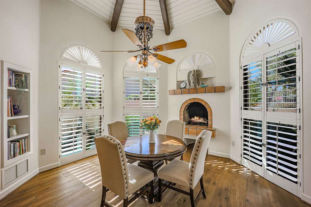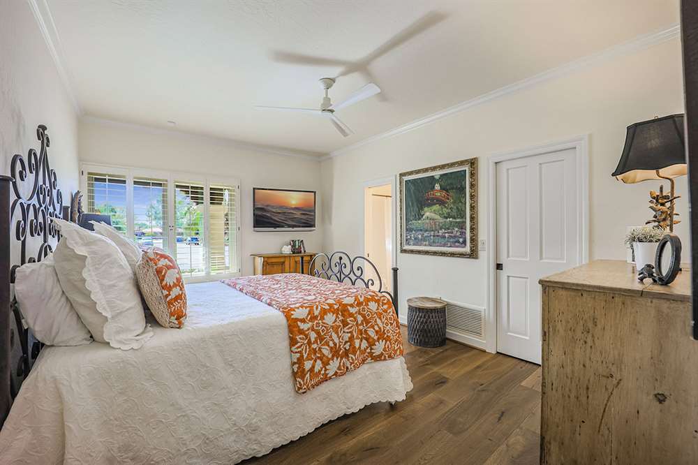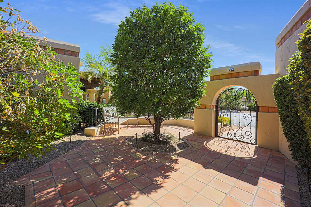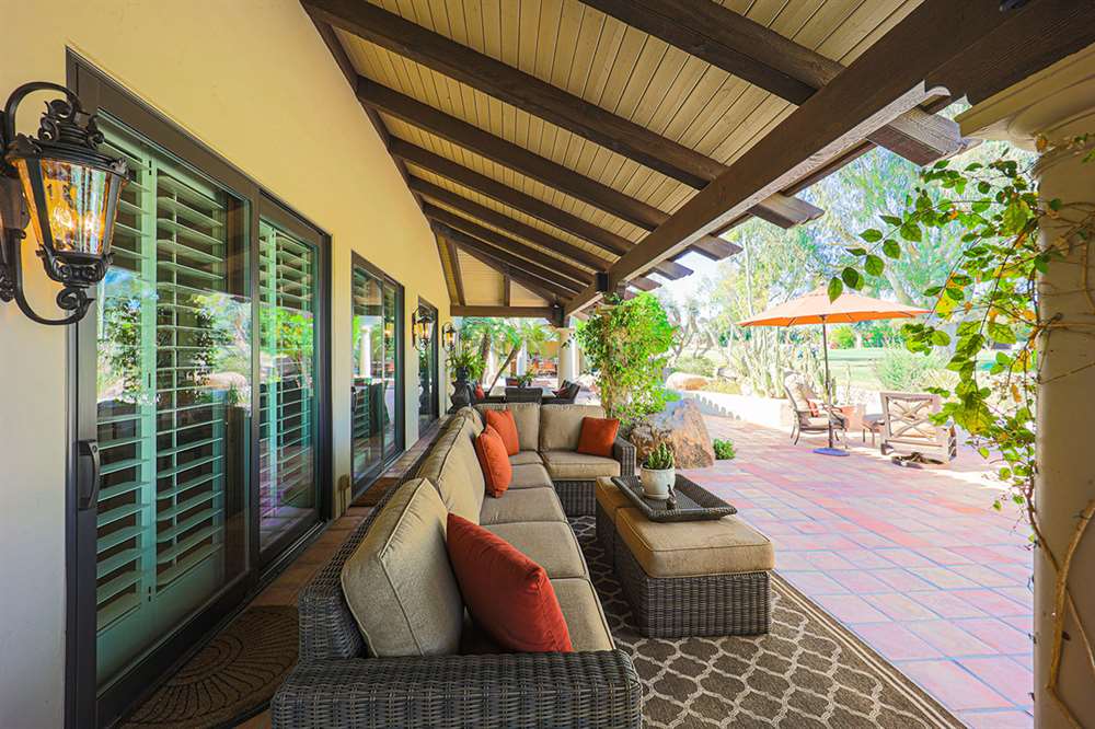The backyard is a true outdoor living space with an extended covered patio for both seating and dining, a sun deck surrounding the spool, an exterior wood burning fireplace, and a ramada-styled outdoor kitchen with dual built-in grilles, sink, refrigerator, prep space, and dining area. The interior cul-de-sac location provides one of the rare premium extended lots with golf views that maintain privacy from the course. Other features include: plantation shutters throughout; two-car garage; room sized work spaces/storage areas off the garage entry; walking bridge to the golf-course; two custom ironworks doors with glass venting; private entry courtyard; powder bath; and so much more!