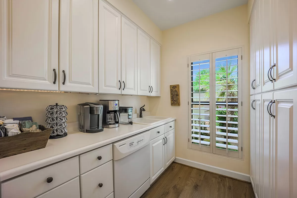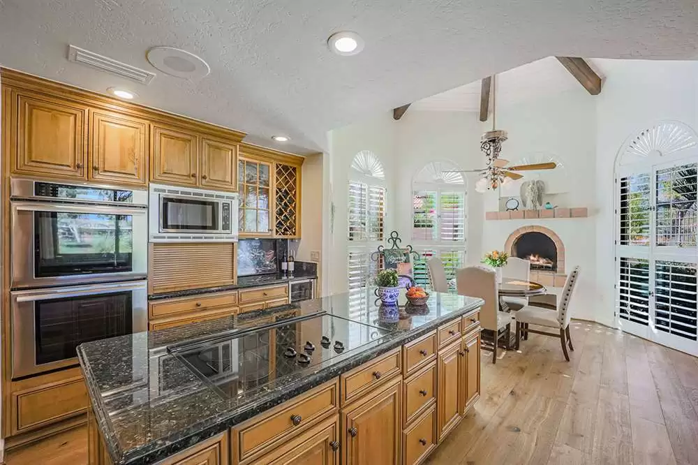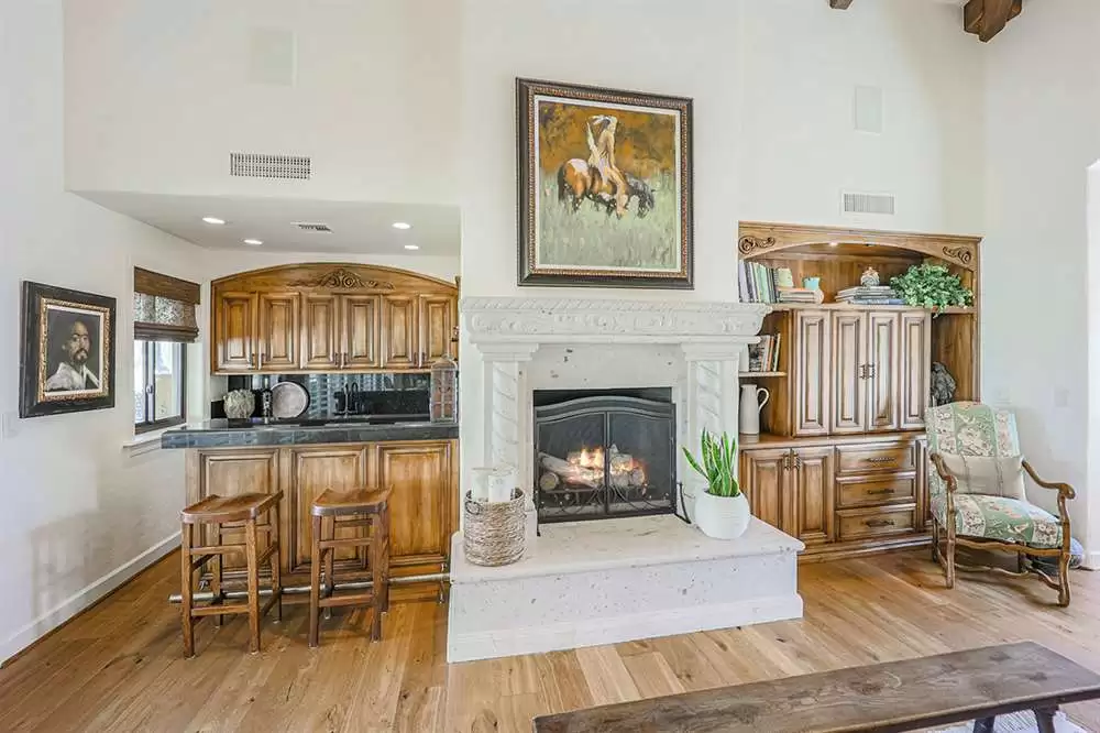The great room features a centerpiece canterra stone fireplace, full bar area that acts as the heart of the home leading you off to each of the wings of the home. The kitchen features granite counters and backsplash, center island, custom cabinetry, stainless steel double ovens and built-in microwave, wine fridge and display area, wood paneled fridge and dishwasher, all overlooking the rotunda breakfast area with exterior access and an elevated fireplace. The walk-in pantry is a separate work space with another sink and dishwasher and floor to ceiling cabinetry for maximum storage.