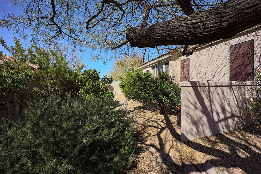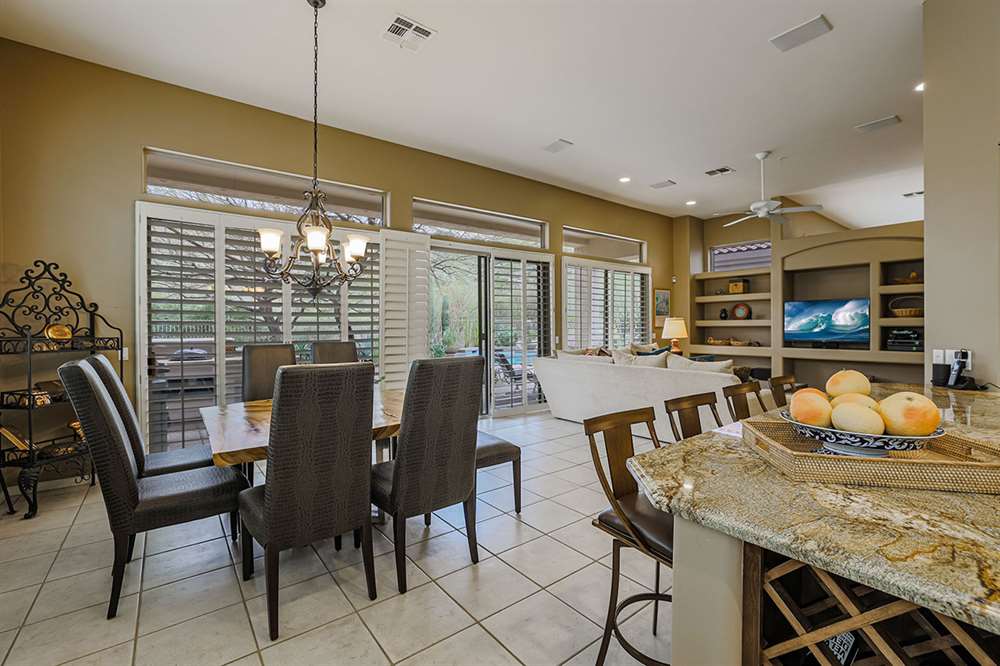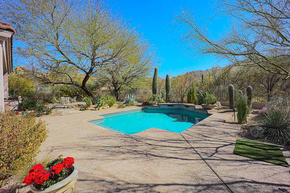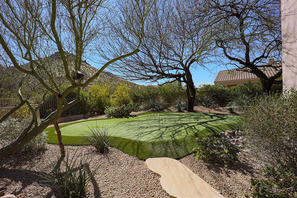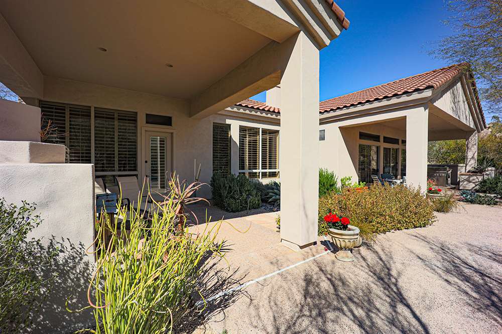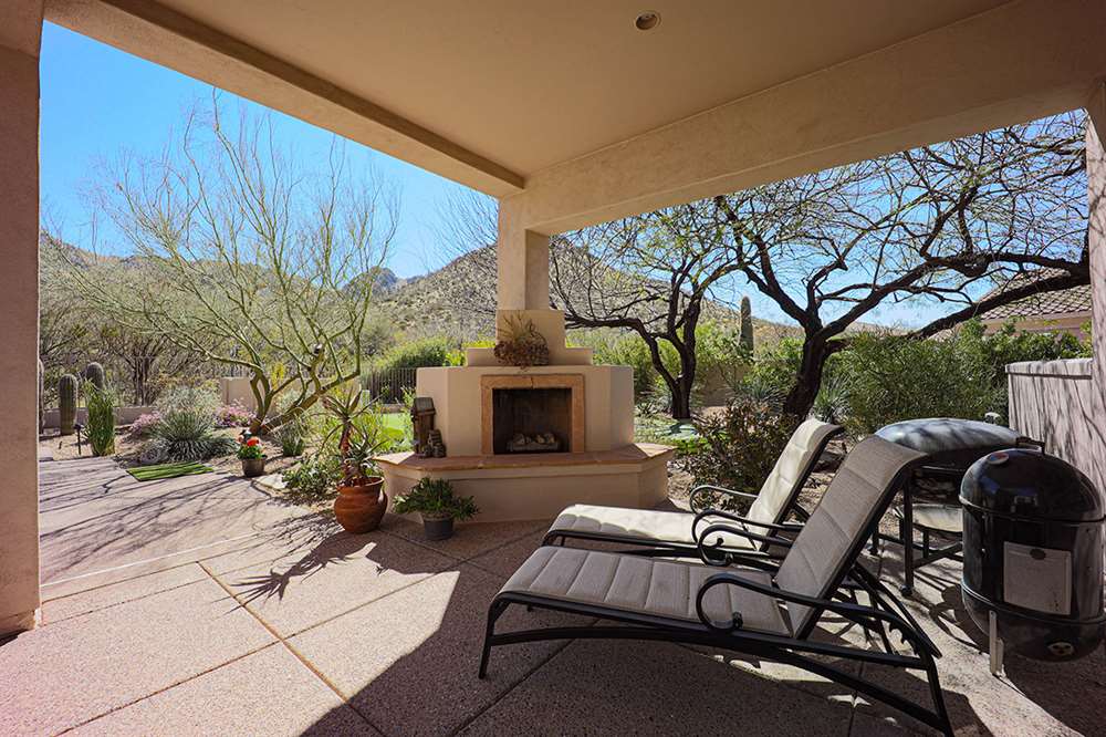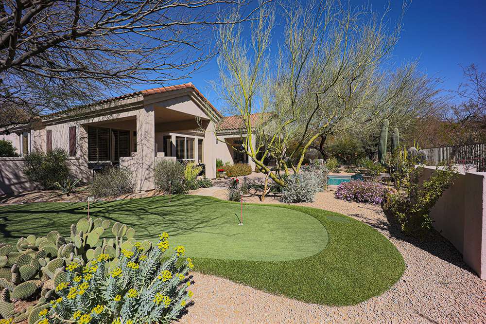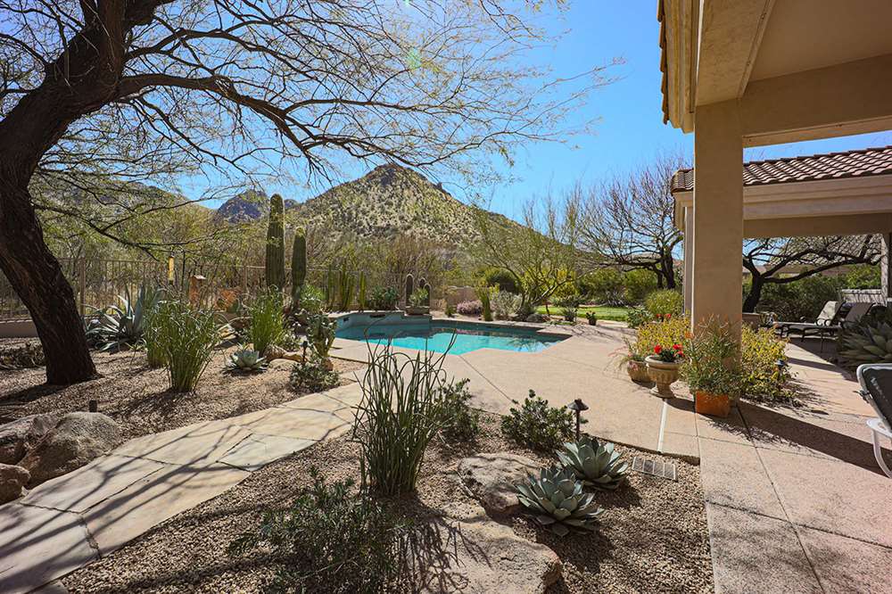 This wonderfully maintained and beautifully updated home located in Saguaro Canyon has direct views of the McDowell Mountain range and famous landmark Tom’s Thumb. The North/South facing corner lot has lush landscaping including a side yard fruit orchard and local native trees, two covered patios one with a fireplace and the other with a cooking station, a perfectly sized play pool for cooling off that is also heated, a four-hole artificial turf putting green, misting systems, and a flagstone tree covered lounge area.
