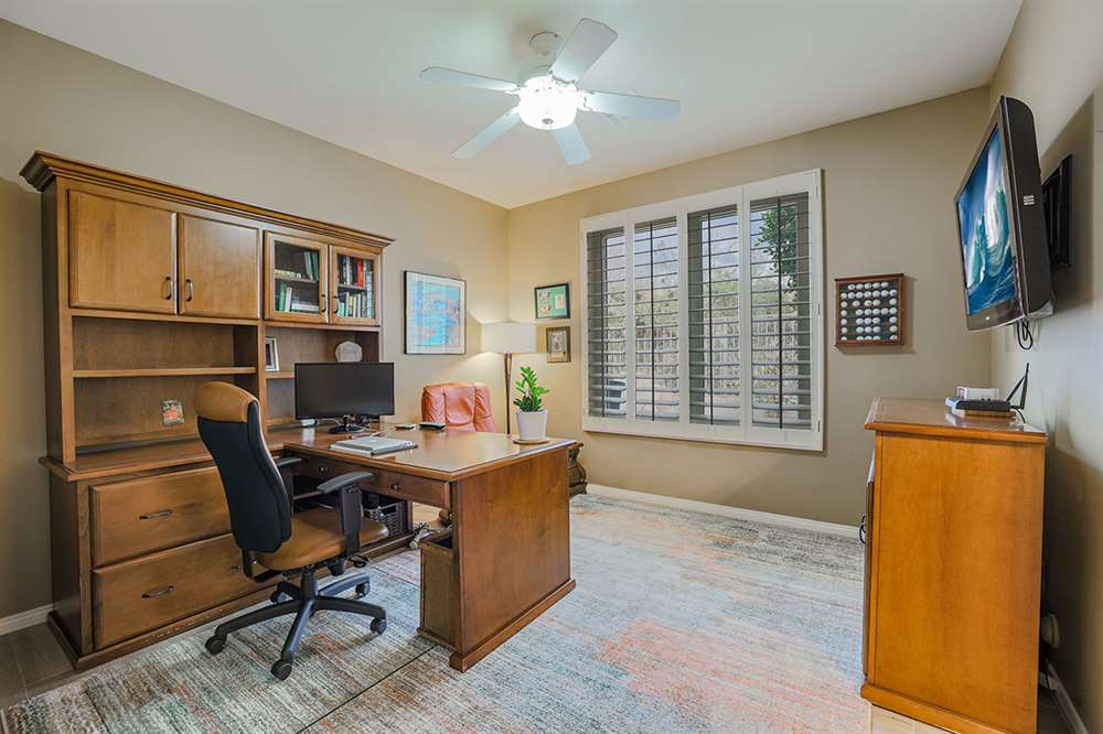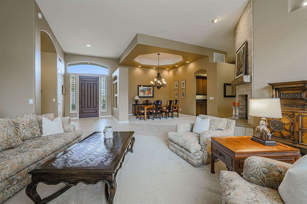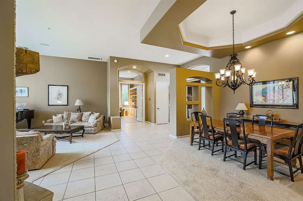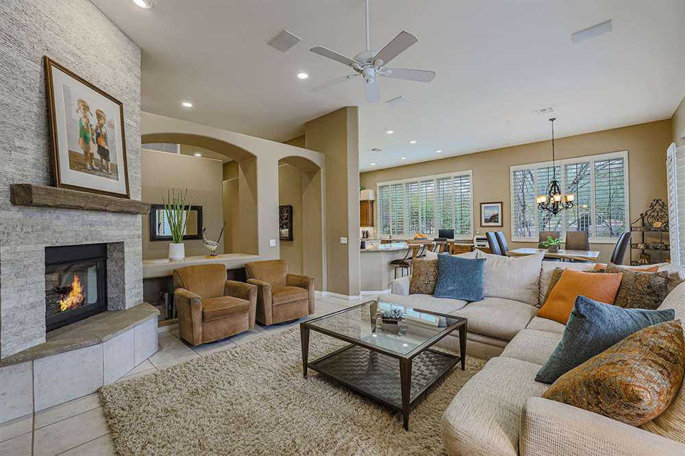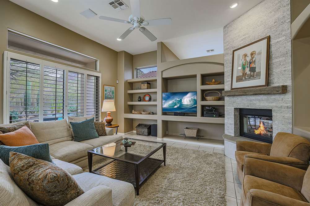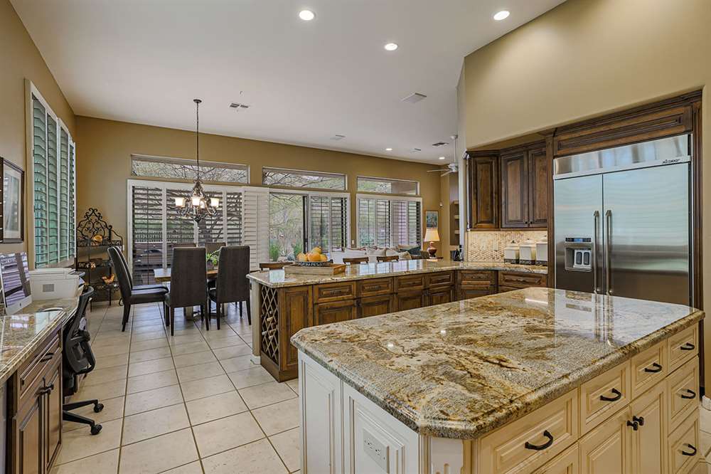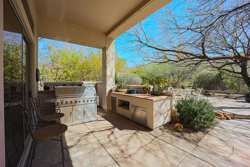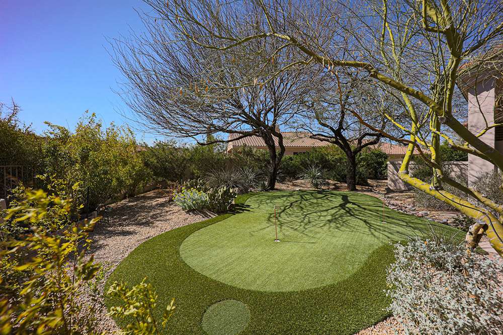 This wonderfully maintained and beautifully updated home located in Saguaro Canyon has direct views of the McDowell Mountain range and famous landmark Tom’s Thumb. The North/South facing corner lot has lush landscaping including a side yard fruit orchard and local native trees, two covered patios one with a fireplace and the other with a cooking station, a perfectly sized play pool for cooling off that is also heated, a four-hole artificial turf putting green, misting systems, and a flagstone tree covered lounge area.