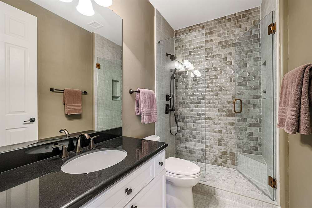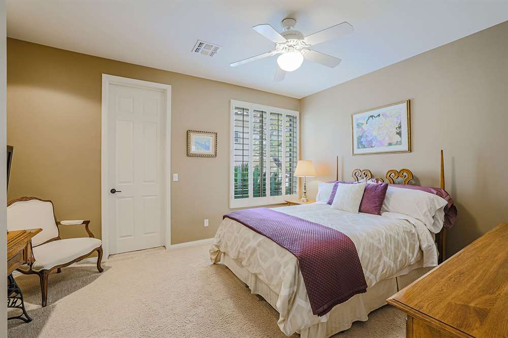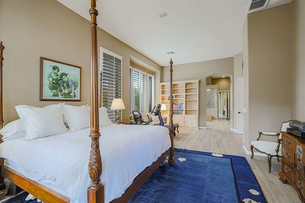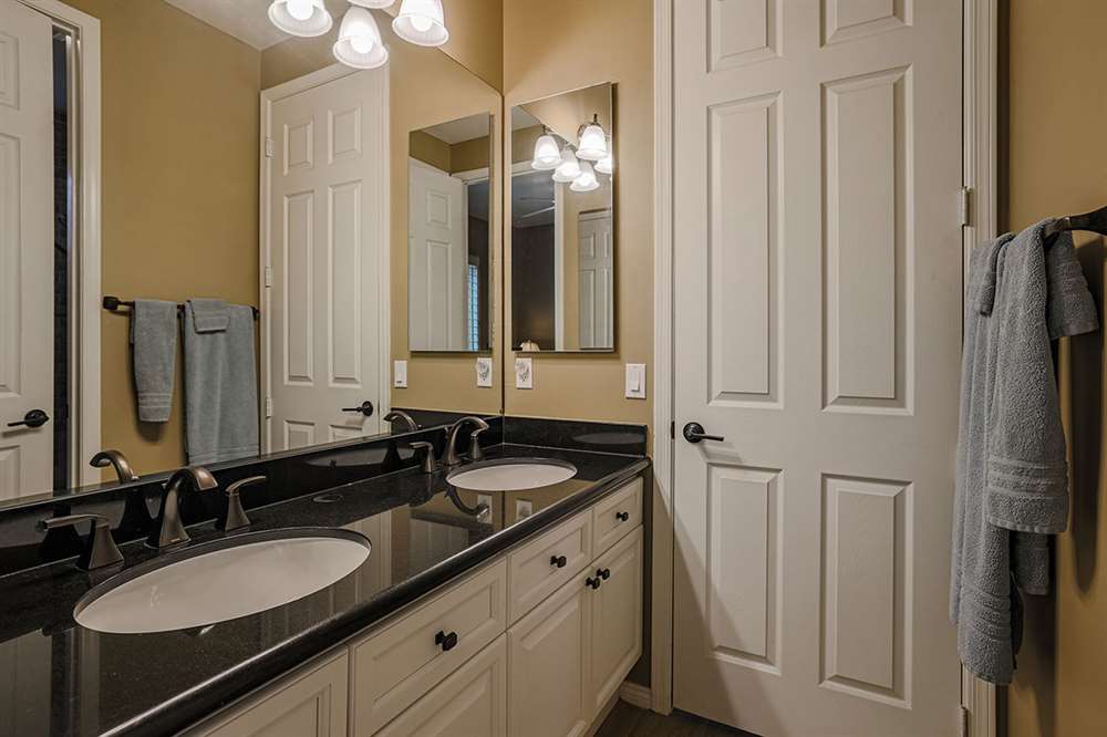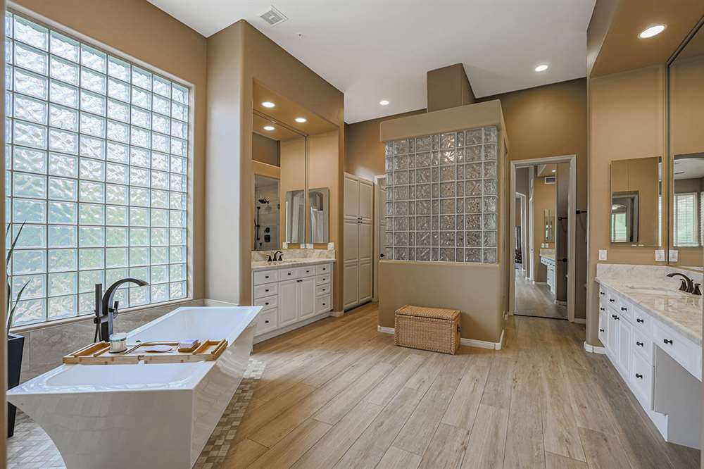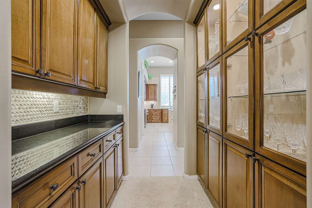 The highly desirable split floor plan has a master suite with a sitting room adjacent to the formal living and dining rooms and three additional guest suites along with the open-concept kitchen/breakfast nook/family room on the other. The master bathroom was remodeled in 2019 featuring new flooring and counters, new Toto toilet, new fixtures, large soaking tub, pass-through shower, dual vanities, and a walk-in closet. The two guest baths (one ensuite and one jack-n-jill) were also remodeled in 2019. The remodeled kitchen is exquisite with beautifully stained custom cabinetry, granite counters, stainless steel appliance package, gas stove, center island, peninsula with countertop seating, built-in desk, and a butler’s pantry with glass fronted display cabinets adjoining the dining room.