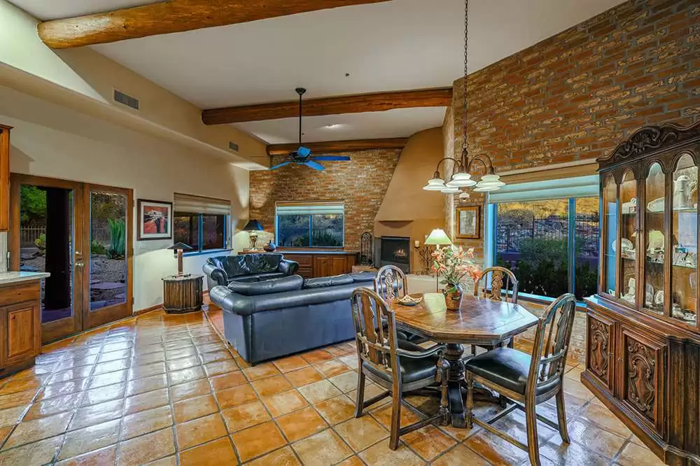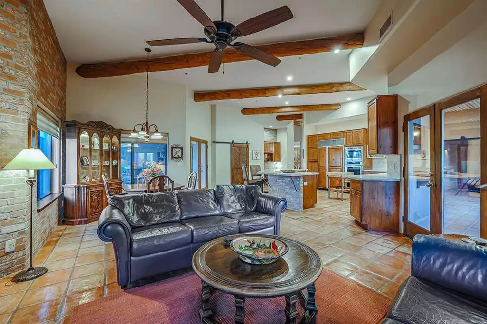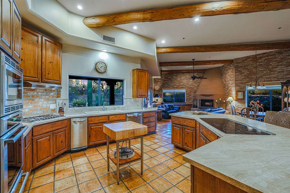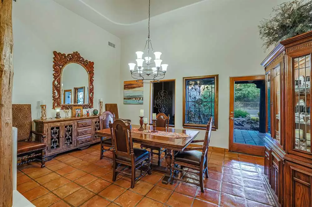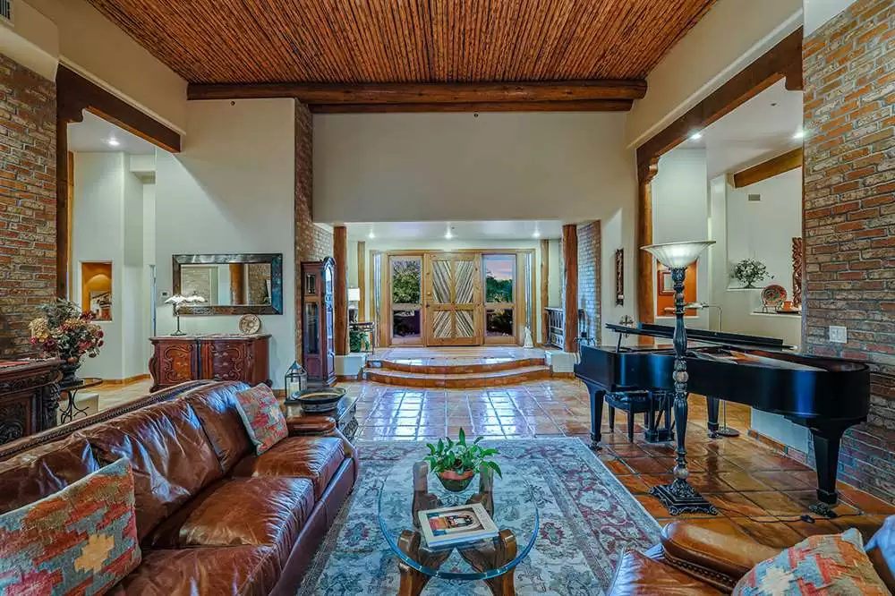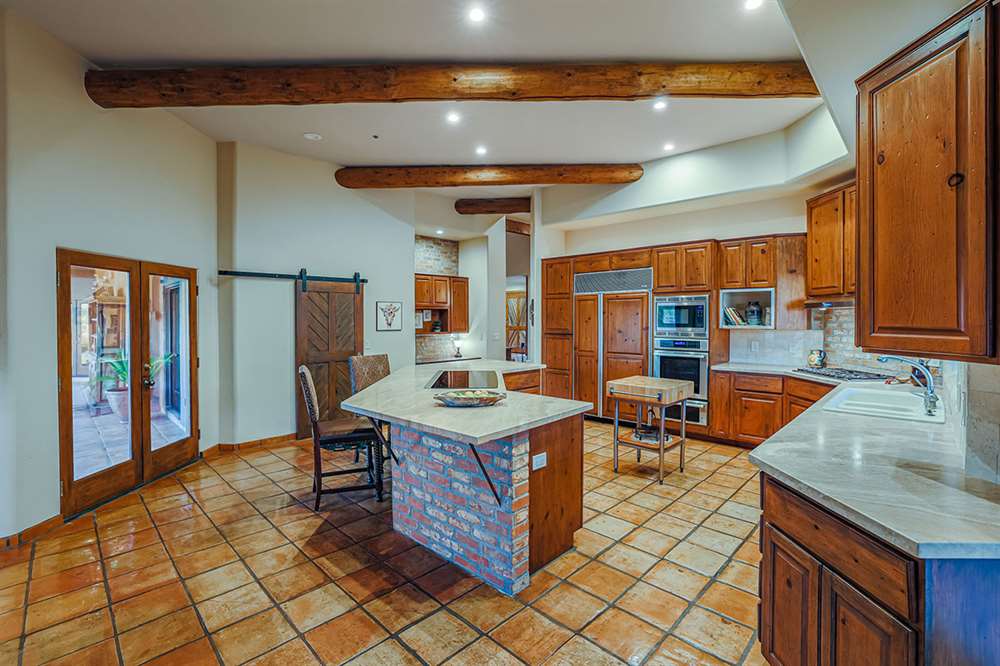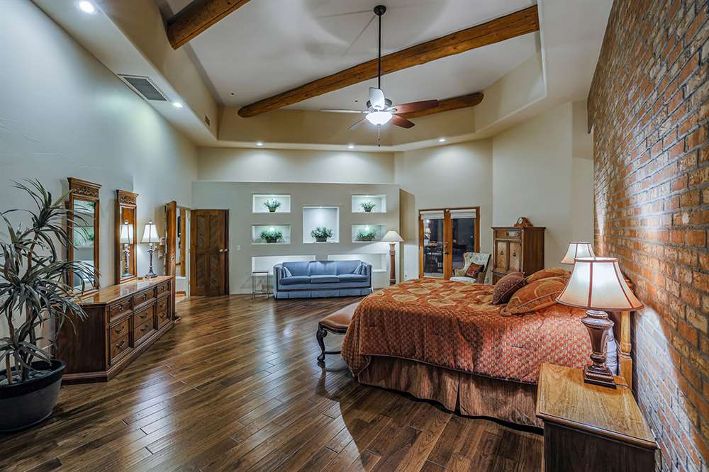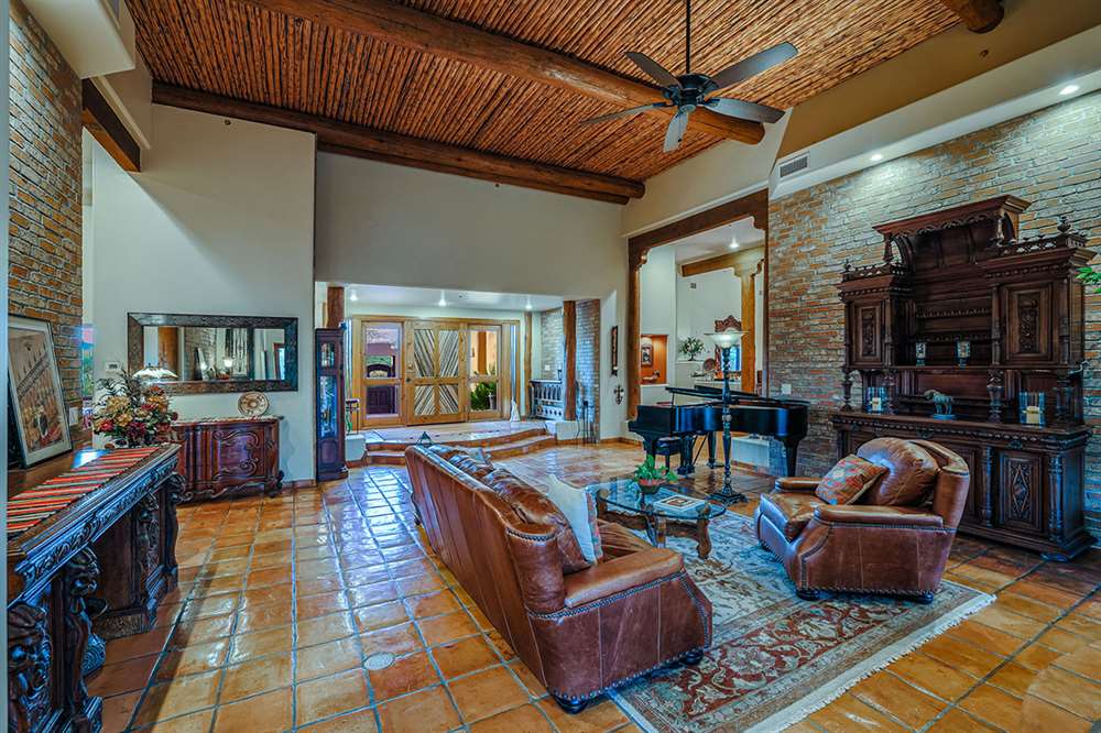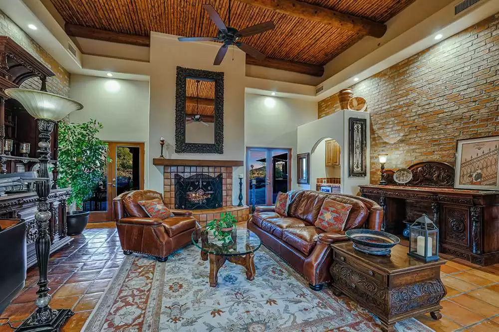 At just under 4,500 square feet, take note of the brick accent walls throughout, the soaring ceilings, use of beam and latilla ceiling accents, smooth interior walls, and beautifully maintained Saltillo tile floors. The spacious floor plan showcases an ensuite master retreat, private den/office, and a guest bedroom with jack’n’jill hall bath on one side and one large additional guest bedroom with ensuite bath (currently used as a music room), and great room set up with kitchen, breakfast and family room on the other. The entryway ushers you into the heart of the home with a formal living room with centerpiece fireplace flanked by two sets of French doors leading to the backyard and adjacent to the formal dining room, perfect for entertaining!