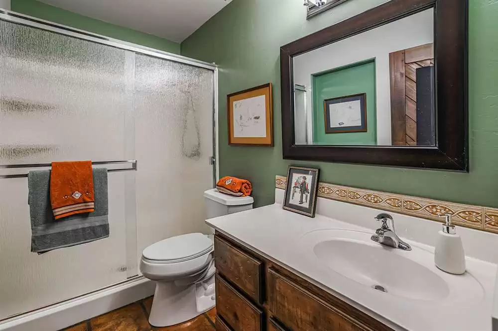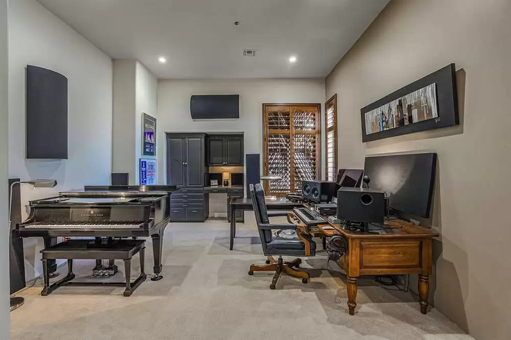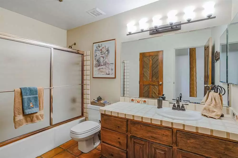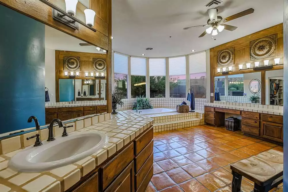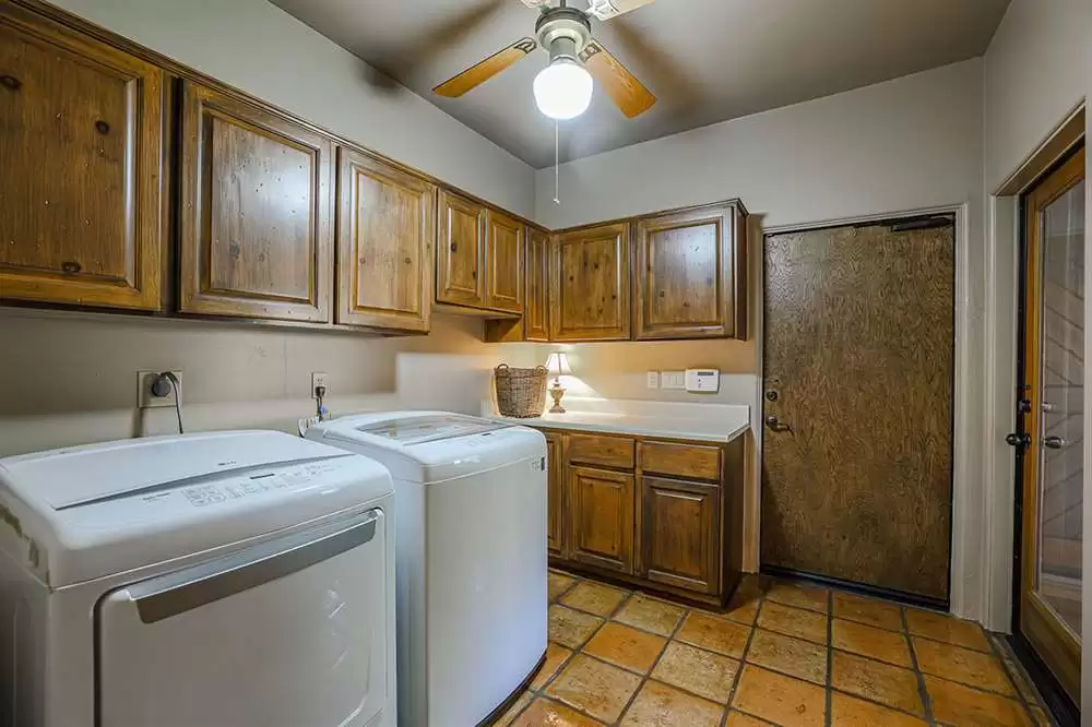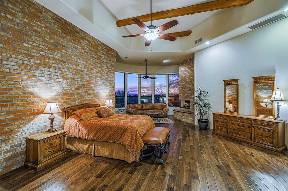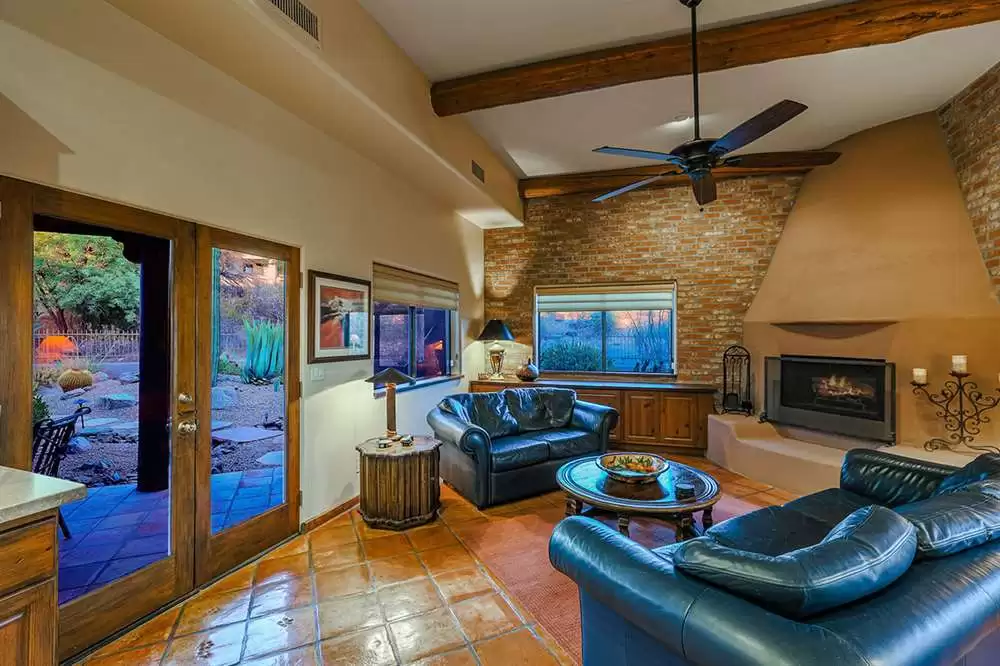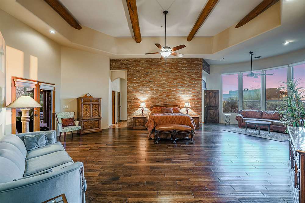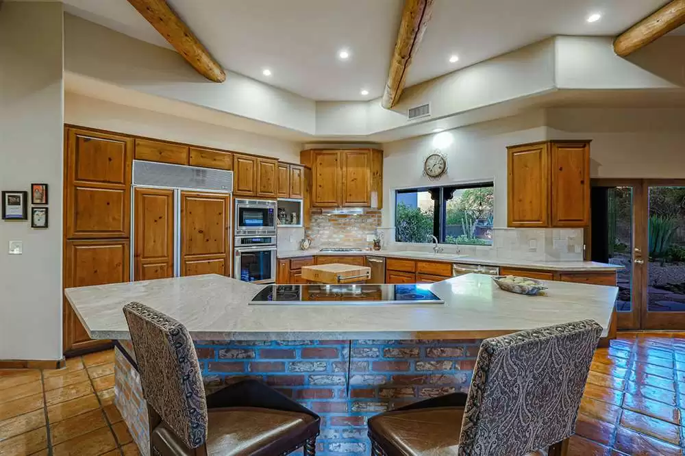 At just under 4,500 square feet, take note of the brick accent walls throughout, the soaring ceilings, use of beam and latilla ceiling accents, smooth interior walls, and beautifully maintained Saltillo tile floors. The spacious floor plan showcases an ensuite master retreat, private den/office, and a guest bedroom with jack’n’jill hall bath on one side and one large additional guest bedroom with ensuite bath (currently used as a music room), and great room set up with kitchen, breakfast and family room on the other. The entryway ushers you into the heart of the home with a formal living room with centerpiece fireplace flanked by two sets of French doors leading to the backyard and adjacent to the formal dining room, perfect for entertaining!