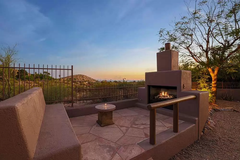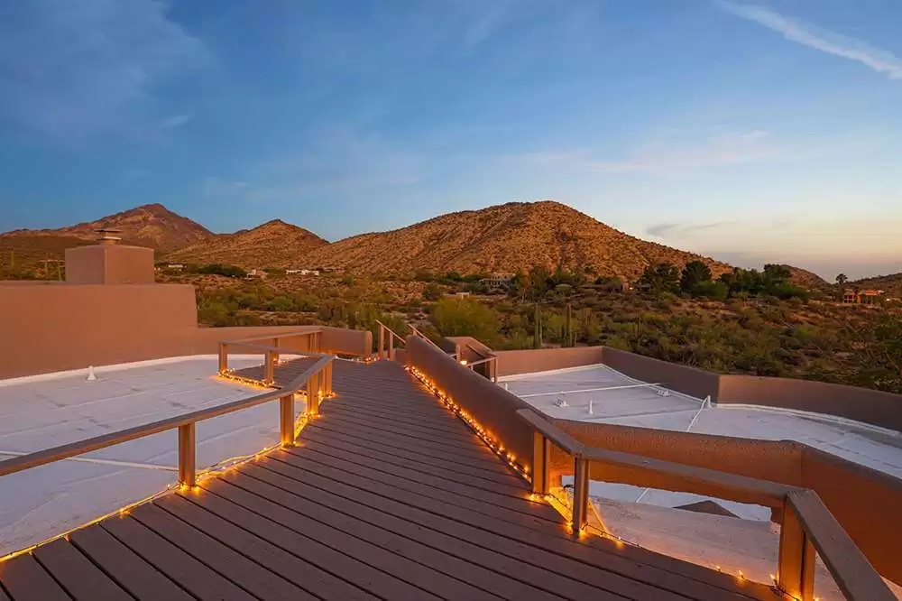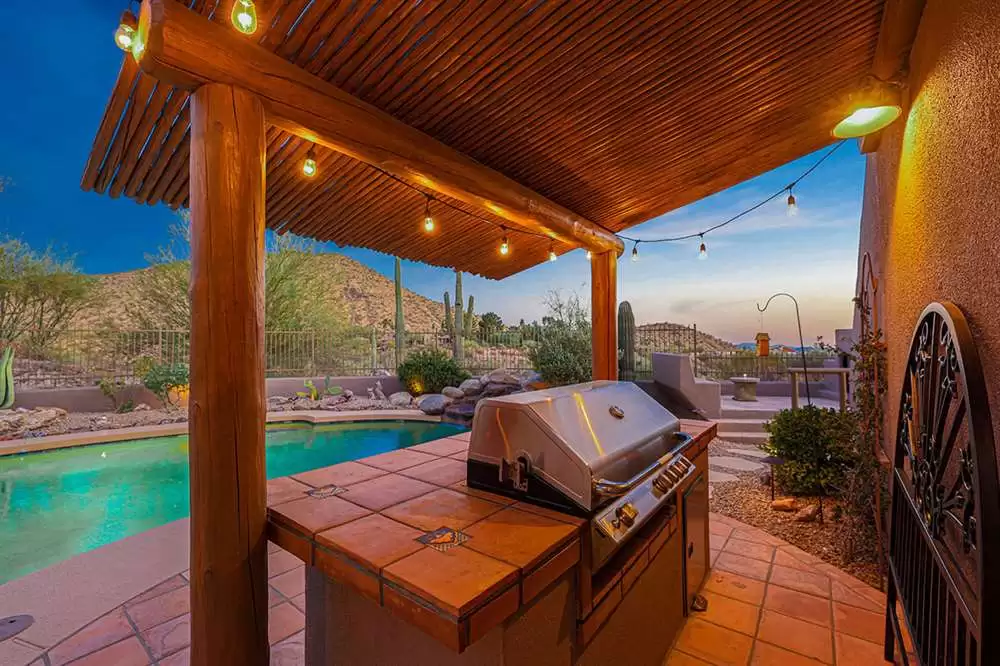 The backyard continues the Southwest charm with Saltillo patio hardscape, beamed and latilla covered patio, mature landscaping, outdoor fireplace with built-in seating overlooking the city lights, built-in barbecue, rooftop deck with 360 degree views, refreshing pool, pool bath with shower, and new landscaping lighting and landscape drip system in the front and rear yards.