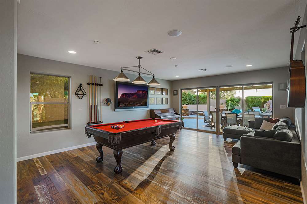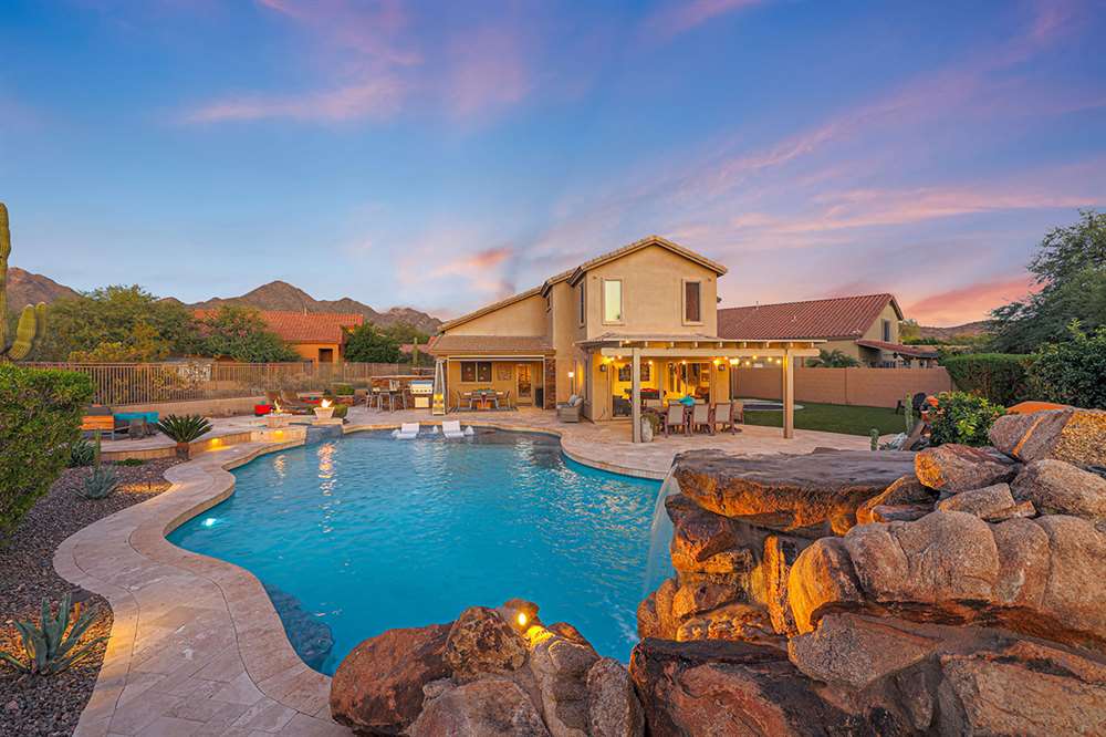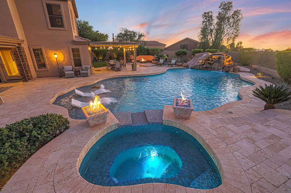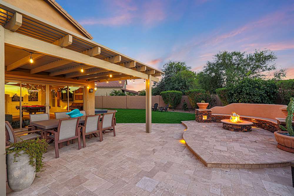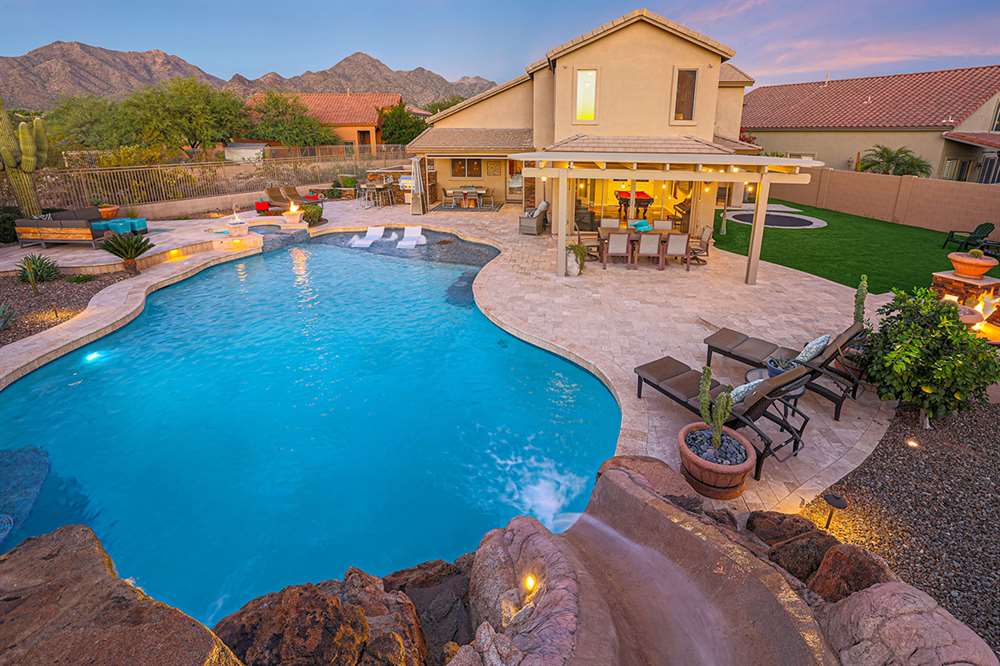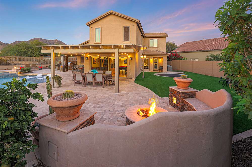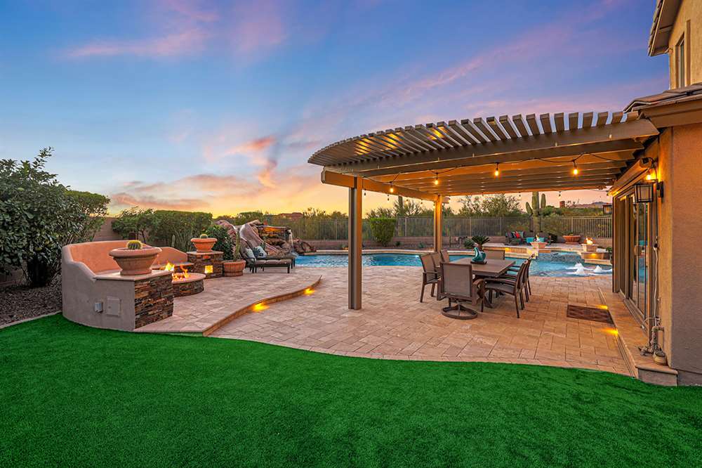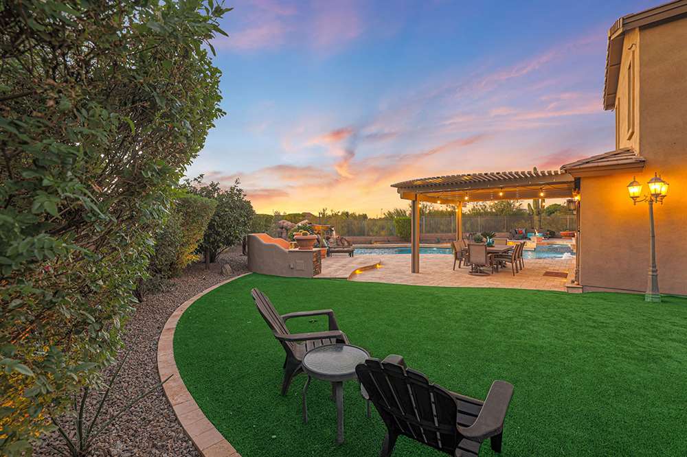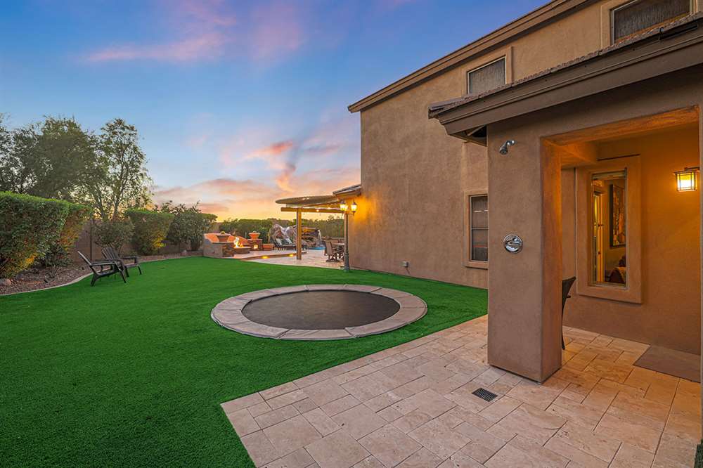 The backyard is a true entertainer’s dream with features like extensive use of tumbled travertine hardscape for multiple lounge and dining spaces, a large, heated diving pool with rock waterfall and slide, baja shelf in the pool with tanning chairs, elevated heated spa, two covered patios, built-in barbecue with bar top seating, fire pit, artificial turf side yard with in-ground trampoline, stacked stone accents, and a private patio off the dining room with a fire pit and water feature.