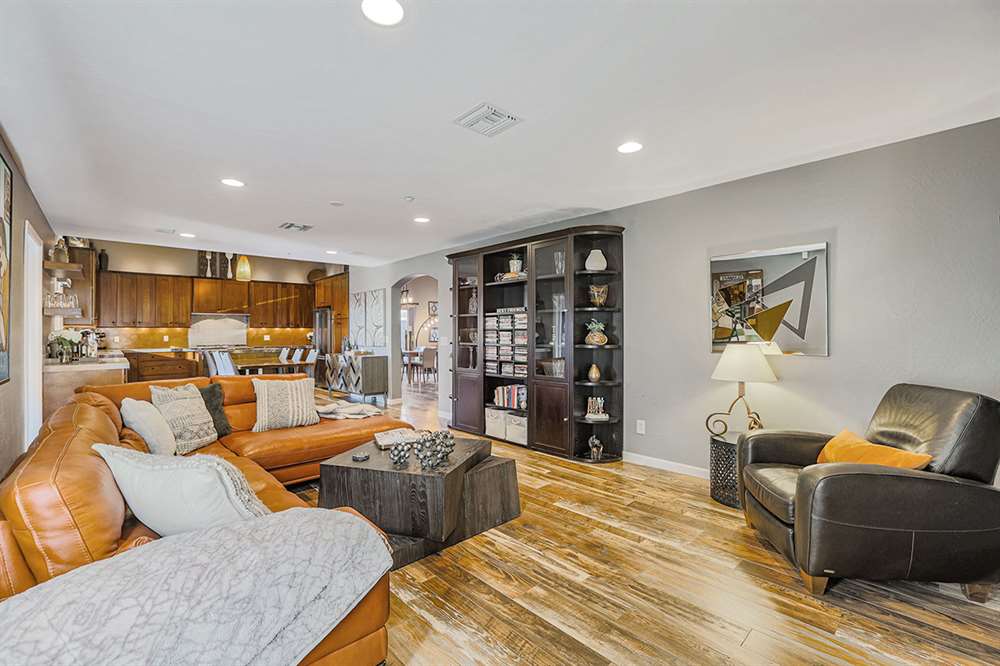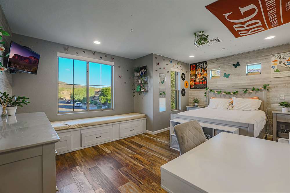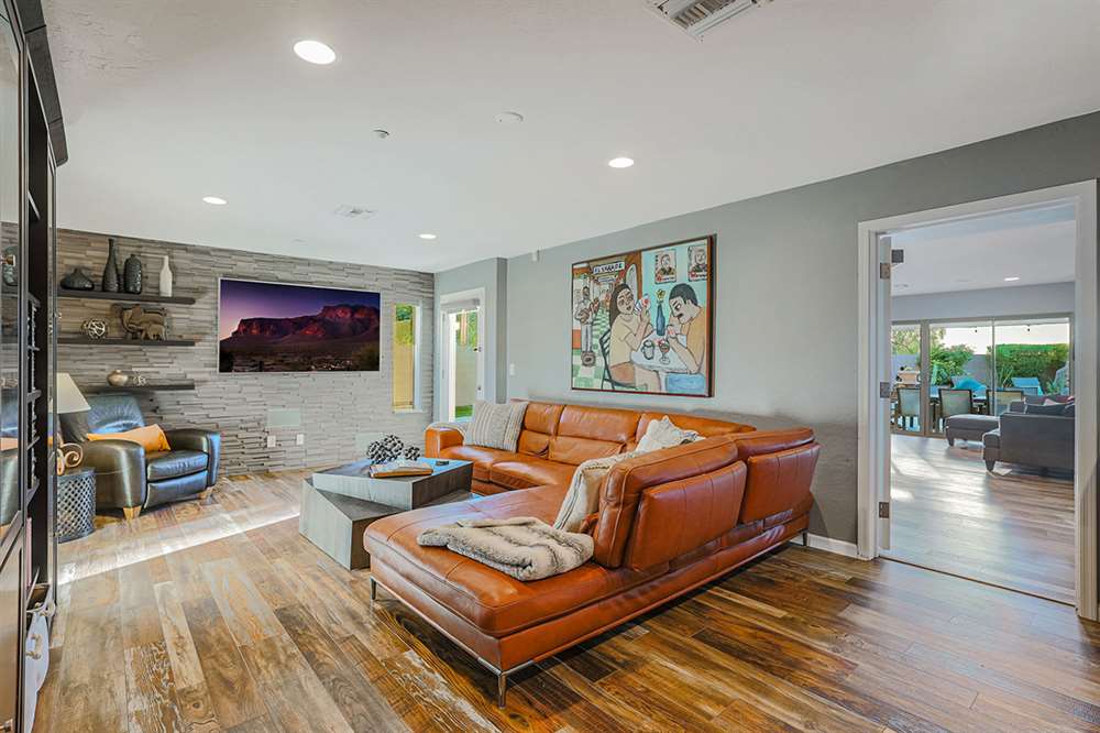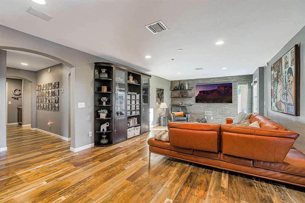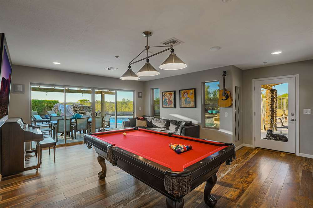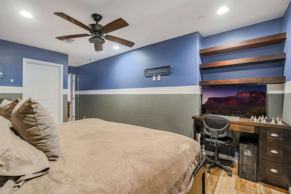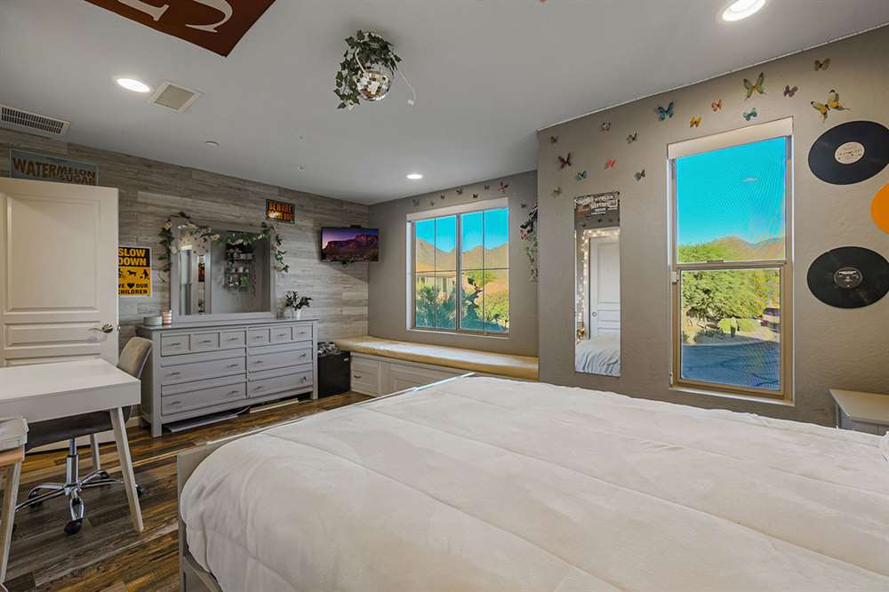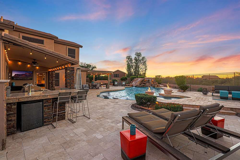 The backyard is a true entertainer’s dream with features like extensive use of tumbled travertine hardscape for multiple lounge and dining spaces, a large, heated diving pool with rock waterfall and slide, baja shelf in the pool with tanning chairs, elevated heated spa, two covered patios, built-in barbecue with bar top seating, fire pit, artificial turf side yard with in-ground trampoline, stacked stone accents, and a private patio off the dining room with a fire pit and water feature.