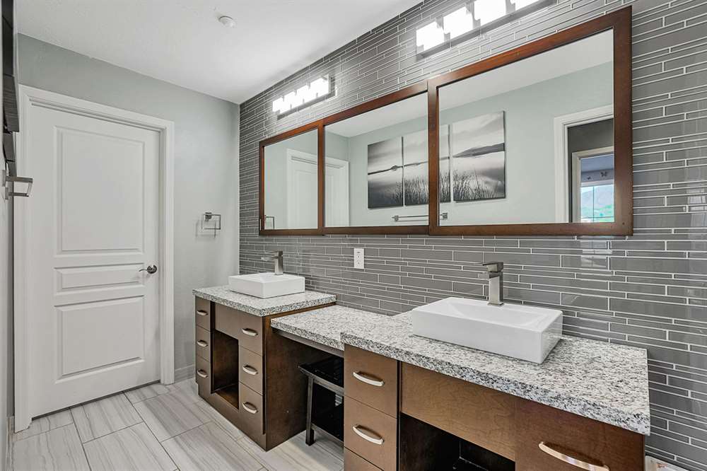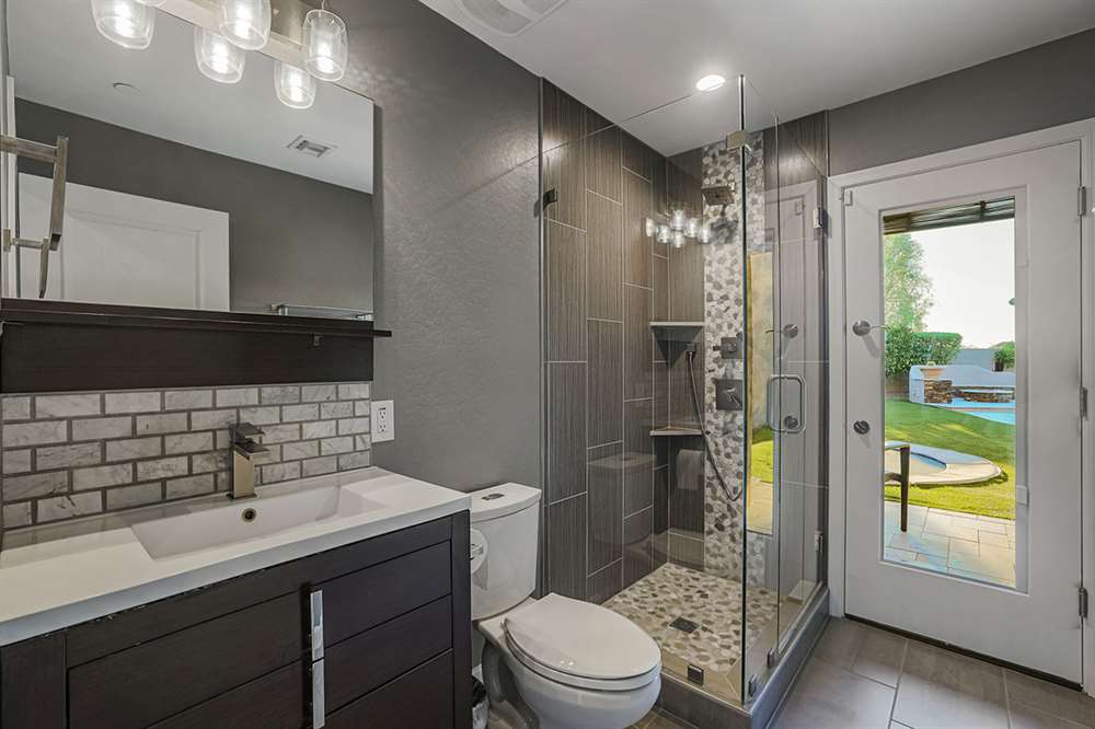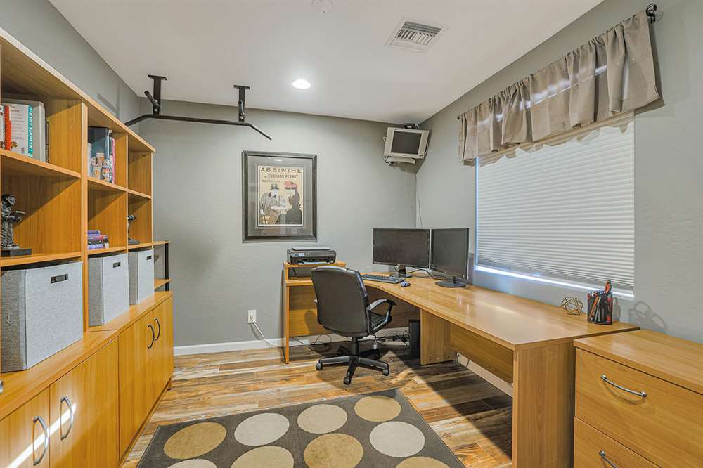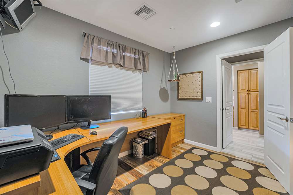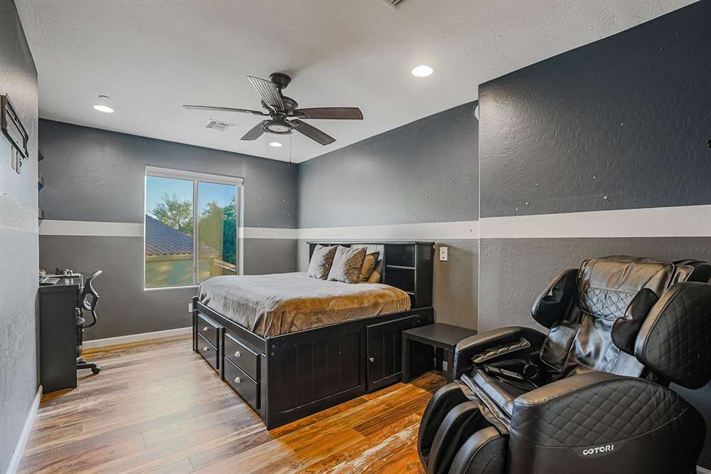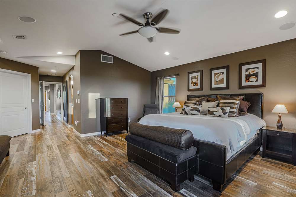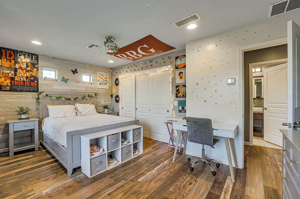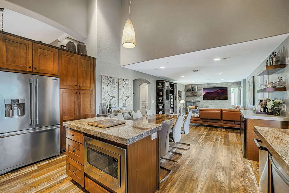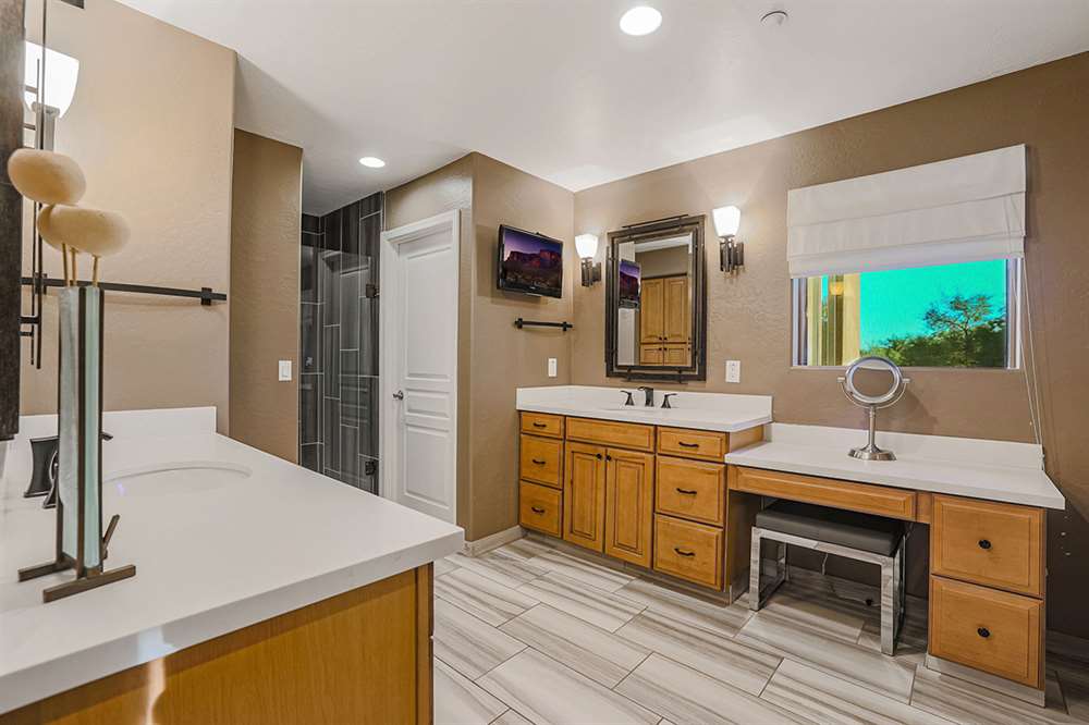 The backyard is a true entertainer’s dream with features like extensive use of tumbled travertine hardscape for multiple lounge and dining spaces, a large, heated diving pool with rock waterfall and slide, baja shelf in the pool with tanning chairs, elevated heated spa, two covered patios, built-in barbecue with bar top seating, fire pit, artificial turf side yard with in-ground trampoline, stacked stone accents, and a private patio off the dining room with a fire pit and water feature.