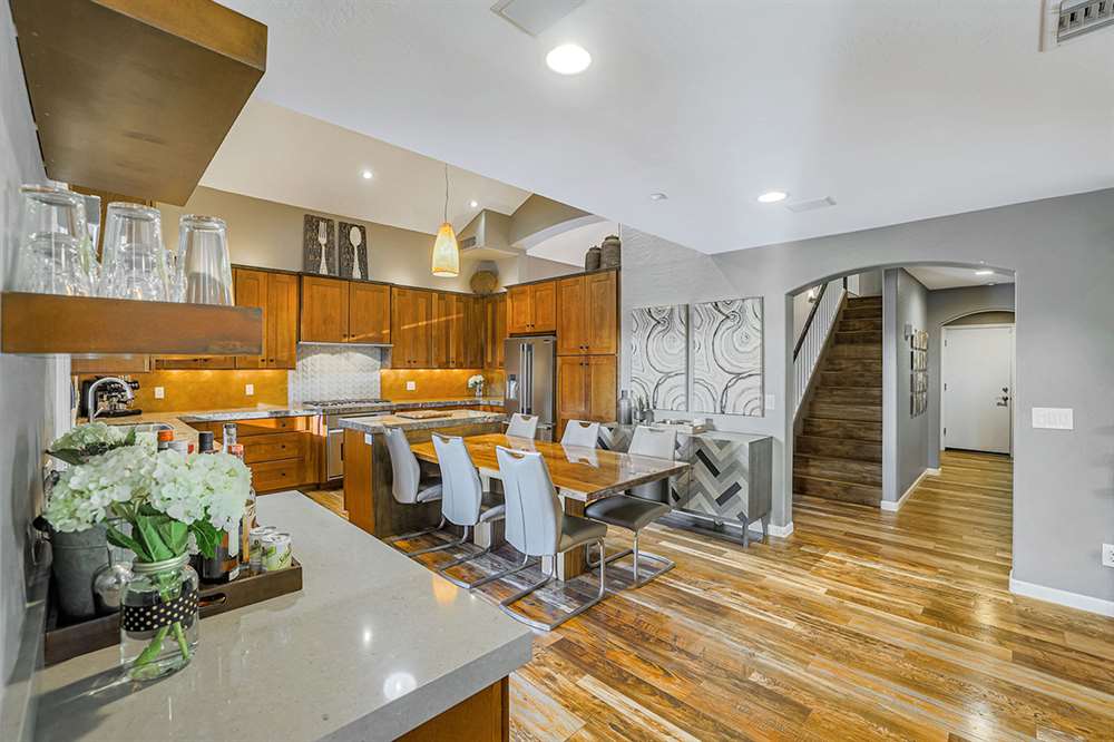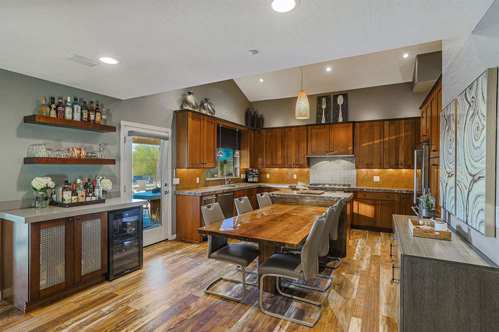 The heart of the interior is the kitchen/family room open to each other for seamless living. The renovated kitchen has custom cabinetry, stainless steel appliance package with gas cooktop, copper sheet backsplash, center island with attached table for in kitchen dining, granite counters and a bar area with wine/beverage fridge and display shelves.