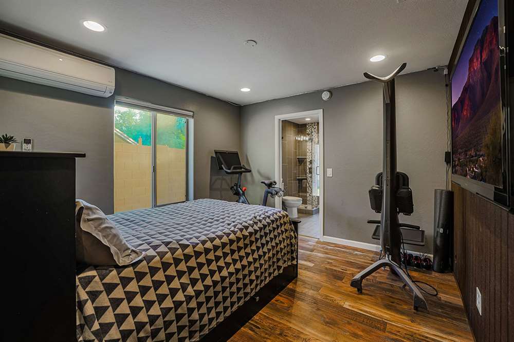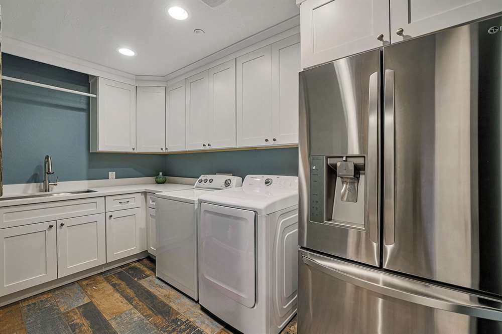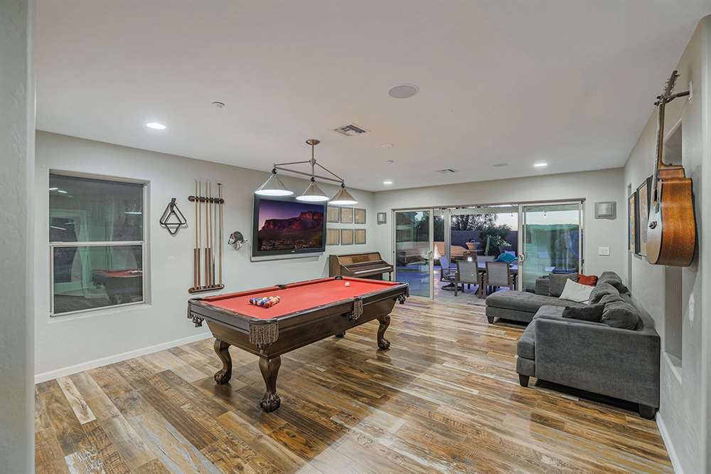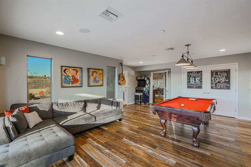 Other rooms downstairs include a formal living and dining room, large bonus game room leading to the exterior, laundry room with ample cabinetry, sink and full size fridge, ensuite guest room with separate entry, and direct access from the garage into the mud room with built-ins.