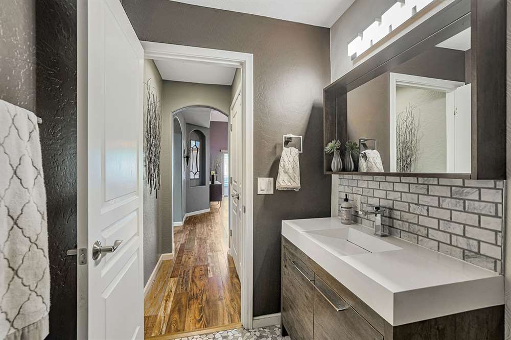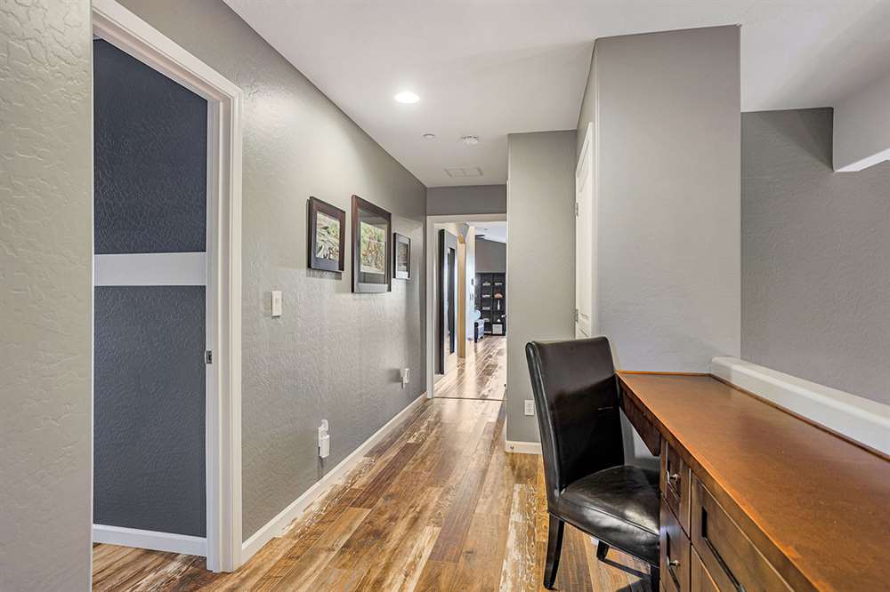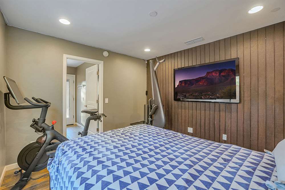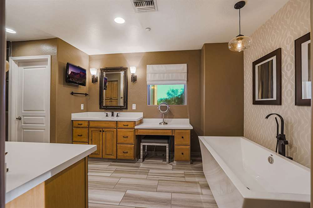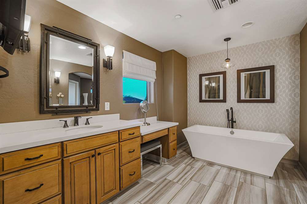 The upstairs features three additional guest rooms, loft area with built-in desk, beautifully updated hall bath with dual sinks and private shower/toilet room, and a grand master suite. The master suite has views overlooking the backyard, a large sleeping space, walk-in closet, renovated master bath with separate vanity sinks, large freestanding soaking tub, and a bonus flex space currently used as an office but easily converted to an exercise room or secondary walk-in closet.