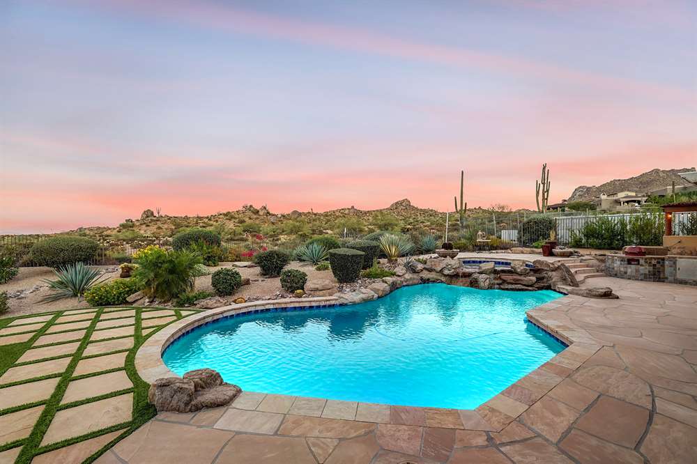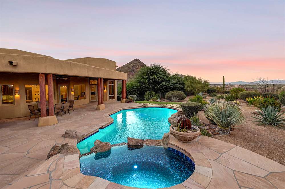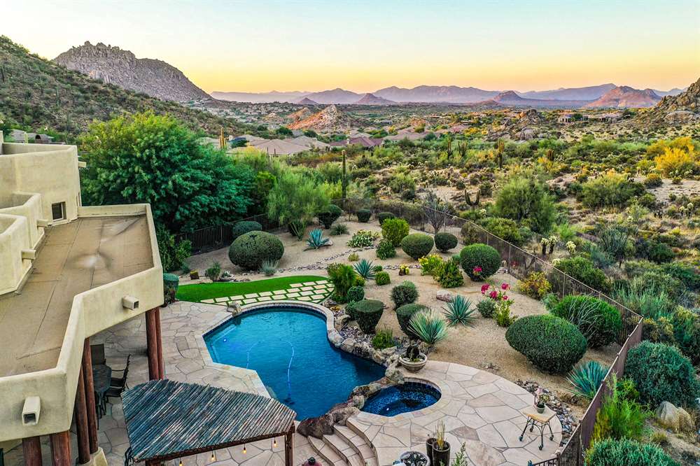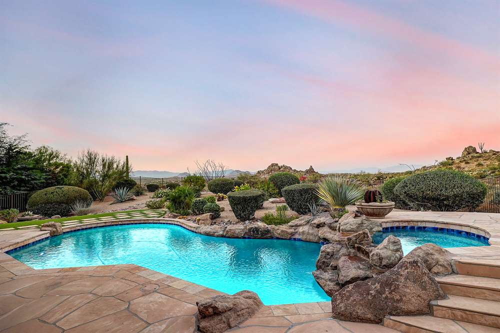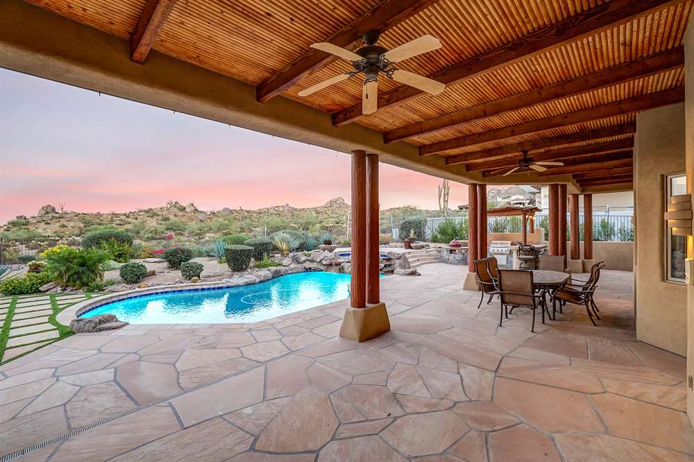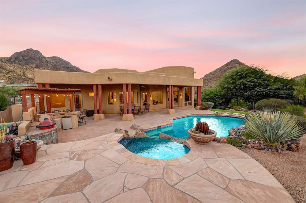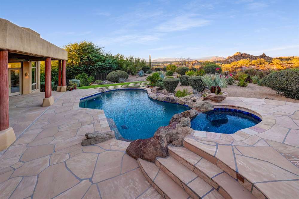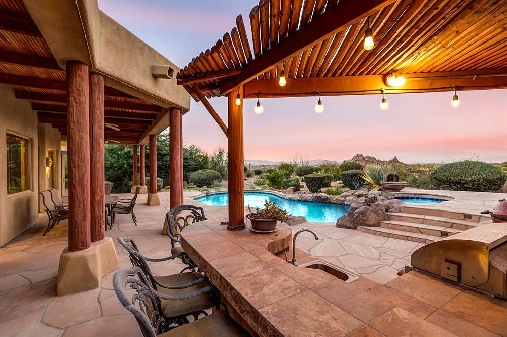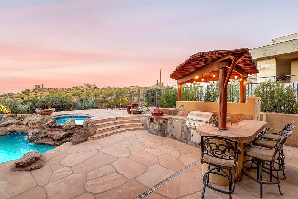 Beautifully landscaped, enjoy the refreshing pool with boulder accents, elevated spa, full covered patio with latilla and beam accents, flagstone hardscape, pergola covered outdoor grilling area with built-in barbecue, Kamado ceramic cooker, bar top for seating and prep sink – all overlooking the views which reach from the McDowell Mountains all the way to the Mazatzal Mountains.