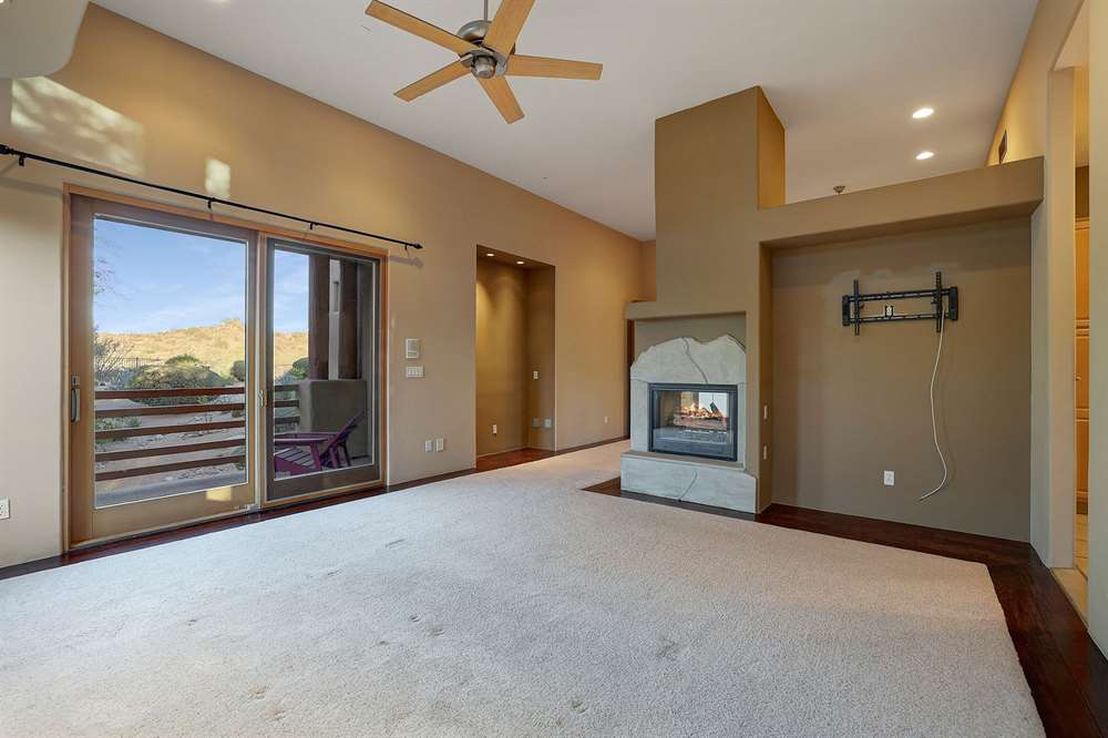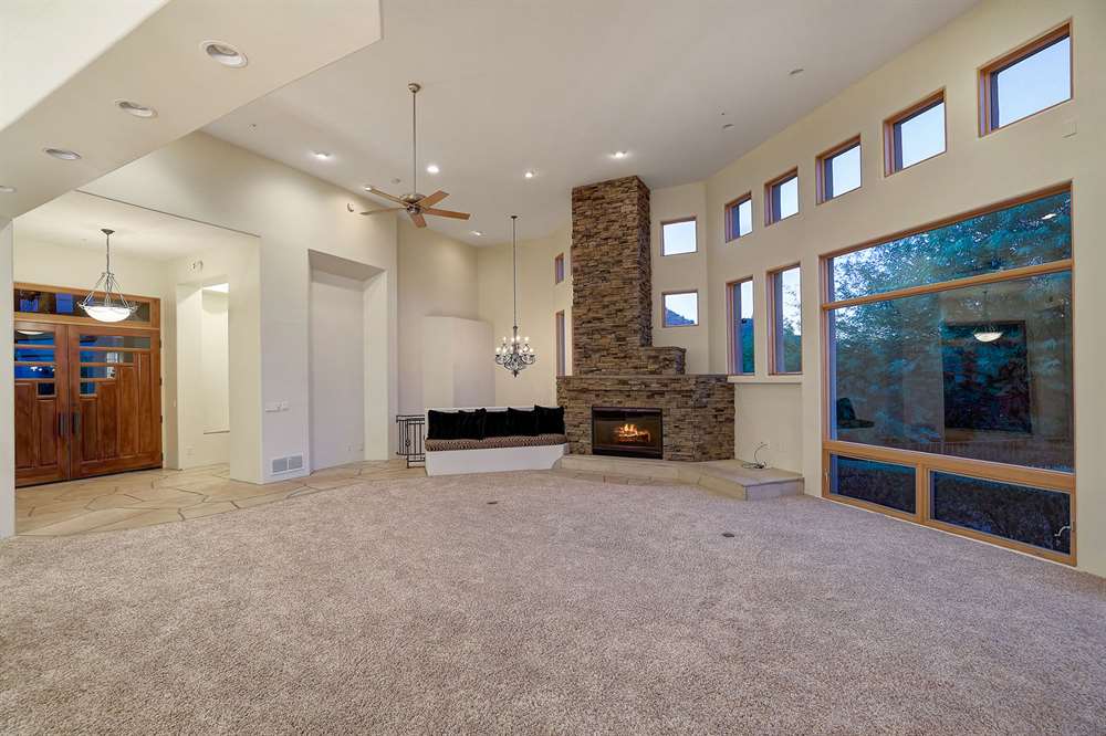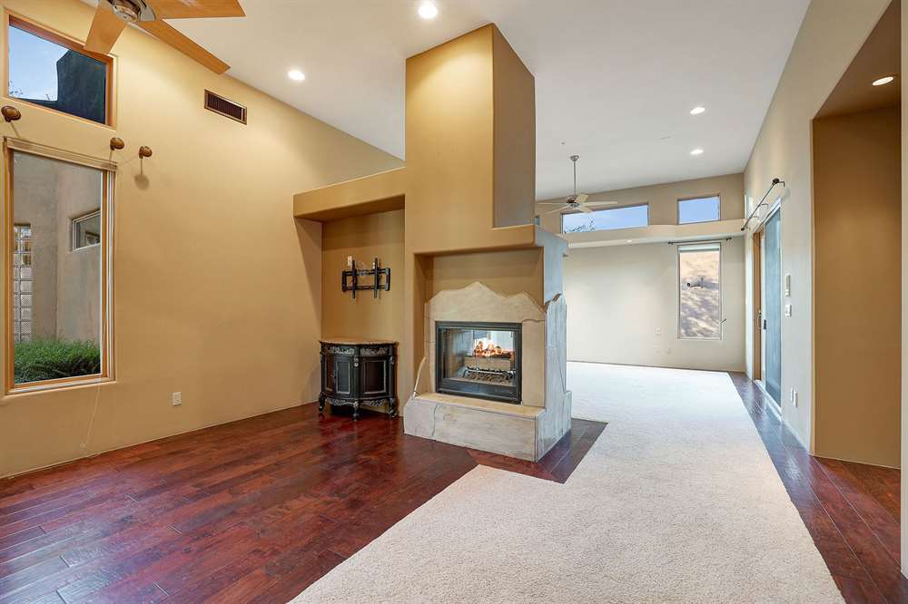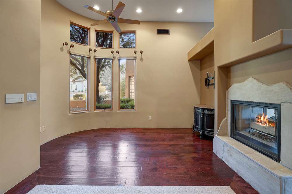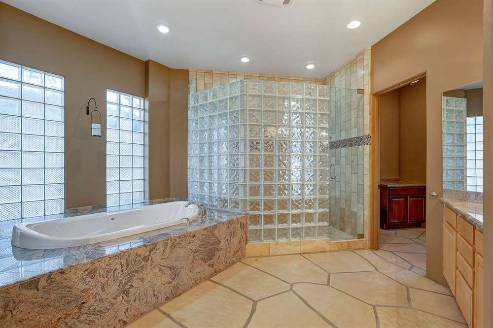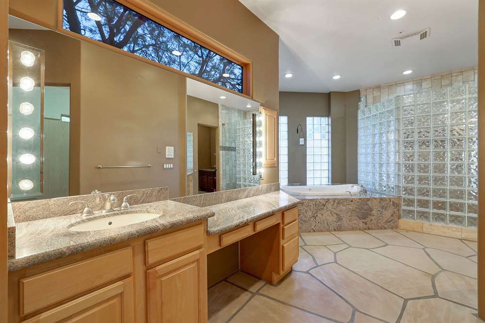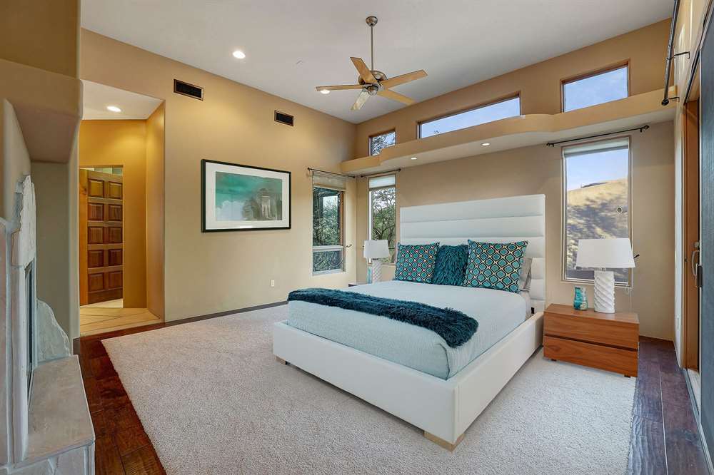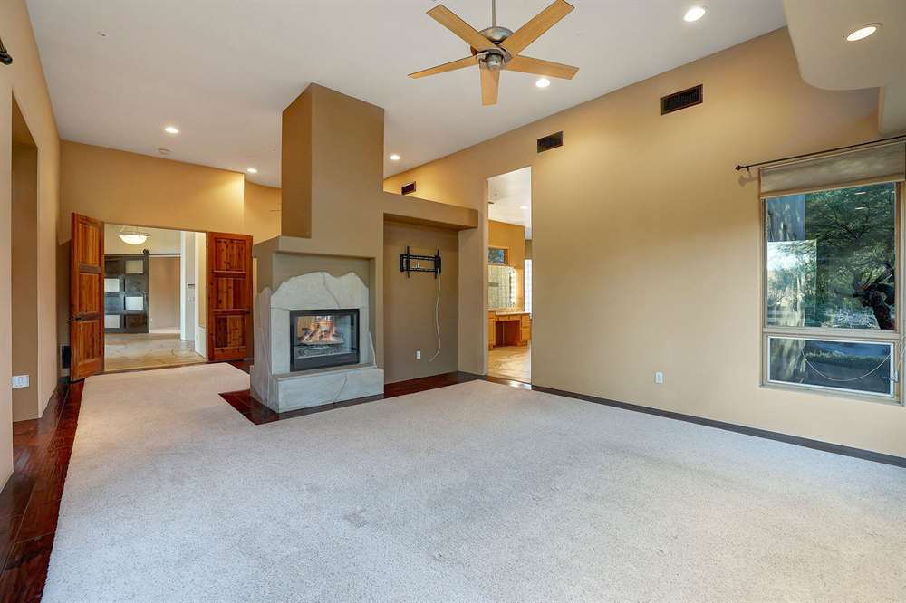 The master suite is spacious with exterior access, cozy sitting area separated from the sleeping area by a two-way fireplace and a large bathroom with a large soaking tub, separate shower, and dual vanities.