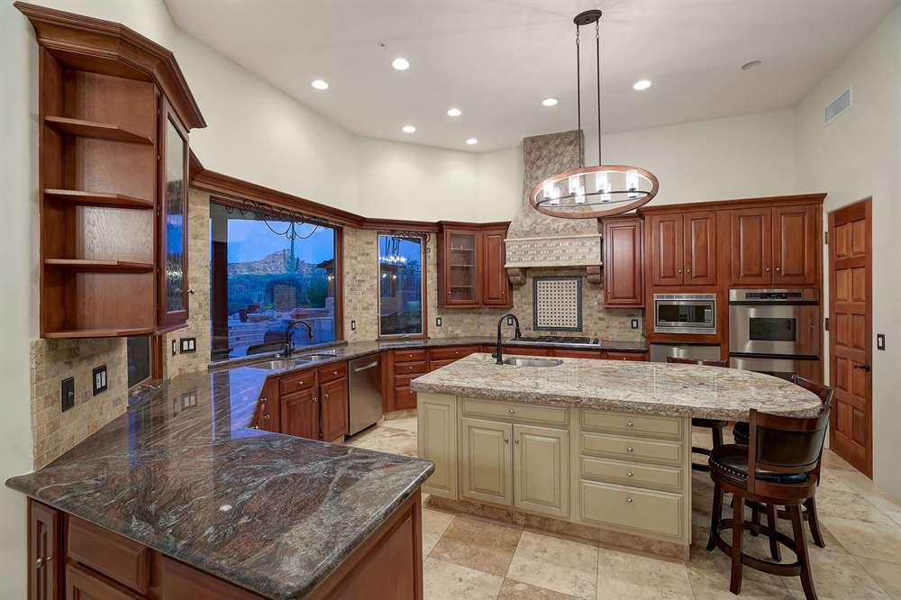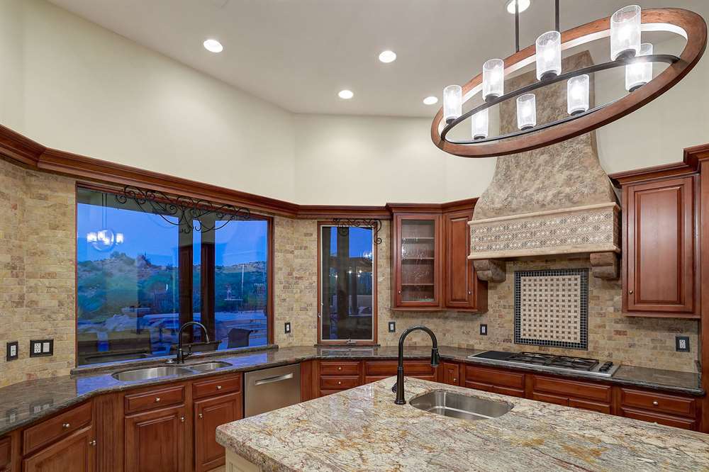 The kitchen is a gourmet setting perfect for the home chef with plenty of cabinet and granite counter space, gas cooktop with custom range, center island with seating and prep sink, walk-in pantry, stainless steel appliance packages with double ovens and built-in microwave, and view windows.
