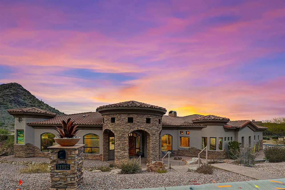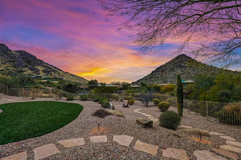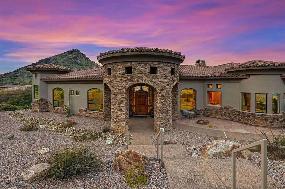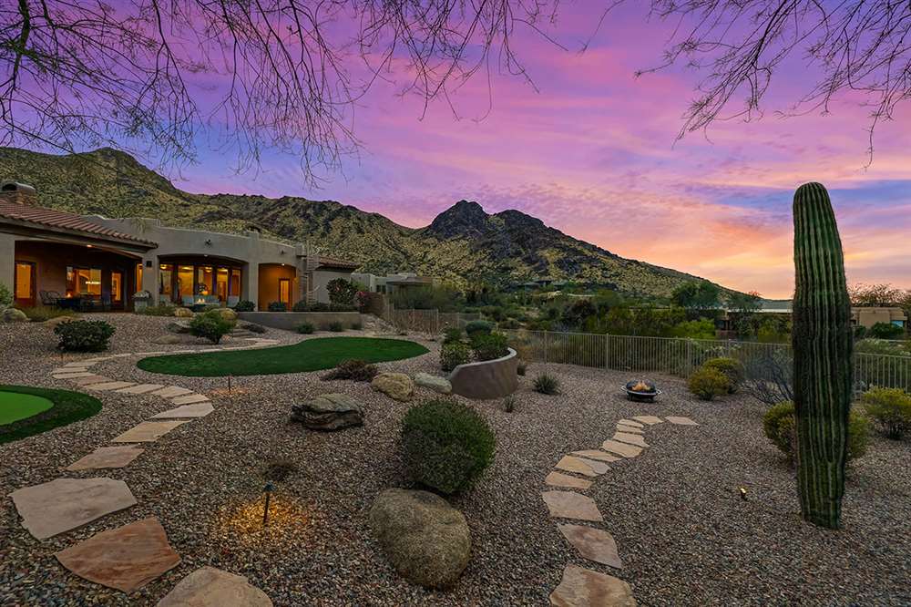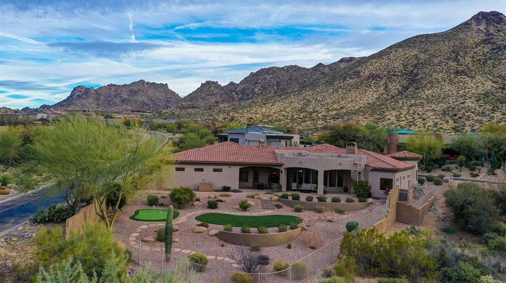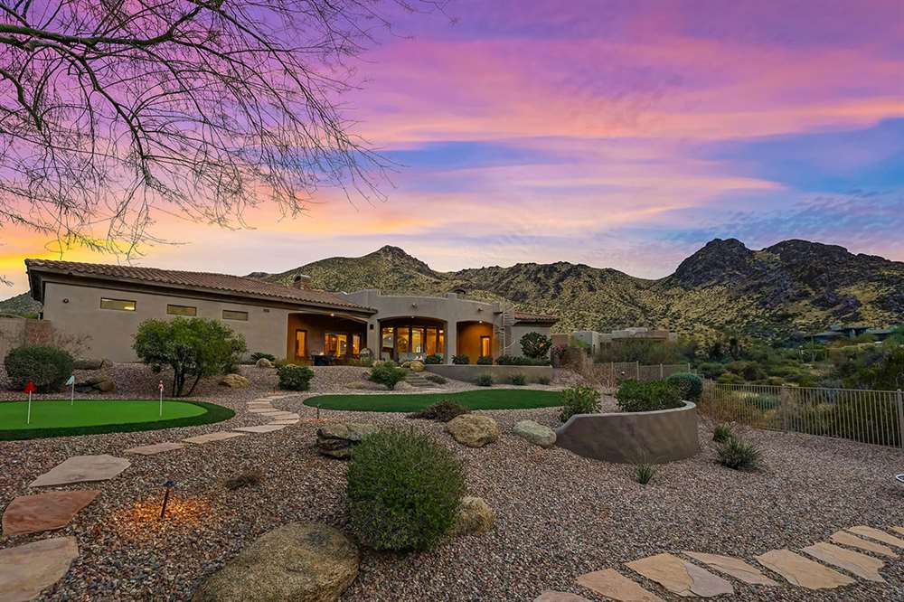 Located at the base of the McDowell Mountain range in gated Troon Highland Estates this custom three bedroom plus office, three and a half bath home offers panoramic views from the front and back!