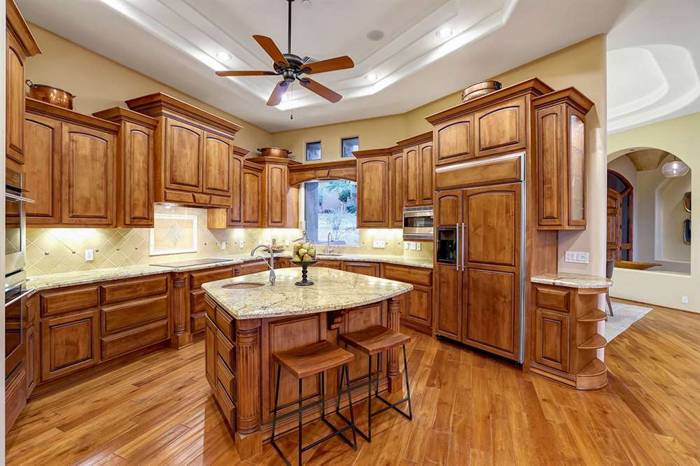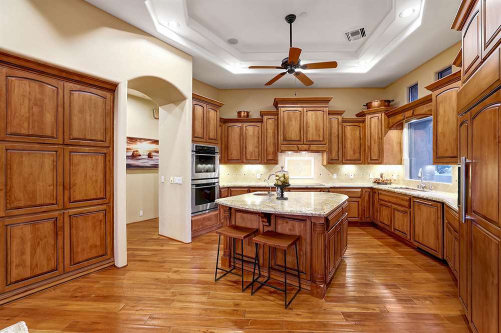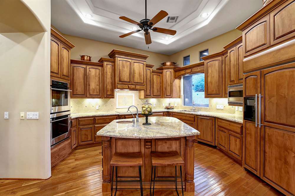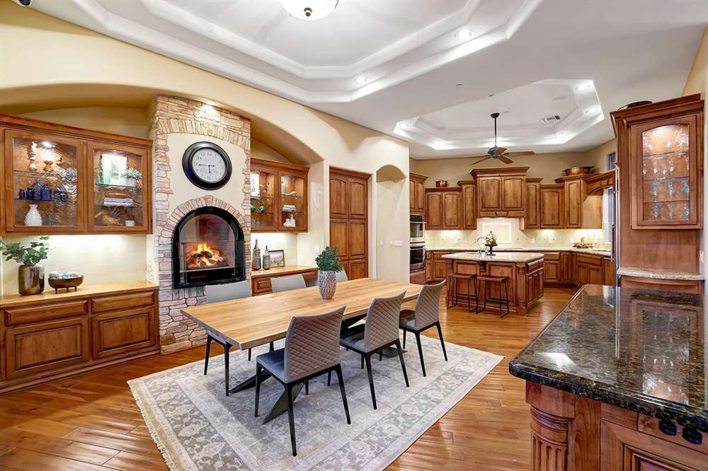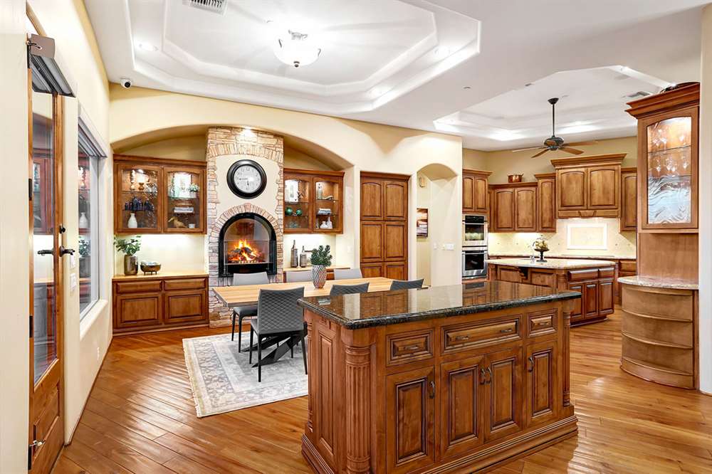 The interior of the home features a combination of wood, stone and plush carpet flooring throughout, stone accents, lots of windows for natural light, and a great room floor plan with the family, breakfast dining, and kitchen all opening to each other. The kitchen includes custom cabinetry with matching hood vent and paneled fridge, stainless steel appliances, electric stove (plumbed for gas), two sinks, built-in microwave and double wall oven, and granite counters. There is also a formal dining room perfect for entertaining!