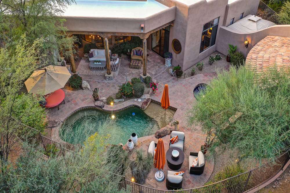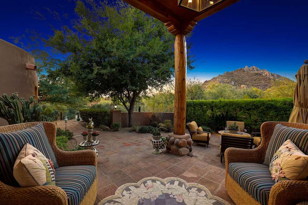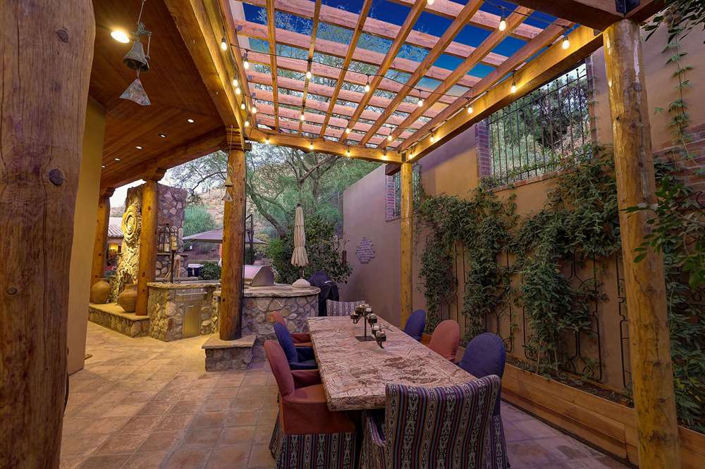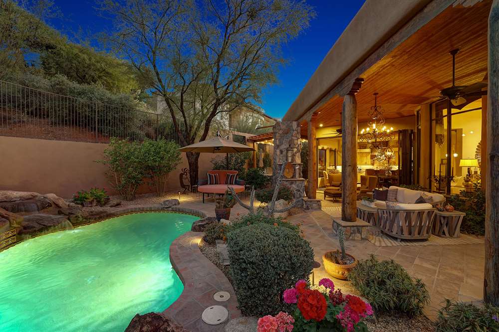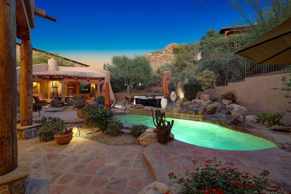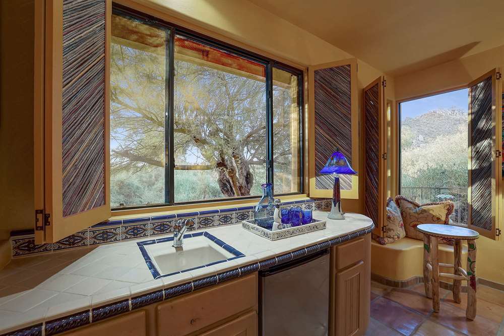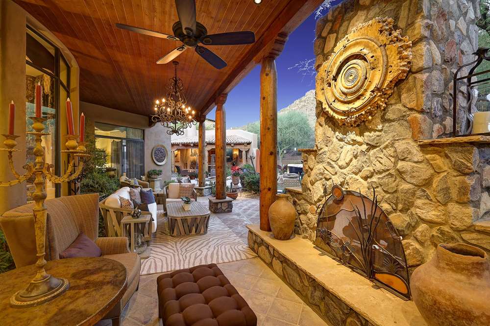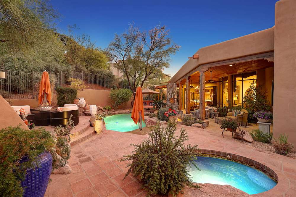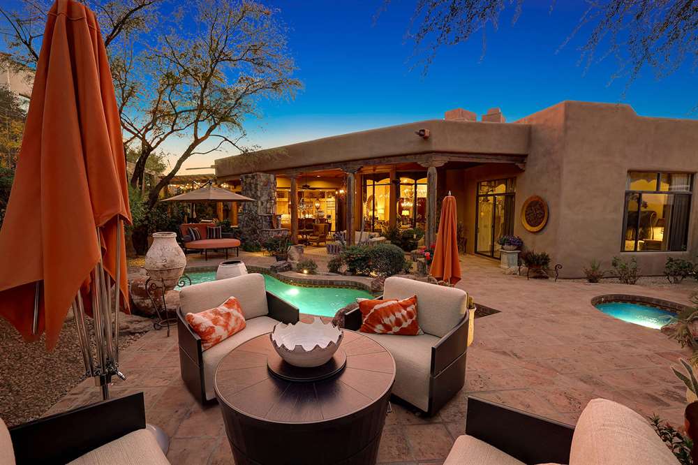 Ample exterior entertaining spaces start with the front patio accessed from the wrap around walkway with direct views of Troon Mountain and access to the separate entry casita with private bath and kitchenette. The backyard is resort-like and nestled into the McDowell Mountains with accordion pocketing doors allowing the inside to flow naturally outside, admiring the centerpiece stone fireplace housed under the large covered patio, built-in barbecue with refrigerator and warming drawers, recently completed dining area under a pergola with lights and an outdoor serving buffet with sink, pool with Baja shelf, separate spa, elevated lounge area with adjacent enclosed ramada with beamed and latilla ceiling, gas kiva fireplace and built-in bench seating.