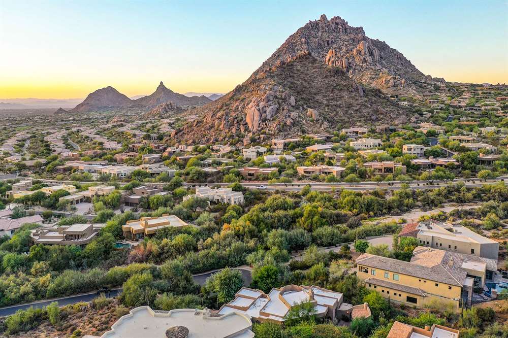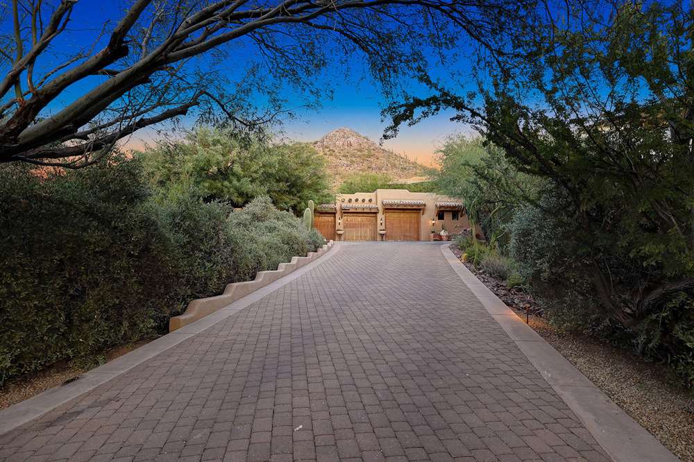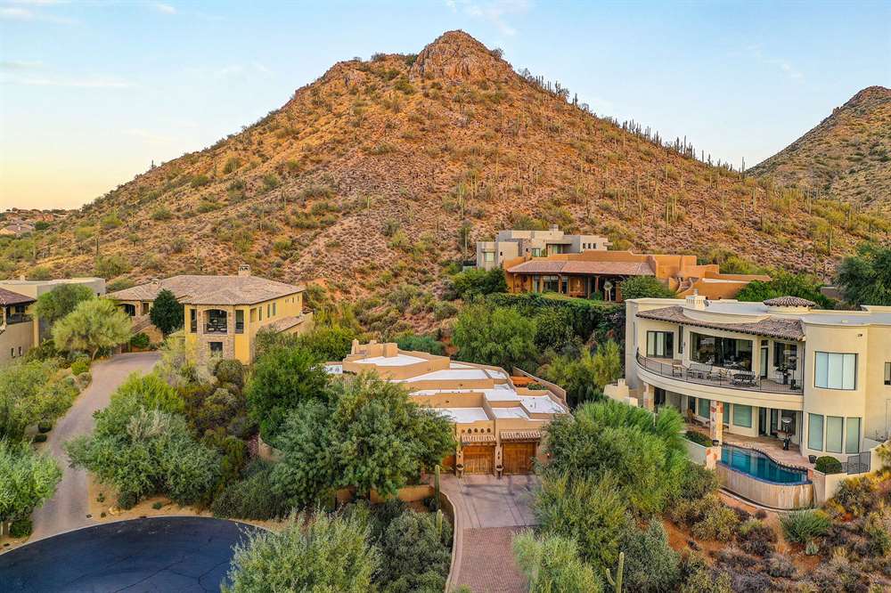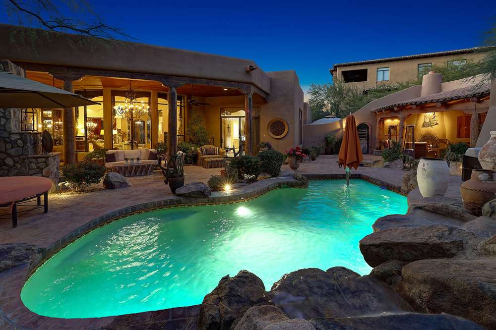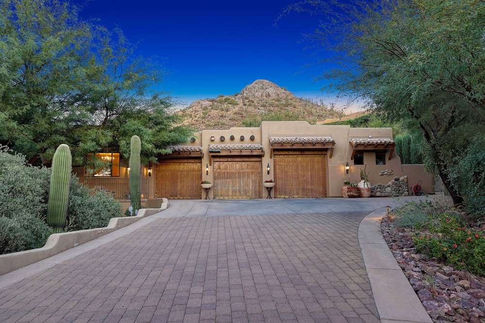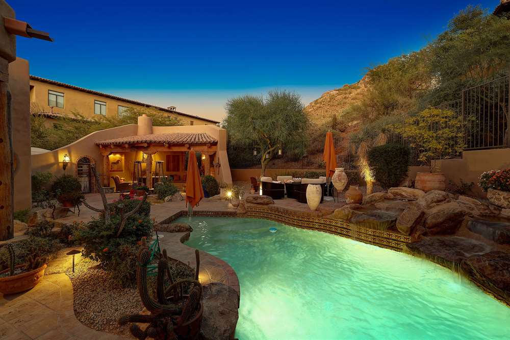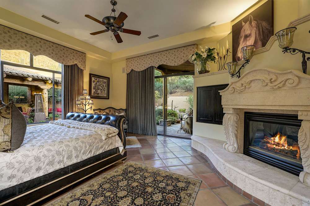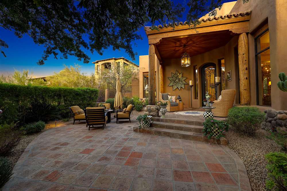 Ample exterior entertaining spaces start with the front patio accessed from the wrap around walkway with direct views of Troon Mountain and access to the separate entry casita with private bath and kitchenette. The backyard is resort-like and nestled into the McDowell Mountains with accordion pocketing doors allowing the inside to flow naturally outside, admiring the centerpiece stone fireplace housed under the large covered patio, built-in barbecue with refrigerator and warming drawers, recently completed dining area under a pergola with lights and an outdoor serving buffet with sink, pool with Baja shelf, separate spa, elevated lounge area with adjacent enclosed ramada with beamed and latilla ceiling, gas kiva fireplace and built-in bench seating.