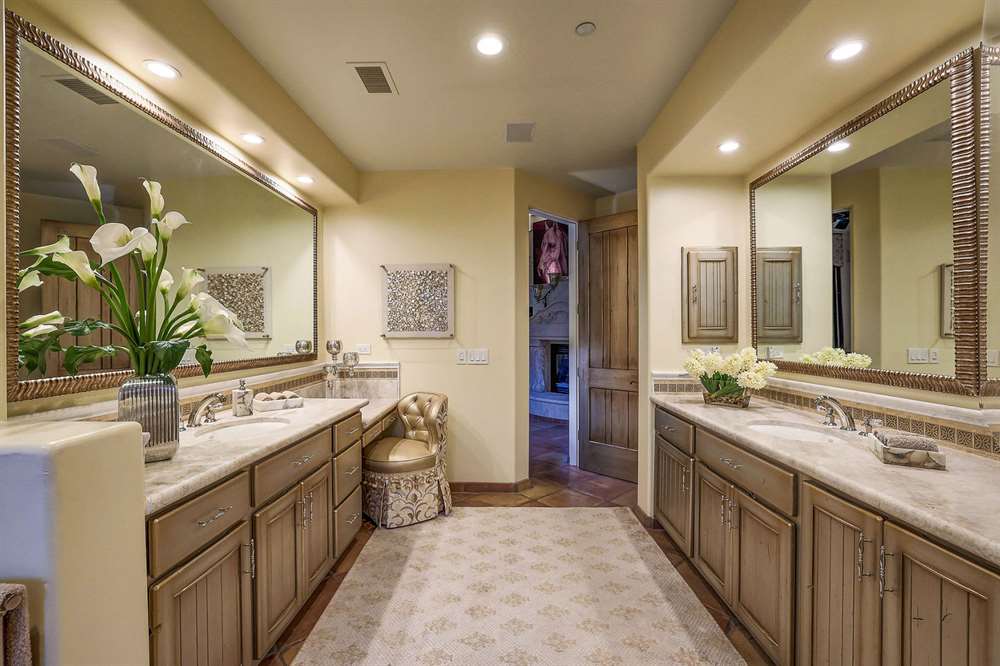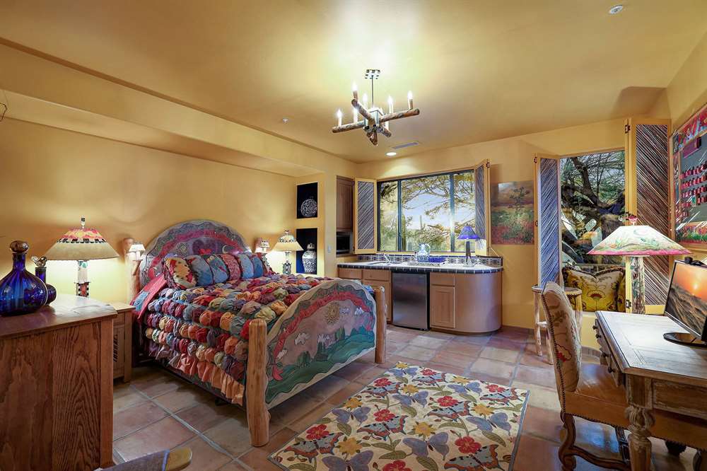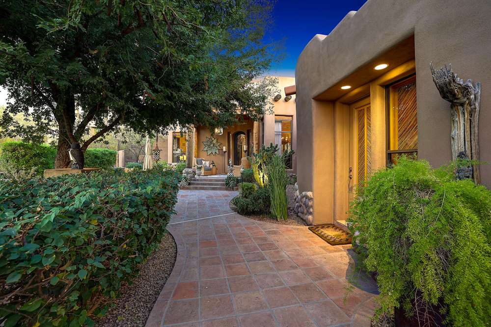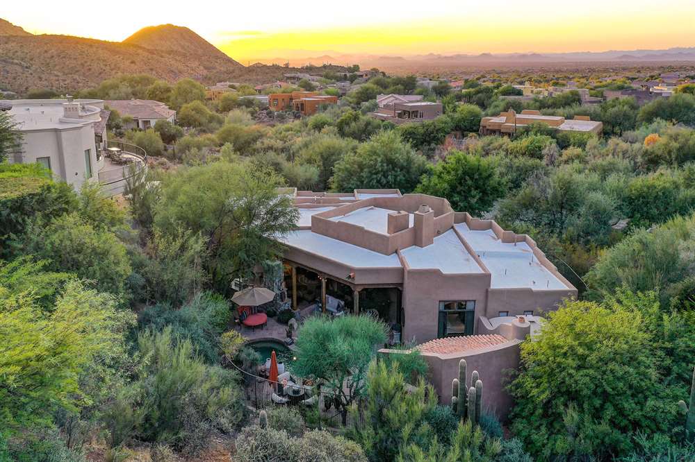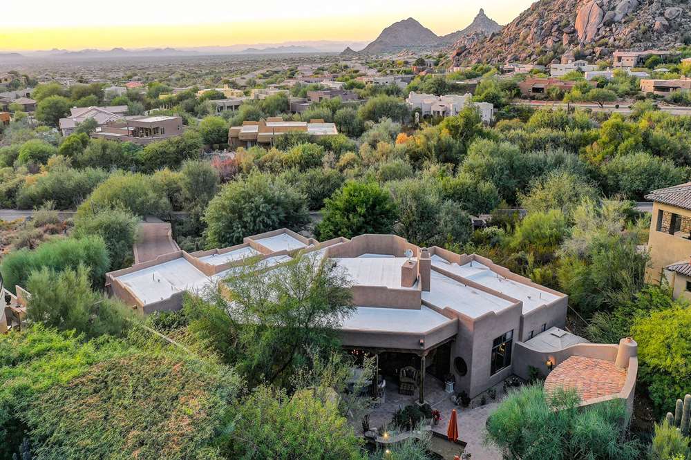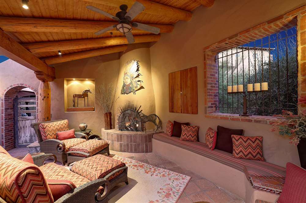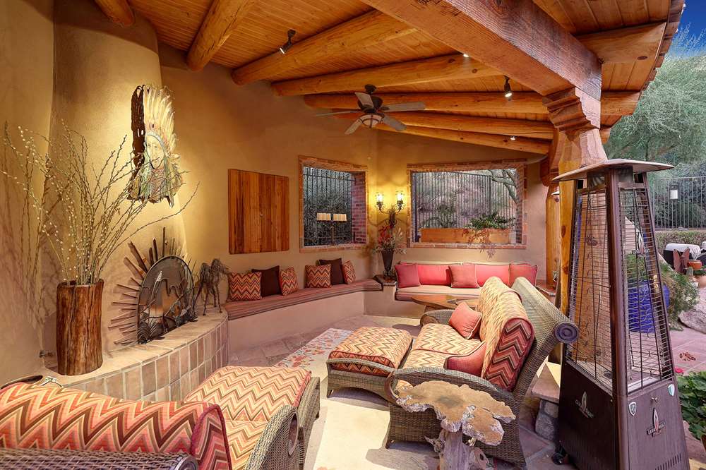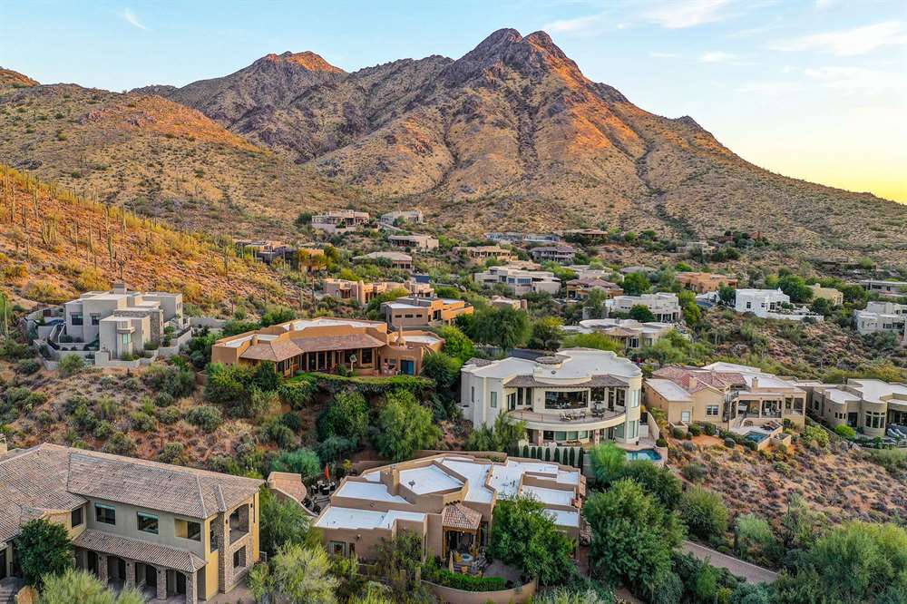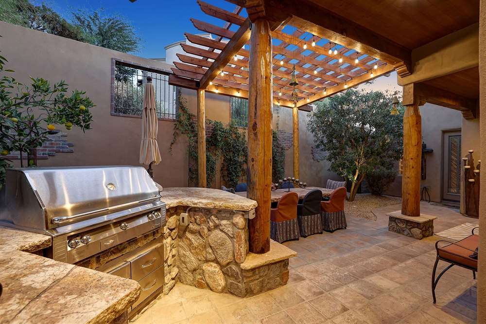 Ample exterior entertaining spaces start with the front patio accessed from the wrap around walkway with direct views of Troon Mountain and access to the separate entry casita with private bath and kitchenette. The backyard is resort-like and nestled into the McDowell Mountains with accordion pocketing doors allowing the inside to flow naturally outside, admiring the centerpiece stone fireplace housed under the large covered patio, built-in barbecue with refrigerator and warming drawers, recently completed dining area under a pergola with lights and an outdoor serving buffet with sink, pool with Baja shelf, separate spa, elevated lounge area with adjacent enclosed ramada with beamed and latilla ceiling, gas kiva fireplace and built-in bench seating.