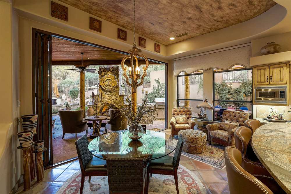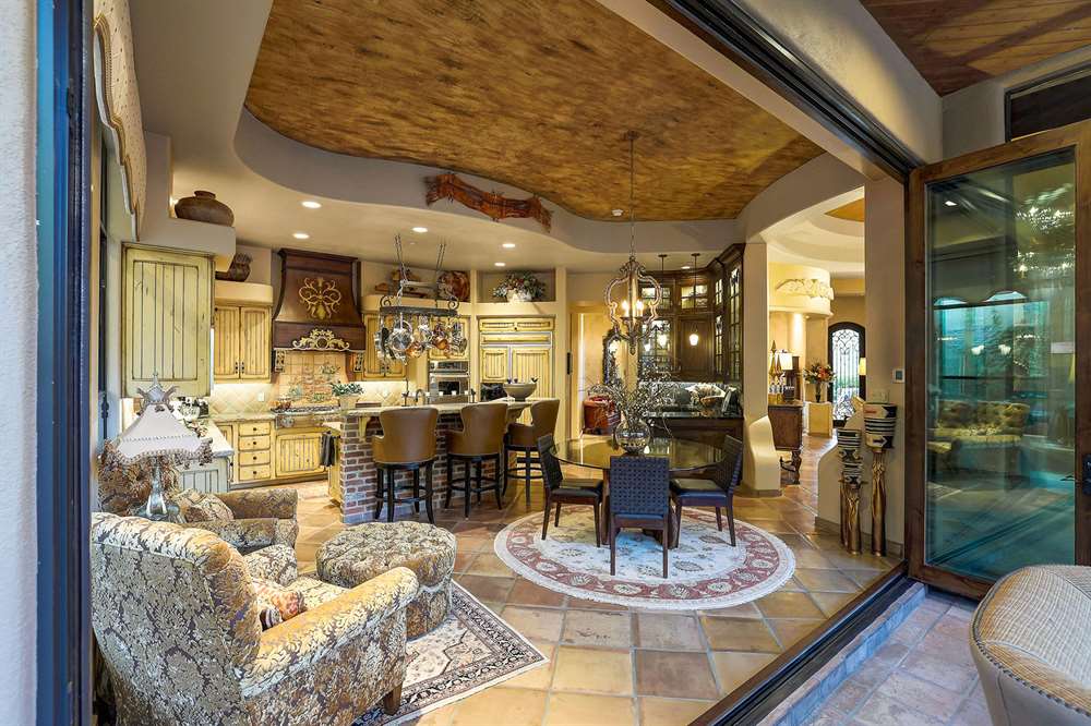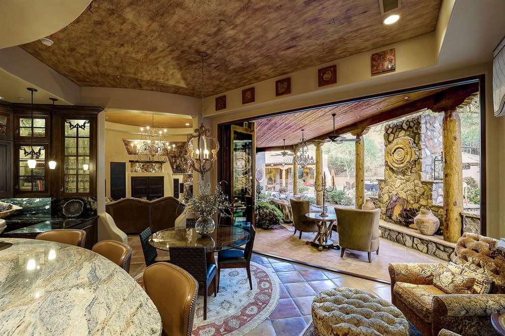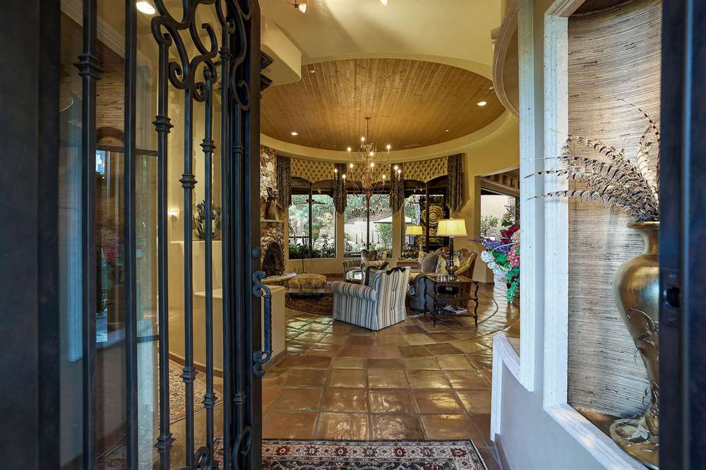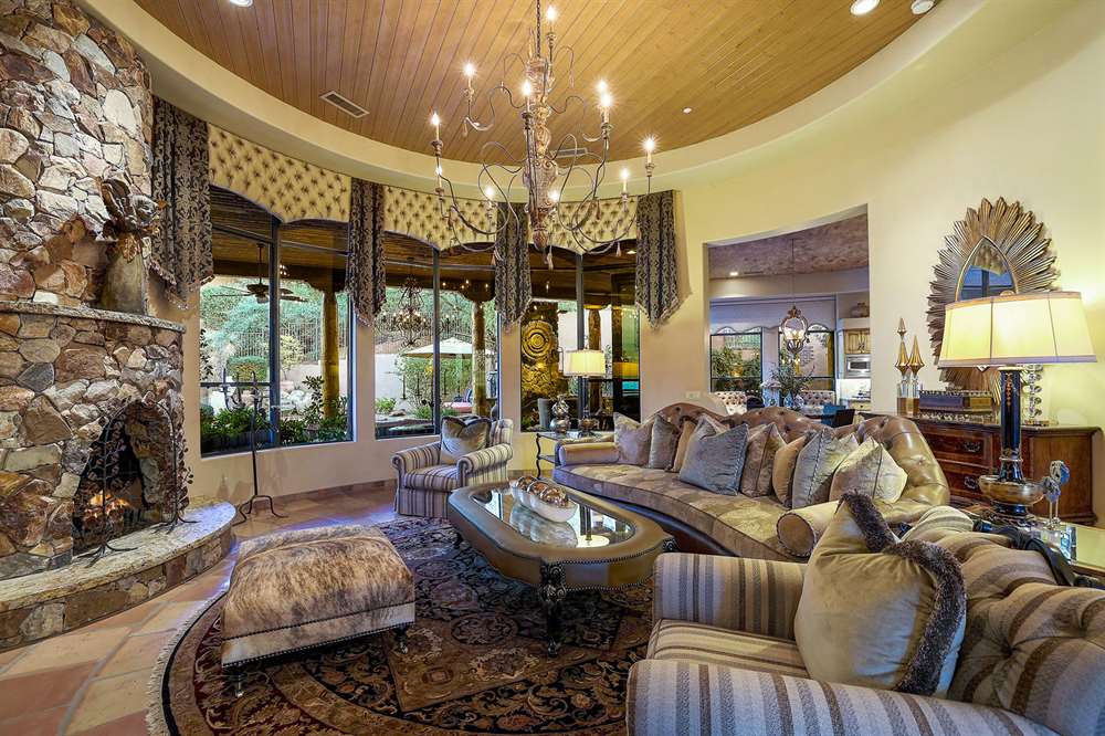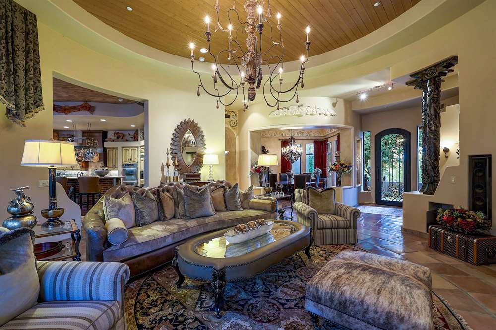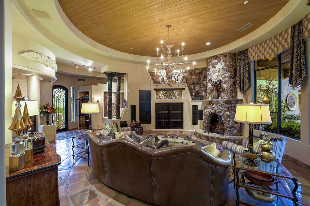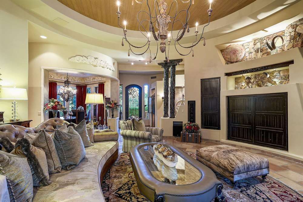 The great room is the heart of the home showcasing a circular design with 20-foot ceilings with wood inlay, stone fireplace with granite hearth and niches, all overlooking the spectacular backyard. This home has so many fine features, too many to list! The perfect blend of modern and hacienda to wow your guests!
