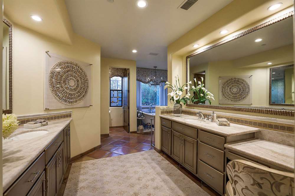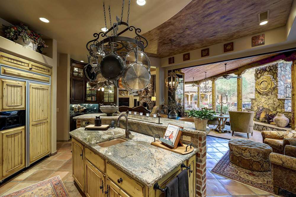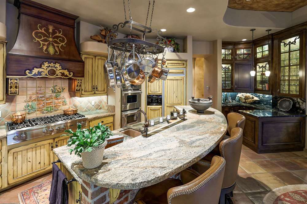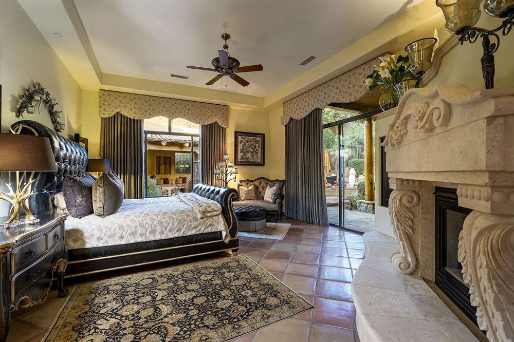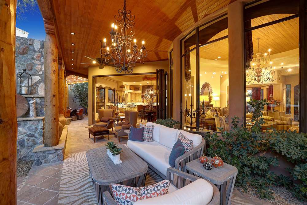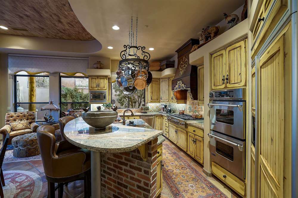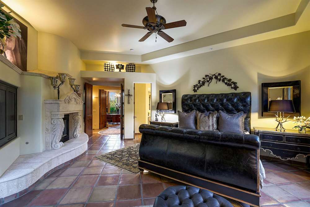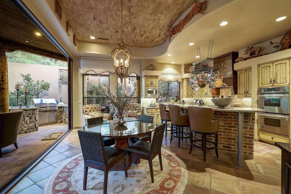 The great room is the heart of the home showcasing a circular design with 20-foot ceilings with wood inlay, stone fireplace with granite hearth and niches, all overlooking the spectacular backyard. This home has so many fine features, too many to list! The perfect blend of modern and hacienda to wow your guests!